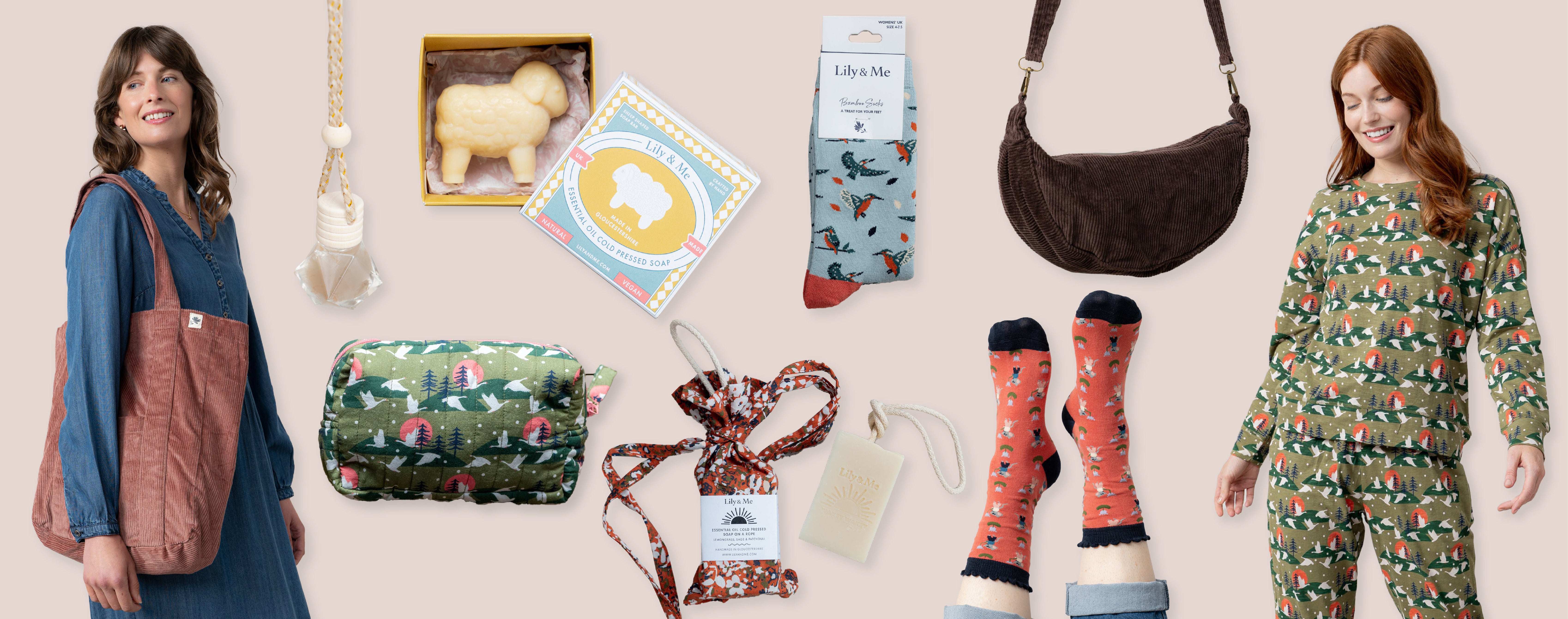 Choose from coordinating multibands, shopper bags to enhance your outfit, silky bamboo socks, pyjamas, cosmetic bags or gifting felt friends.
