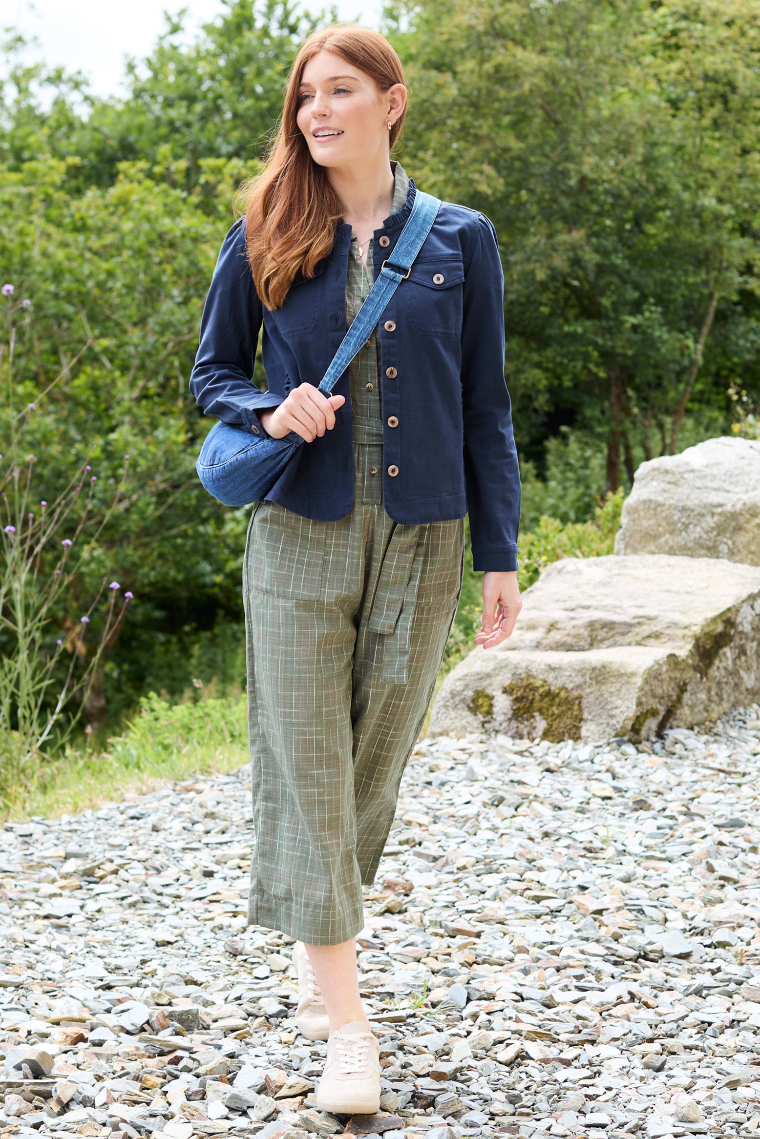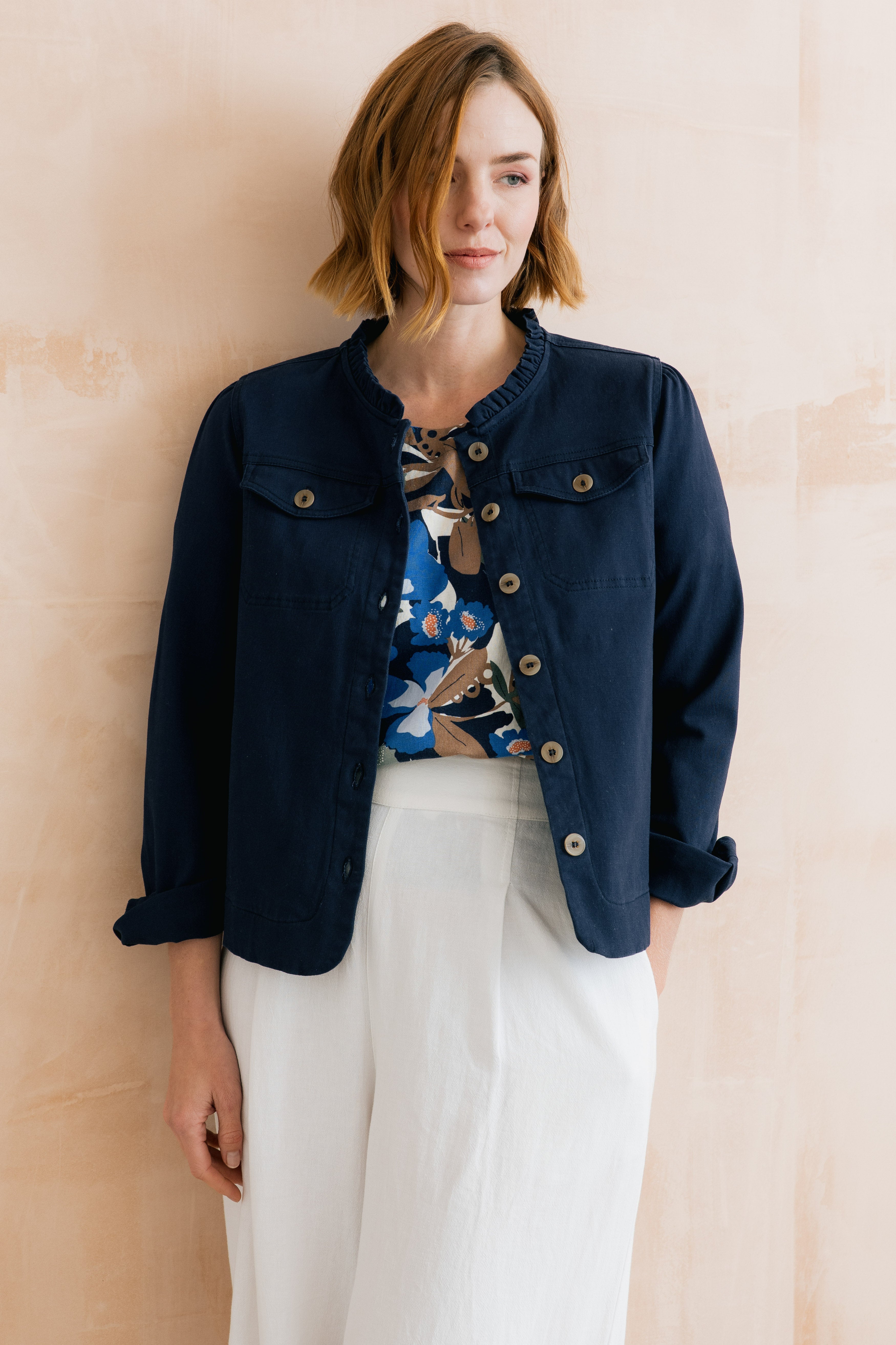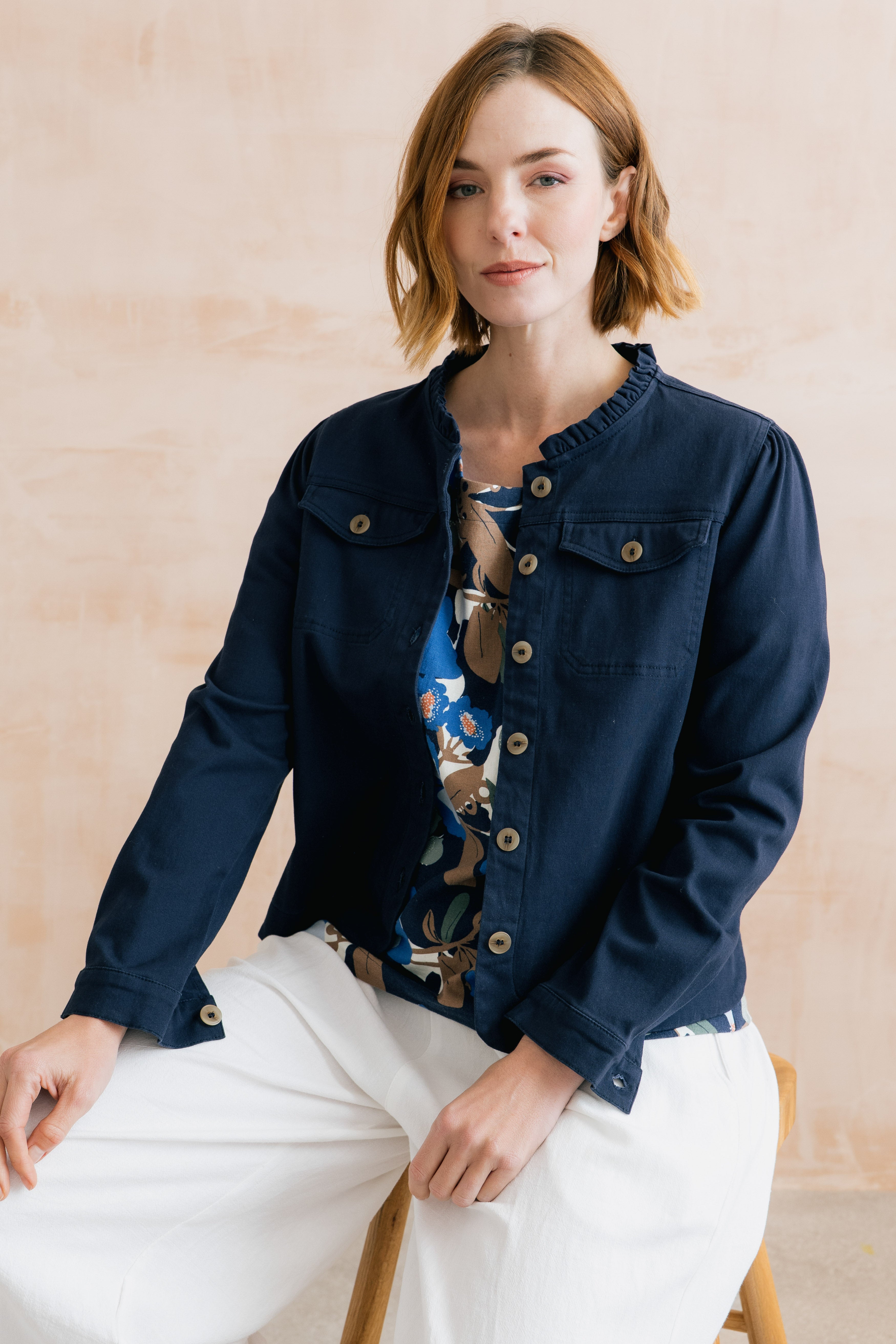 A slightly neater fit jacket, the Seren has a pretty scalloped collar, scalloped detailing at the side pockets and front patch pockets. Made from the perfect weight stretch cotton twill, layer over your favourite outfit to add texture, interest and all important style points!
