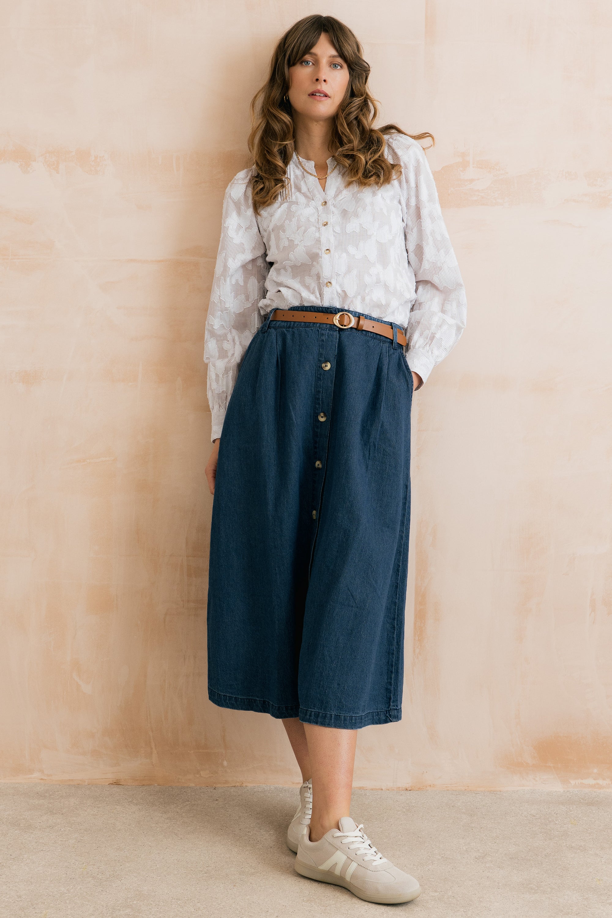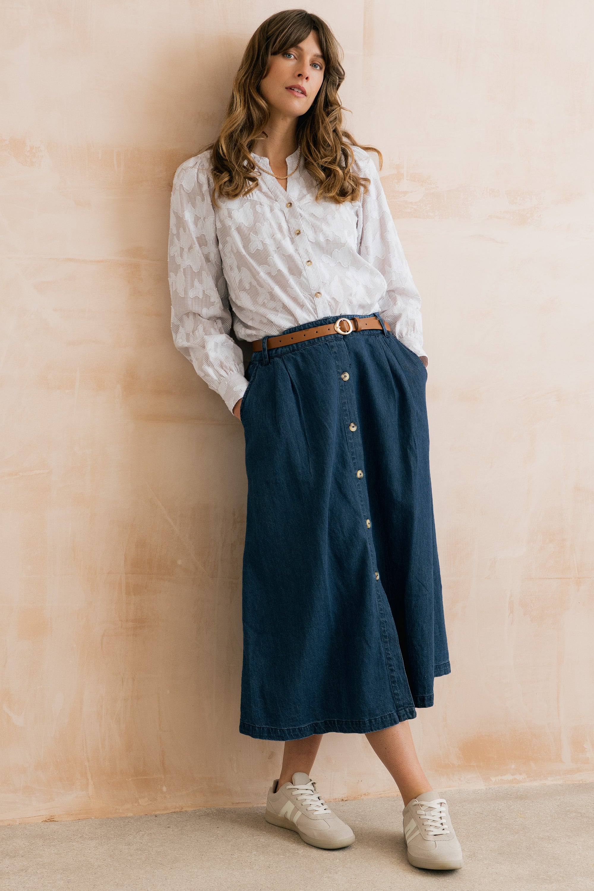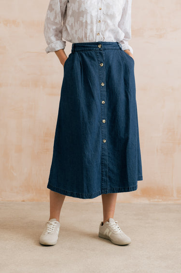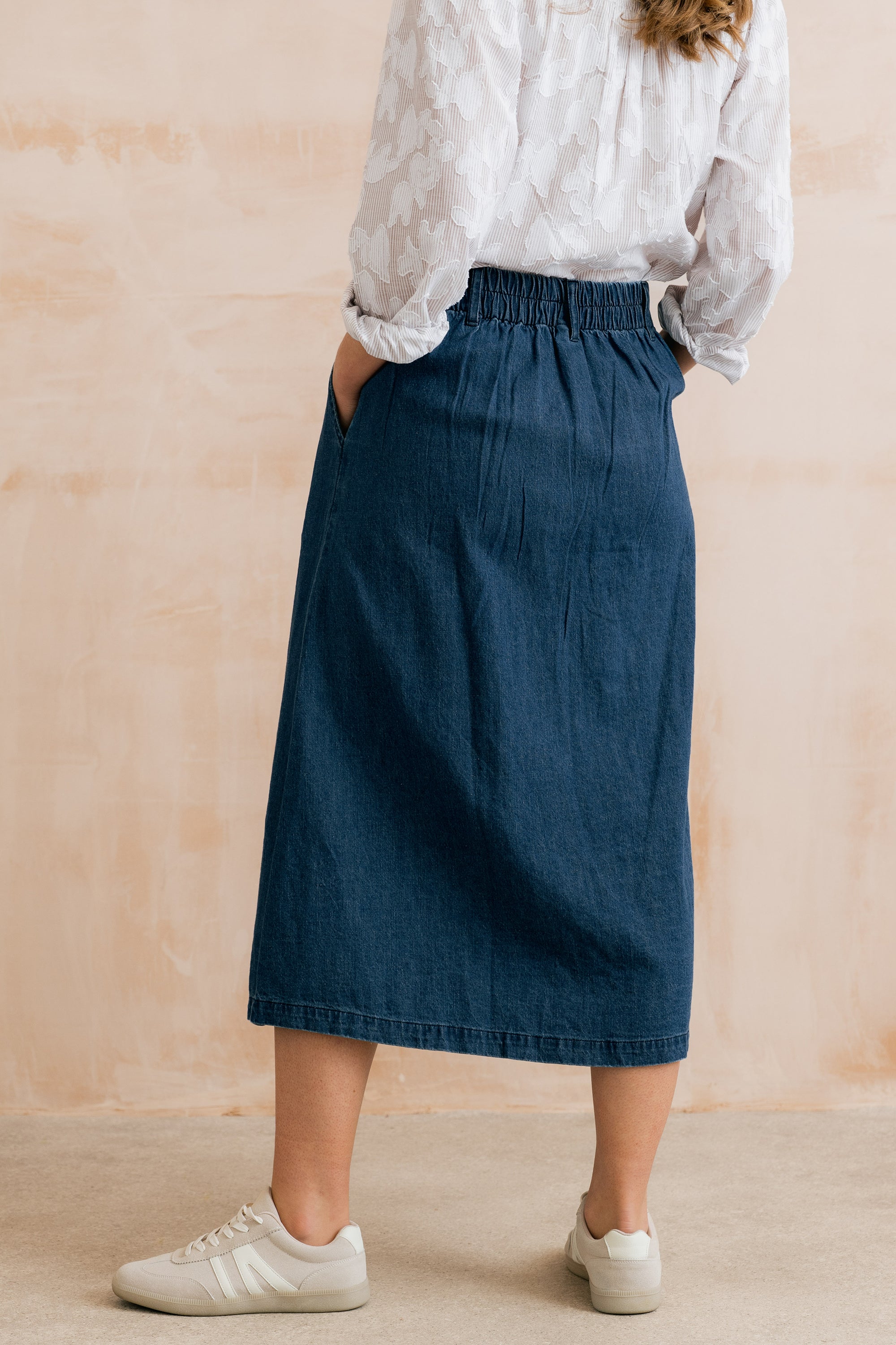 With an elasticated back waist, belt loops and button through front, the Holly Skirt is a fabulous cross seasonal piece. Wear early with boots and knitwear or later in the season with sandals.