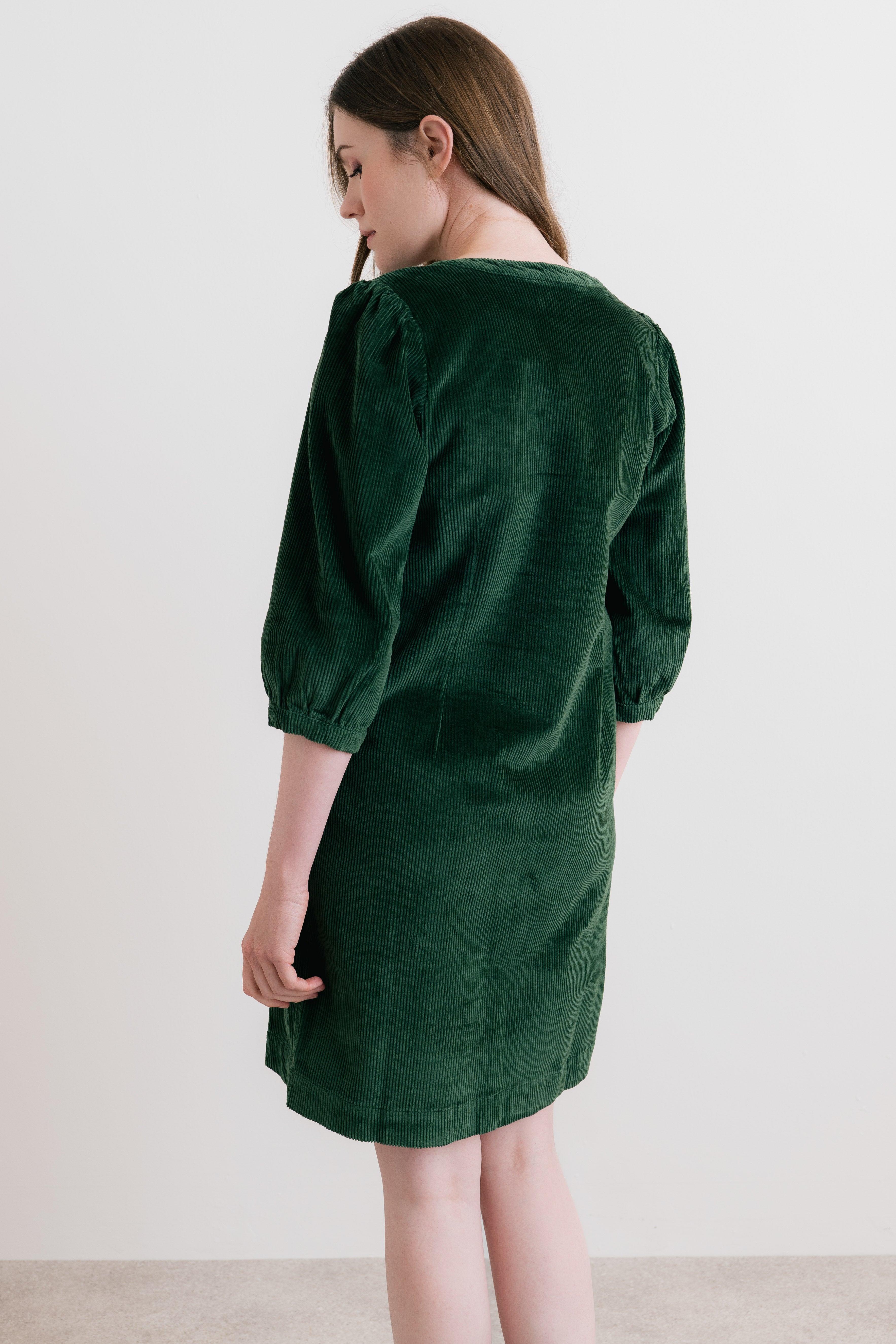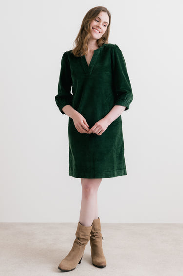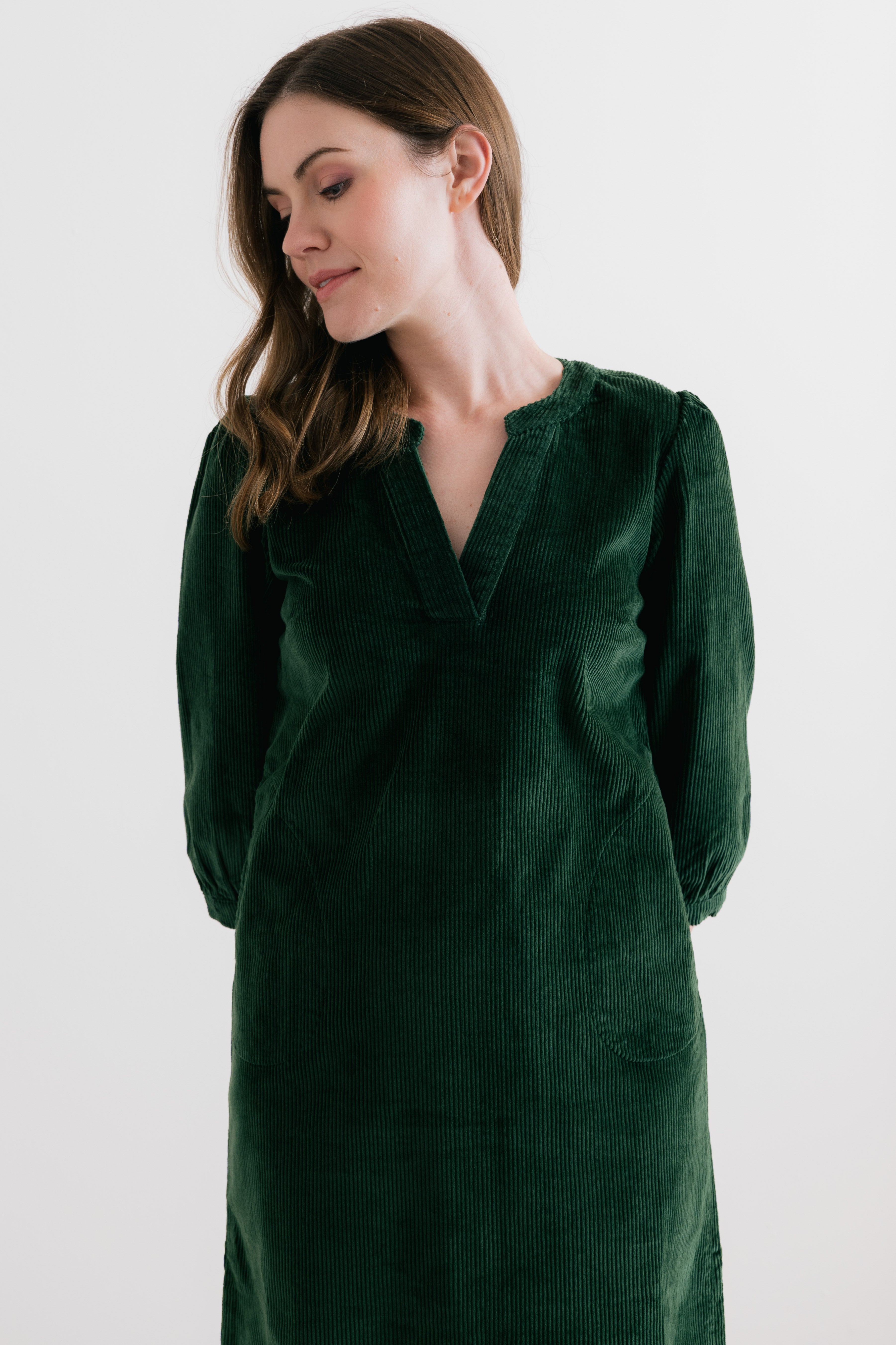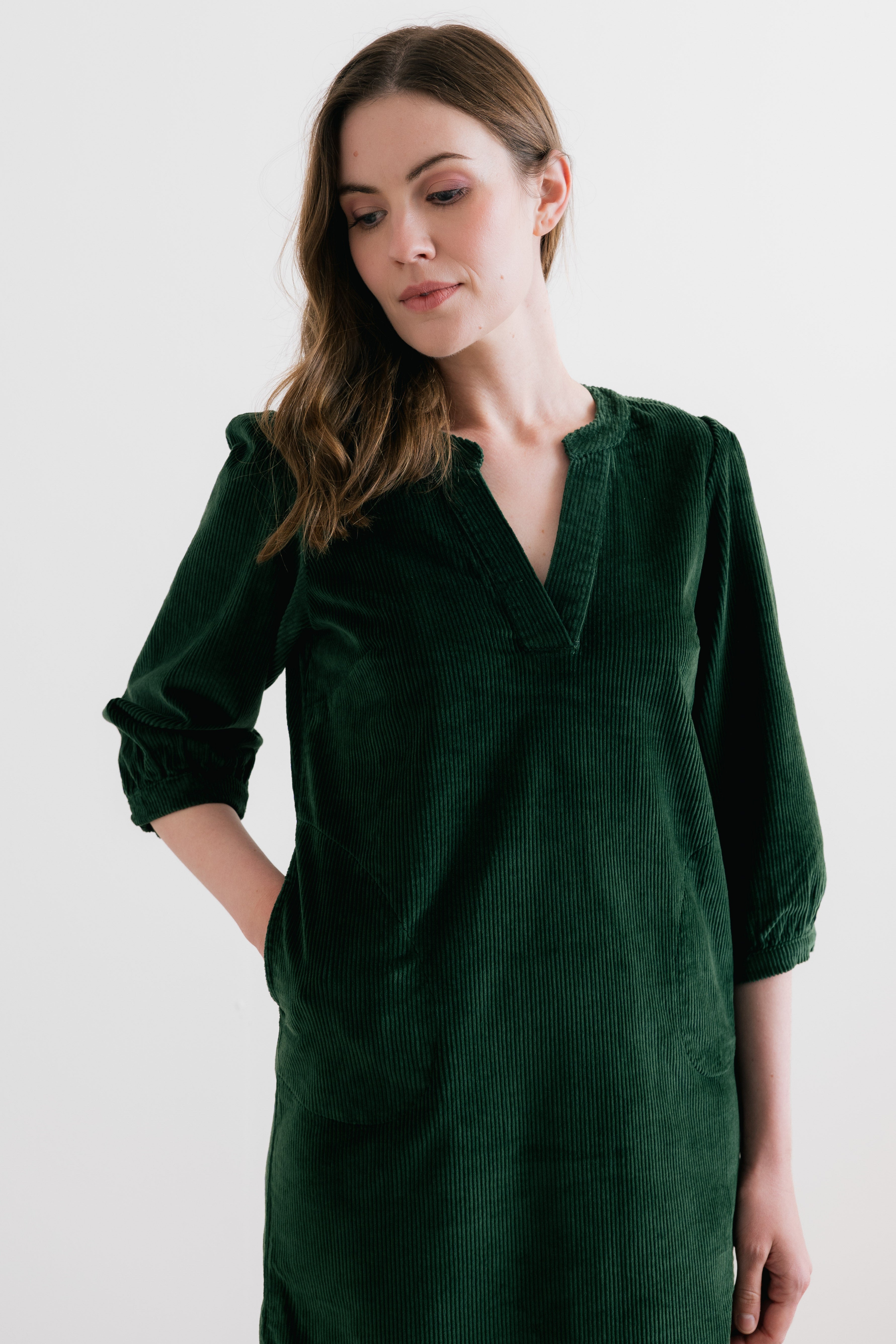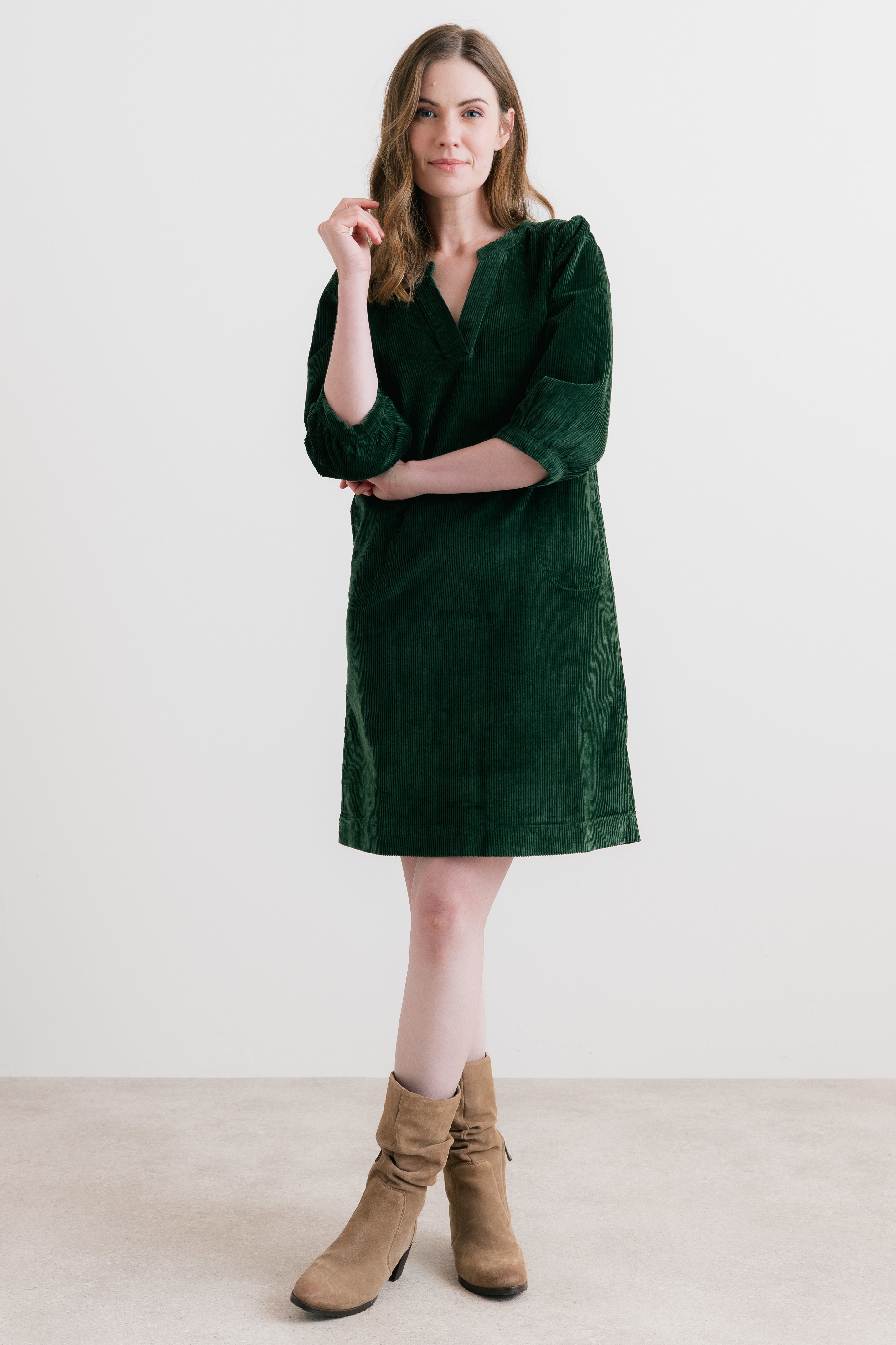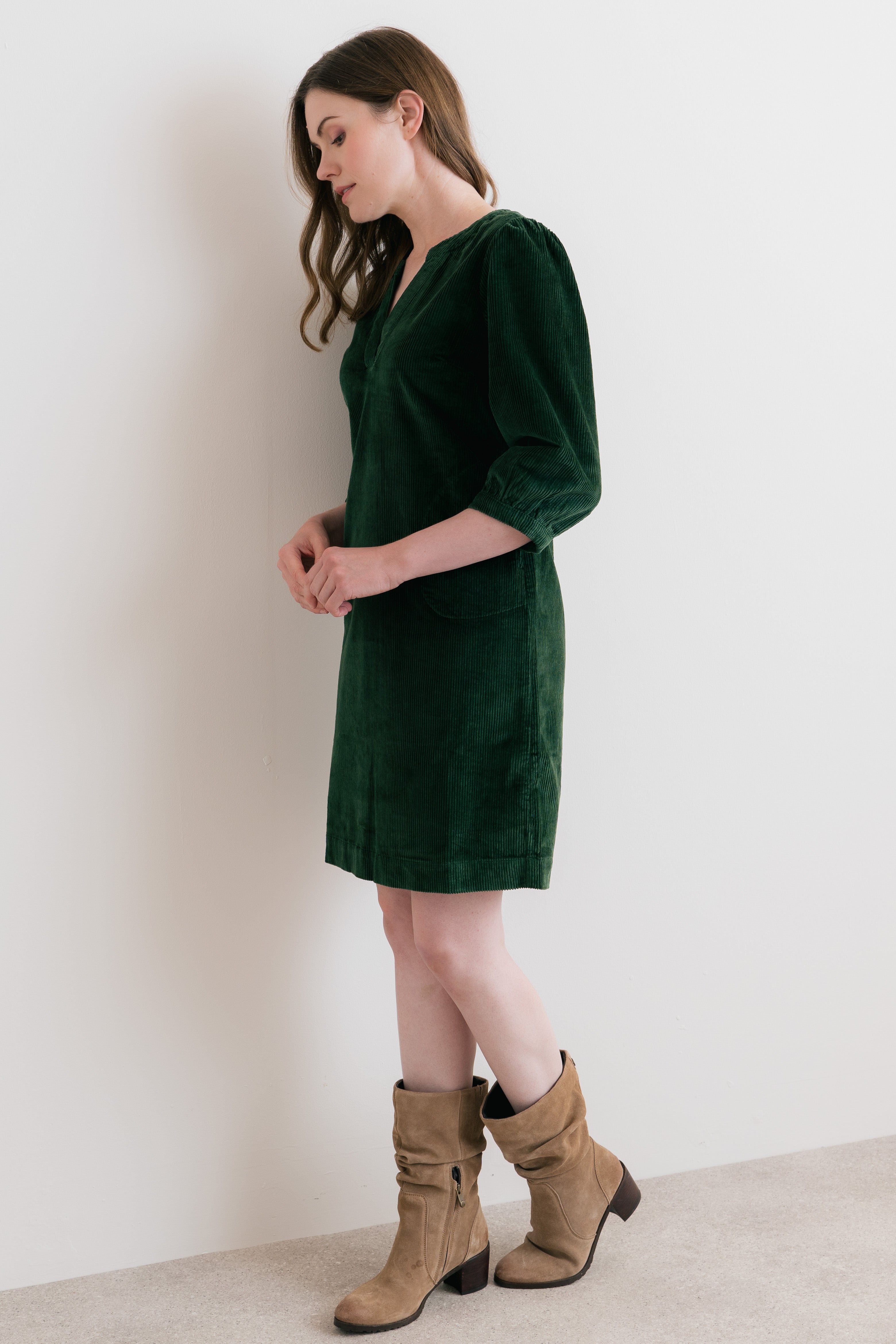 New this season, the Harvest Dress is an easy wearing shift shape. Made from soft, tactile jumbo cord with a touch of elastane to give stretch to the fabric for a more comfortable fit. With a mandarin collar, flattering notch neckline and three quarter sleeves.