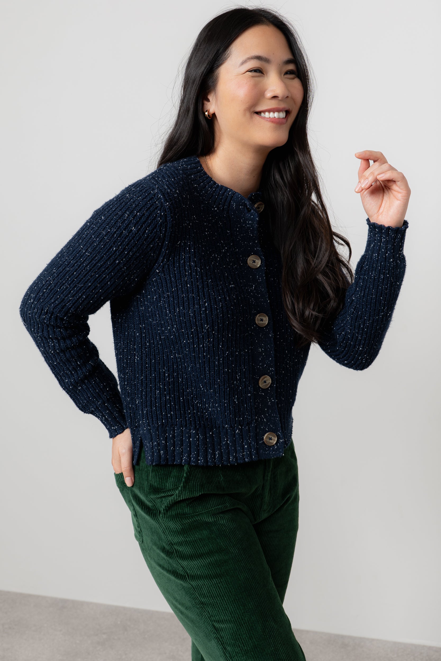 The June is a cotton-rich knitted cardigan available in a variety of colourways. Woven from a flecked ‘neppy’ yarn giving it a beautifully soft level of colour.