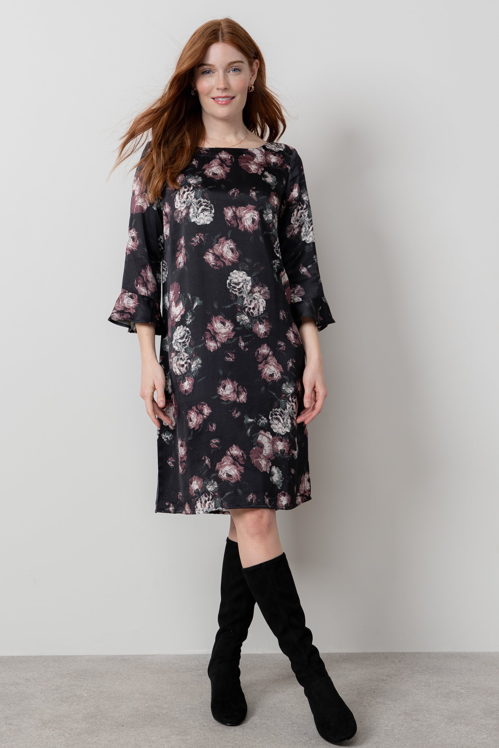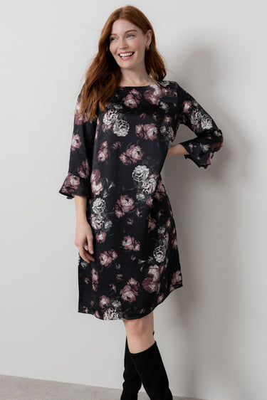 The Lotty is a stylish shift dress with statement fluted sleeves. The perfect choice if you prefer dresses a little looser, it has a soft drape, skimming the body beautifully.