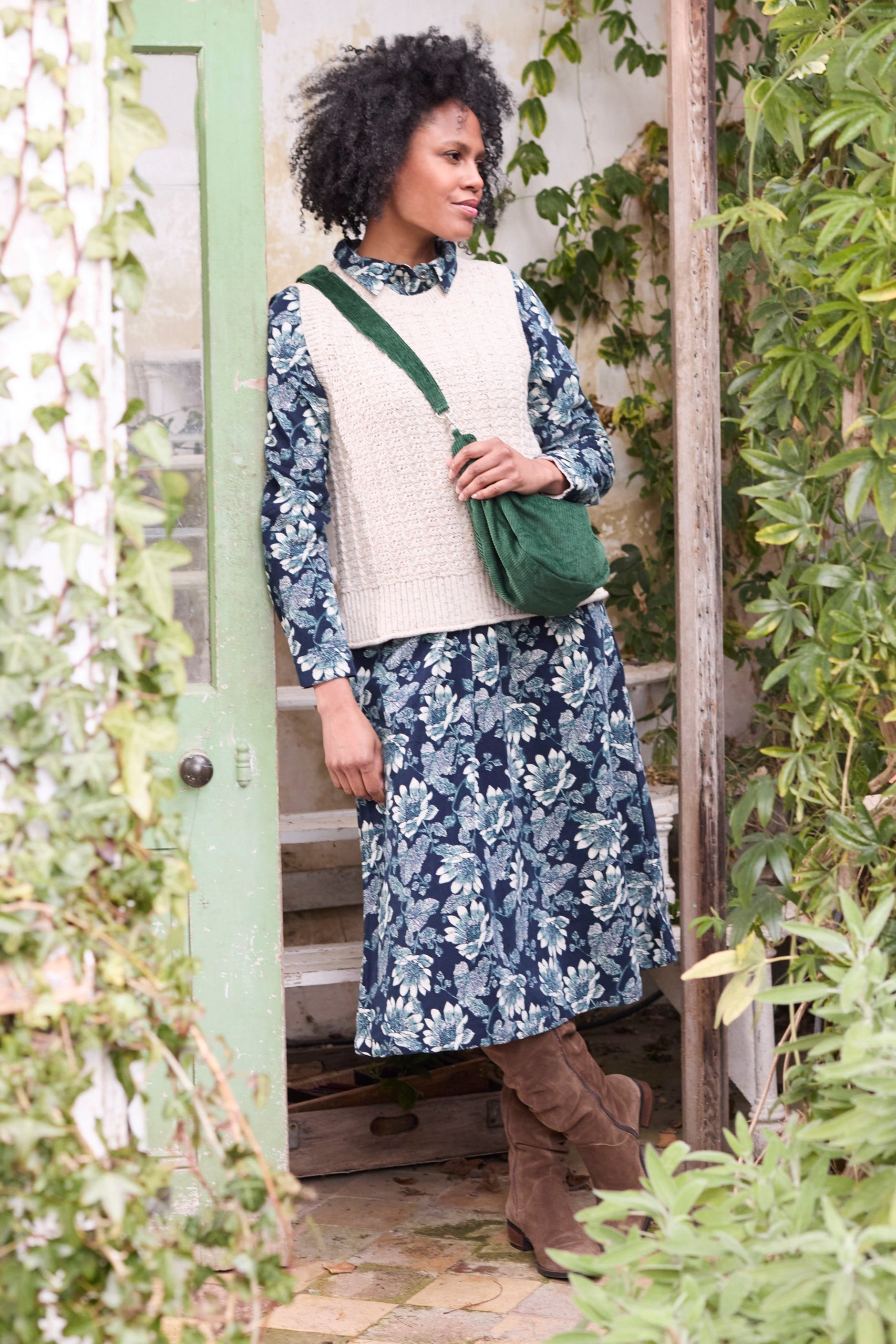 Made from soft and drapey cotton pincord, with a bespoke mono bloom print. Wear with trainers on warmer days or layer with tights, boots and a knit come the winter months.