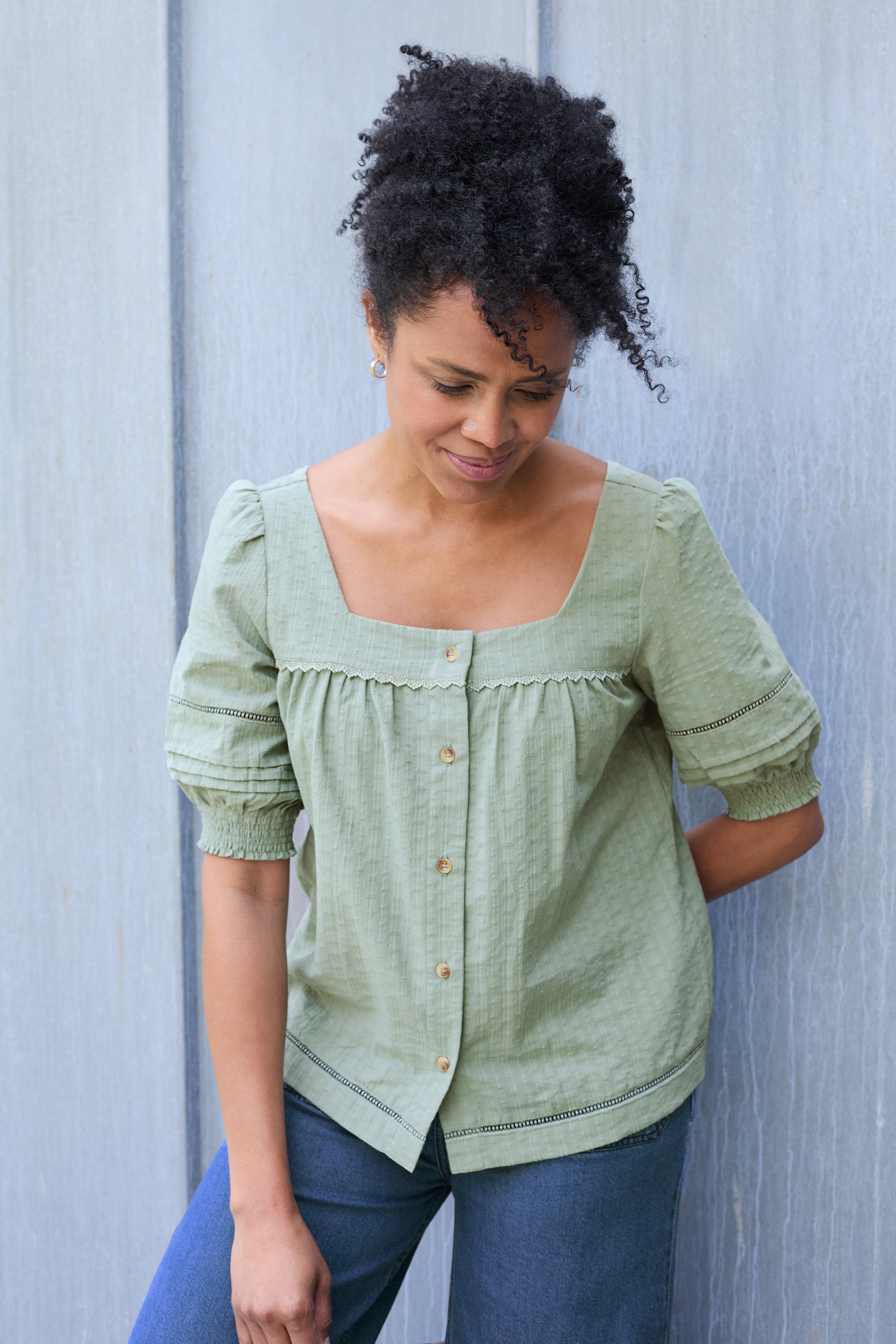 A squared neckline with gather at the bust to allow the fabric to skim over the body. 3/4 length puff sleeves with gathering at the shoulders and shirring at the cuffs. Wear with linen trousers for an elegant summer look.
