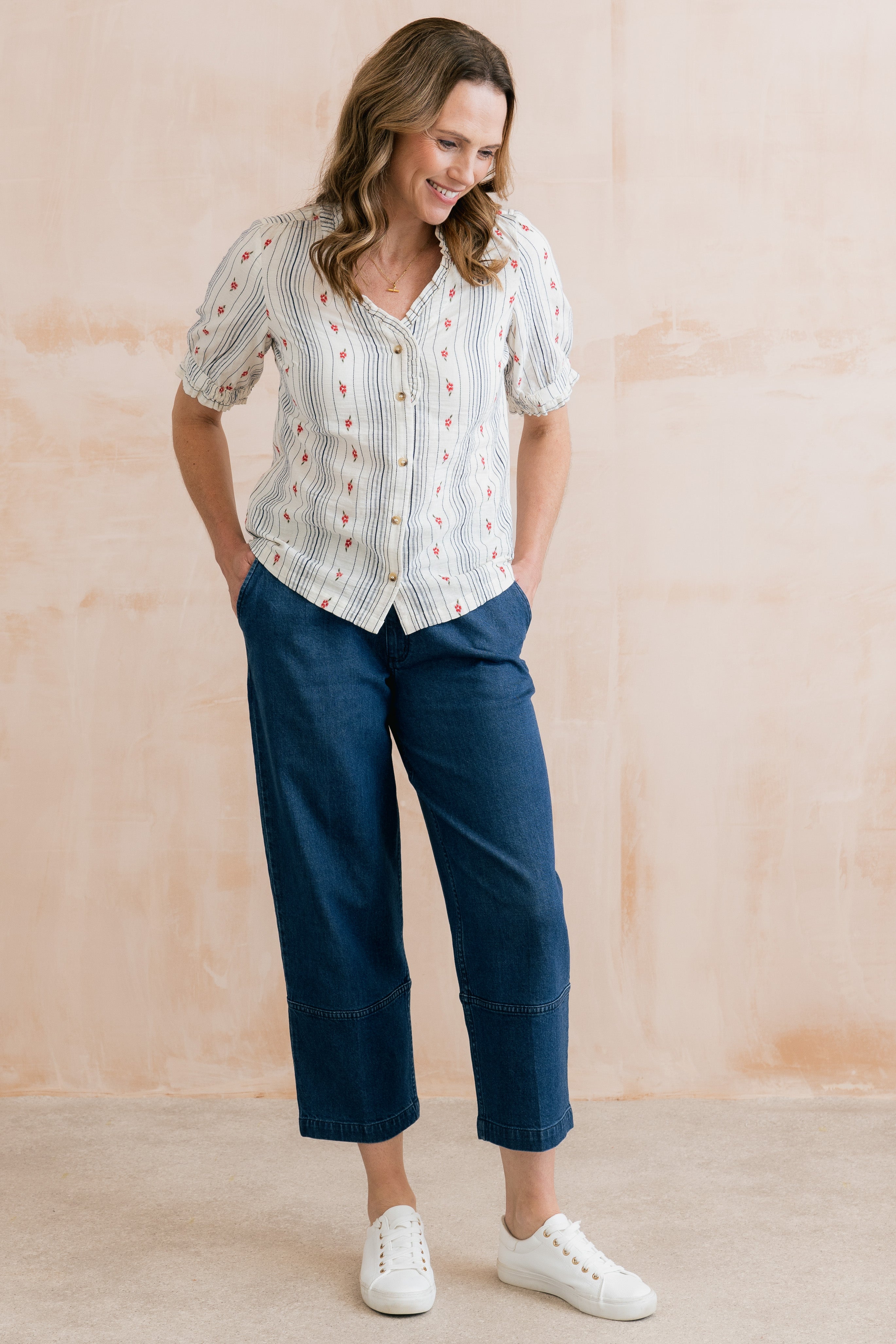 Femininity is at the forefront of our Wren Frill Blouse. Made from a beautiful embroidered floral stripe cotton, with a scalloped collar and neckline, delicate gathering at the back yoke seam and a full button-down front.