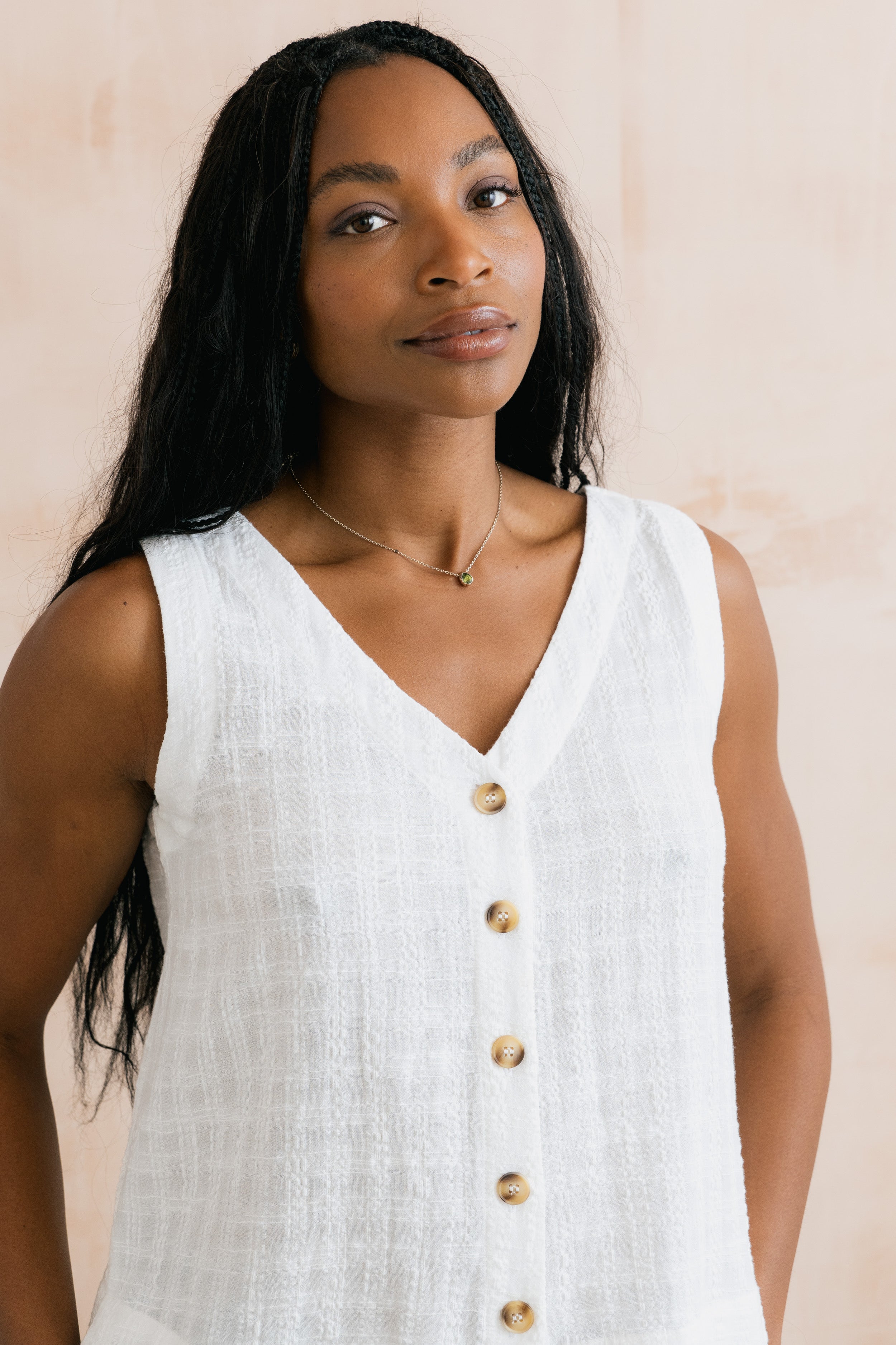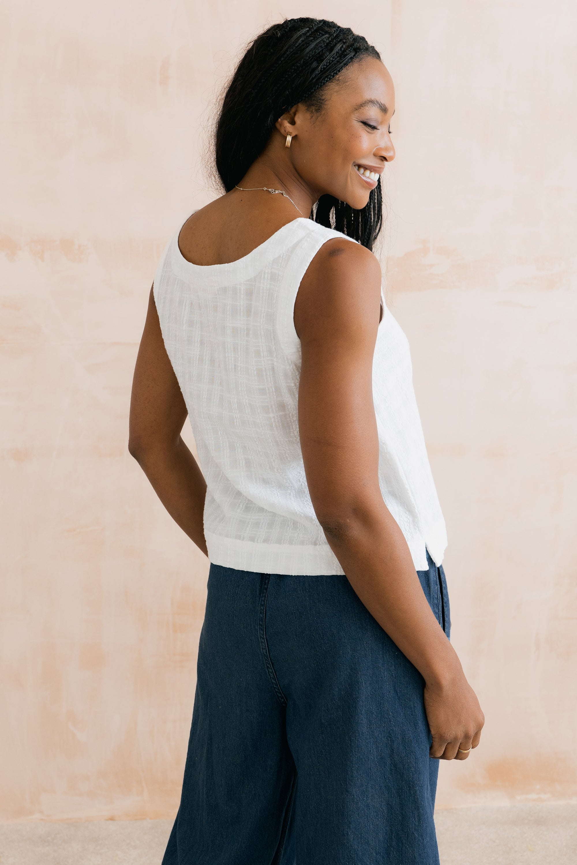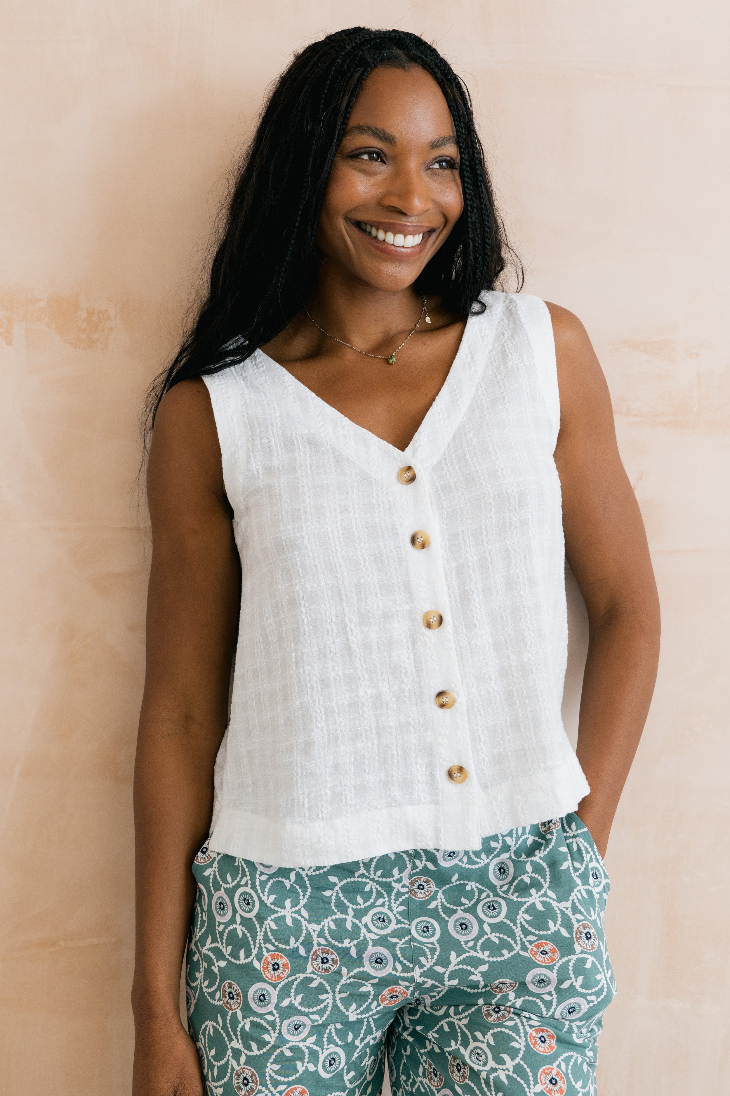 Our best-selling Allium Buttoned Vest is back for another season. A modern spin on a classic vest, with a V-neckline and button-through detail. Made from textured organic cotton blended with viscose, creating a soft and breathable, summer-weight seersucker fabric.
