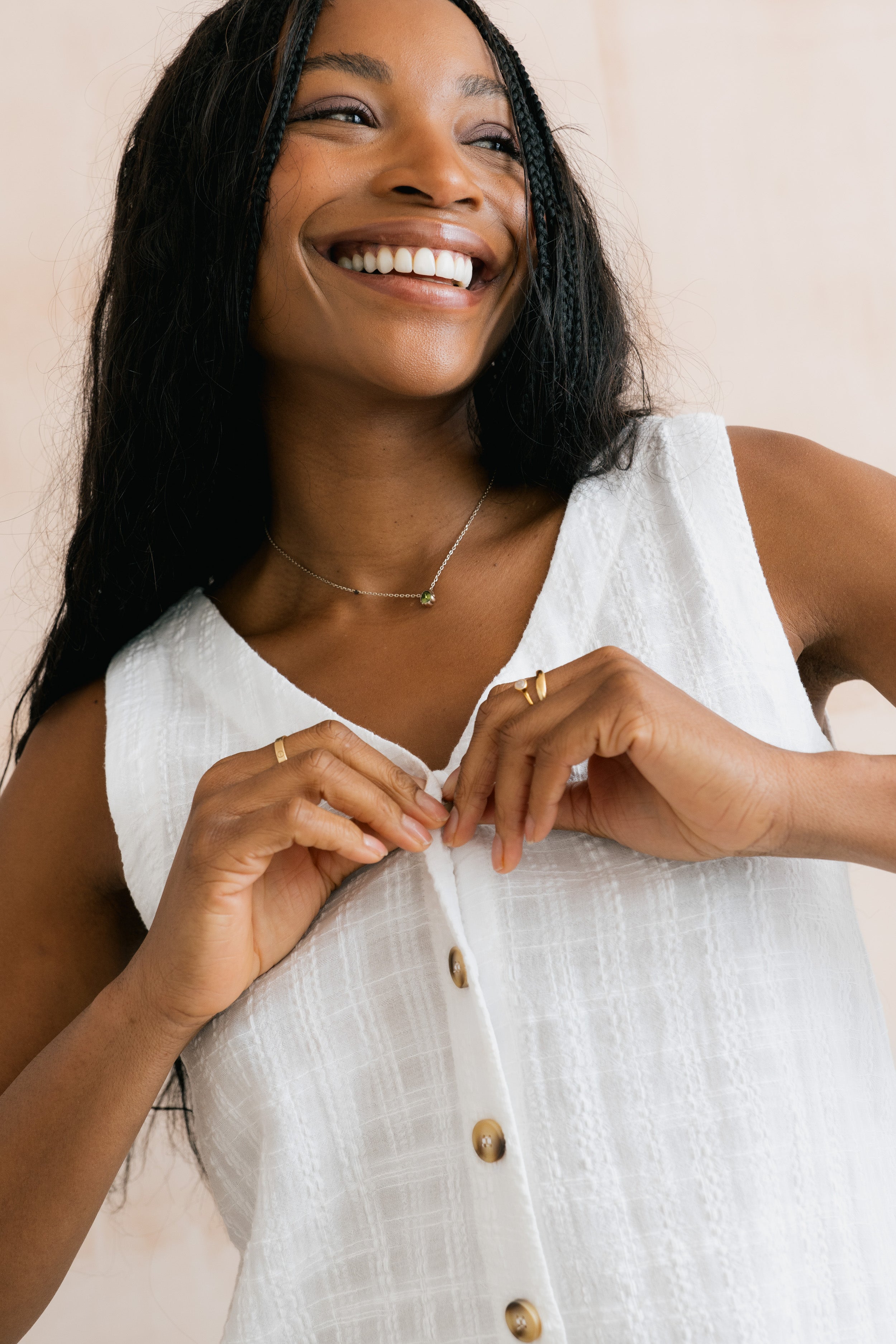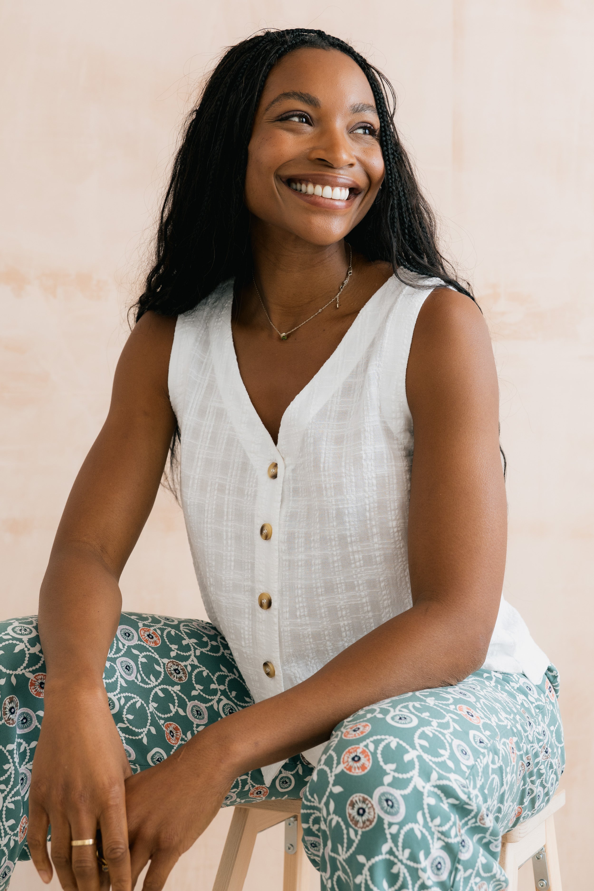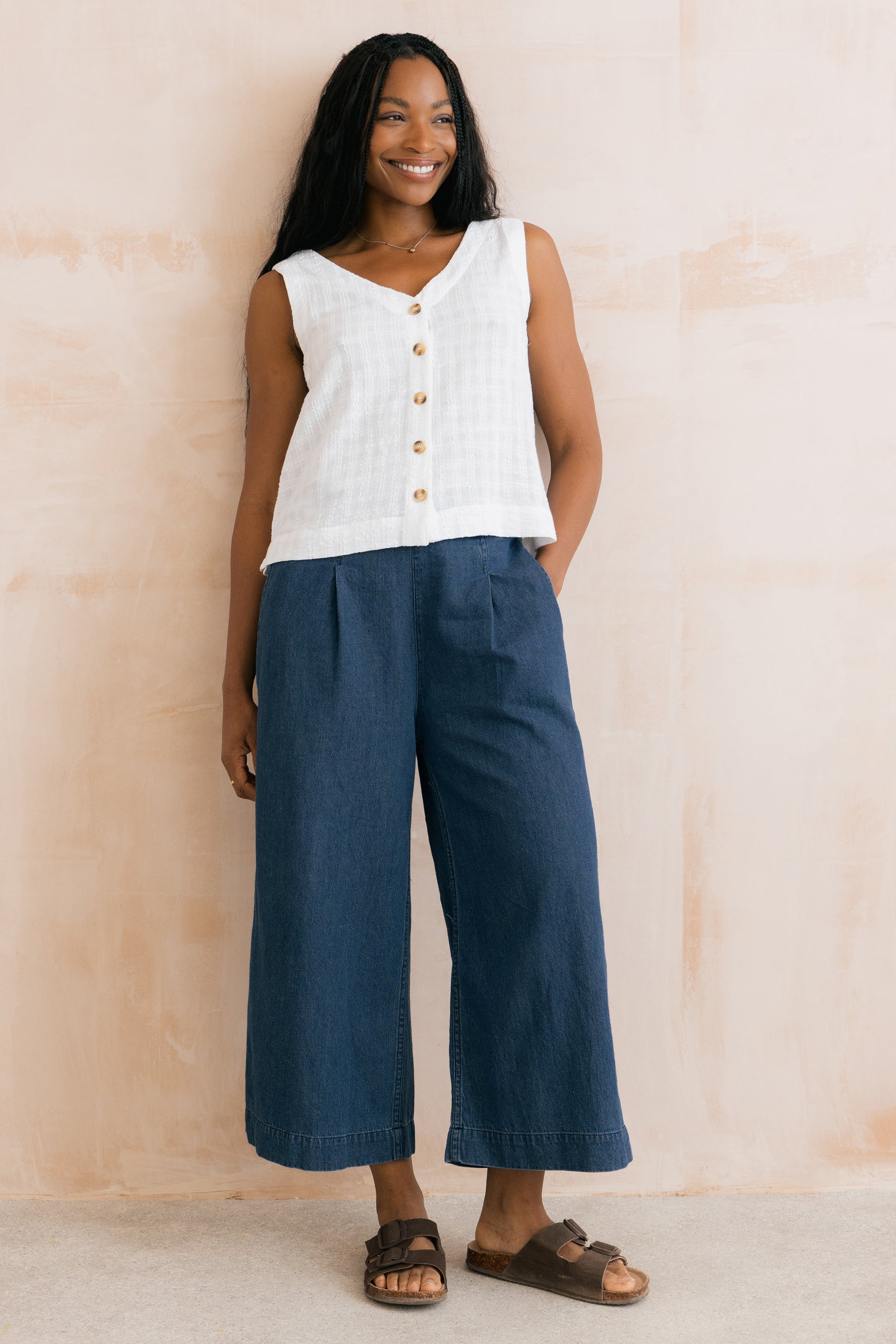 Our best-selling Allium Buttoned Vest is back for another season. A modern spin on a classic vest, with a V-neckline and button-through detail. Made from textured organic cotton blended with viscose, creating a soft and breathable, summer-weight seersucker fabric.