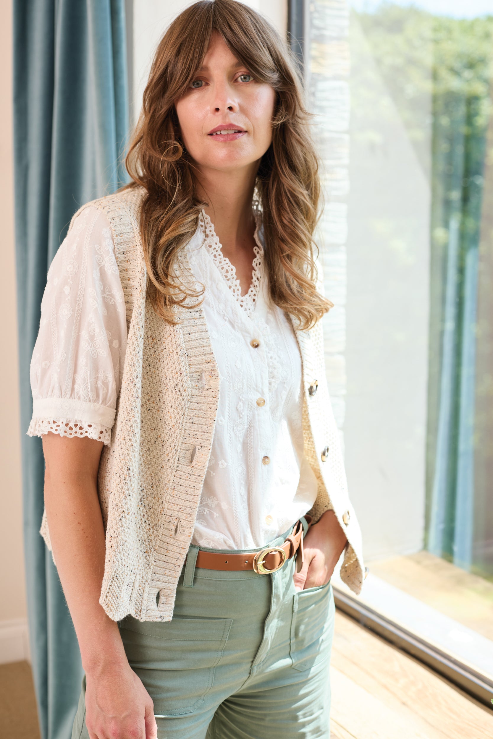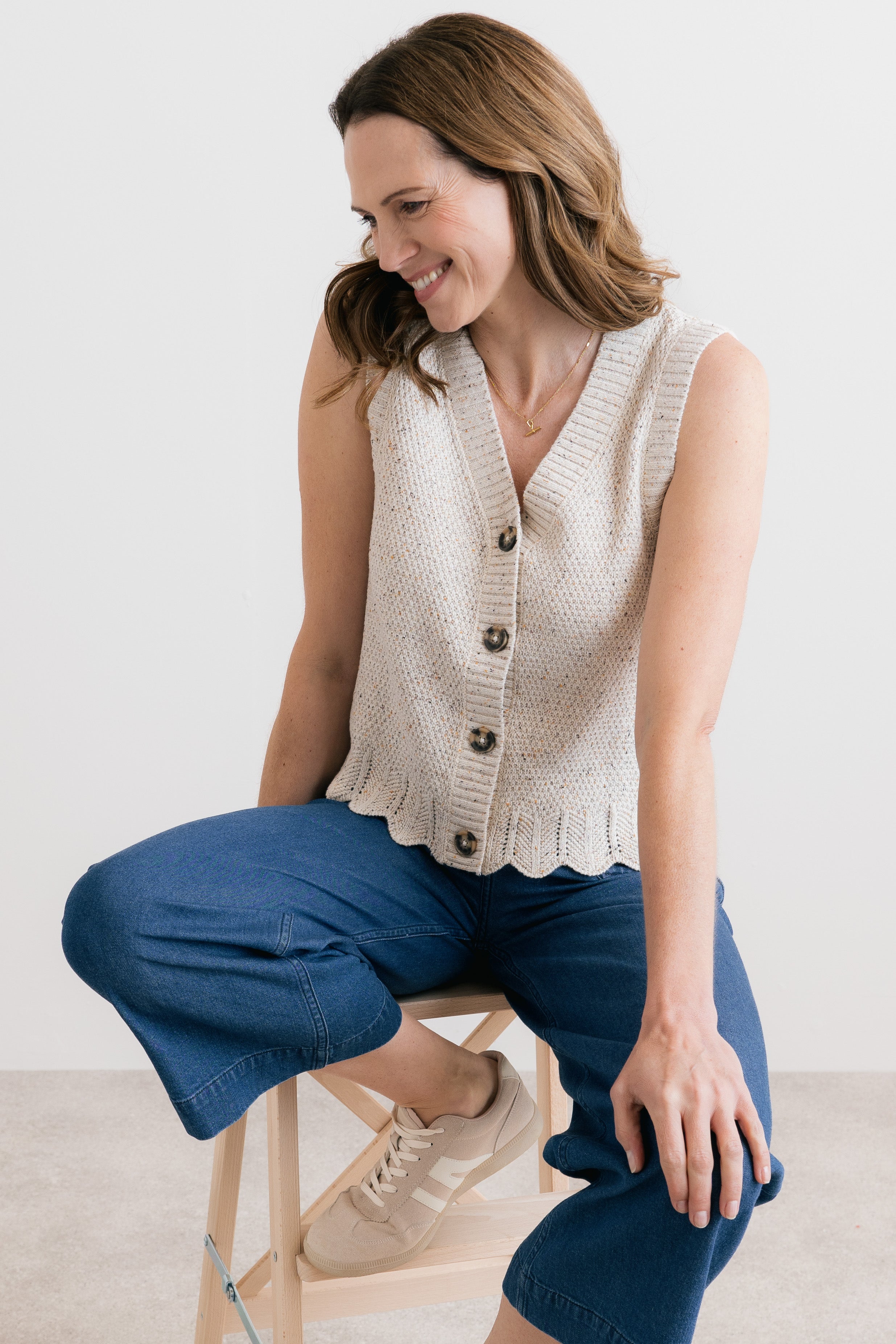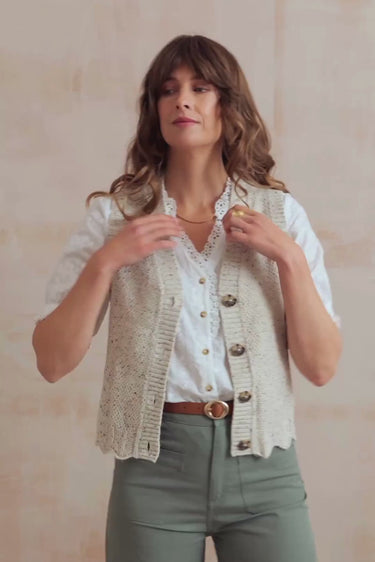 The perfect layering piece, for an instant style update! A cotton rich yarn, the flecked ‘neppy’ ecru gives a beautifully soft level of colour. Designed with a v-neckline, textured knit detailing and a scalloped hem.