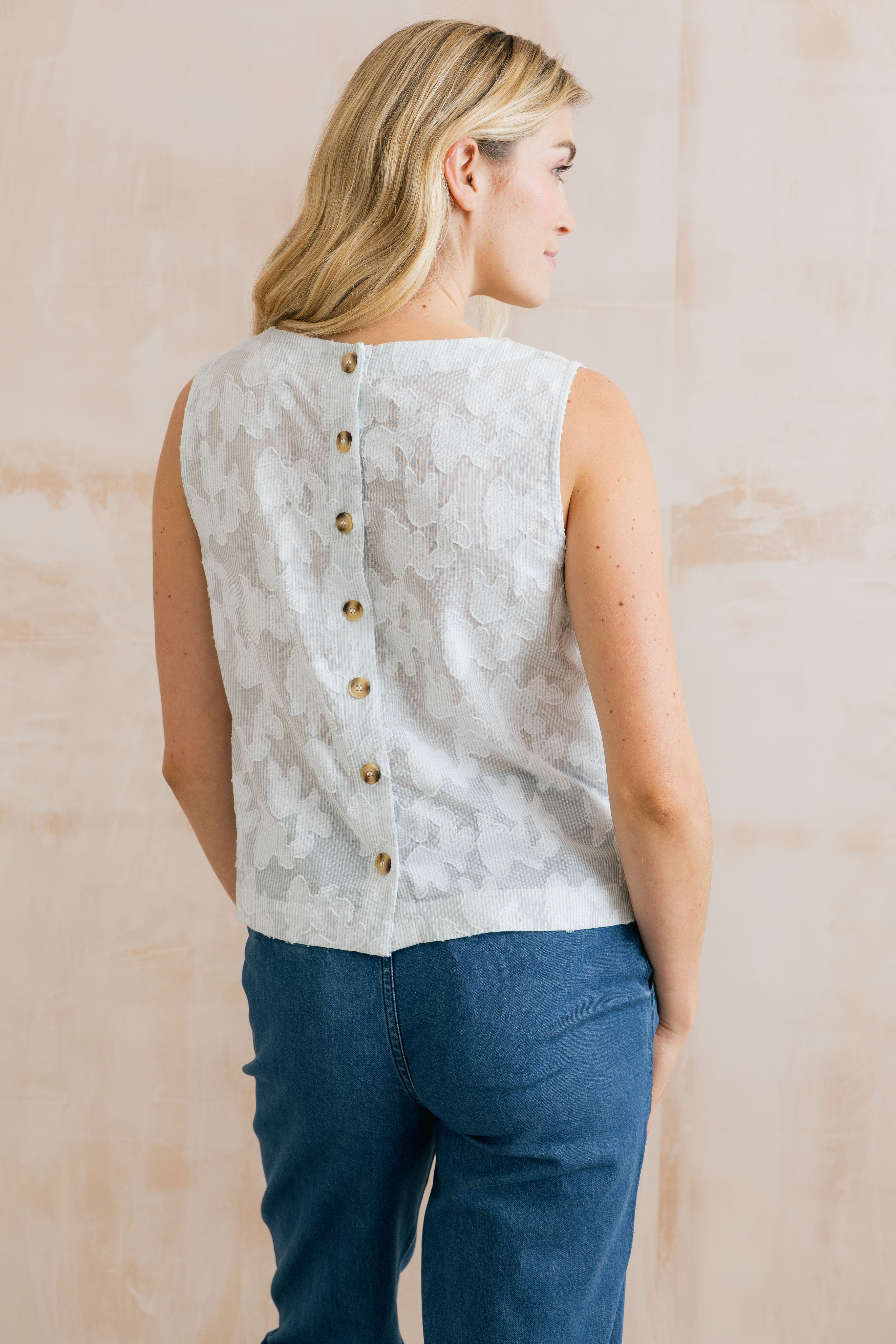 The simple styling of the cotton Cora vest brings the textured jacquard to the fore. A full-back placket with mock horn buttons adds understated elegance.