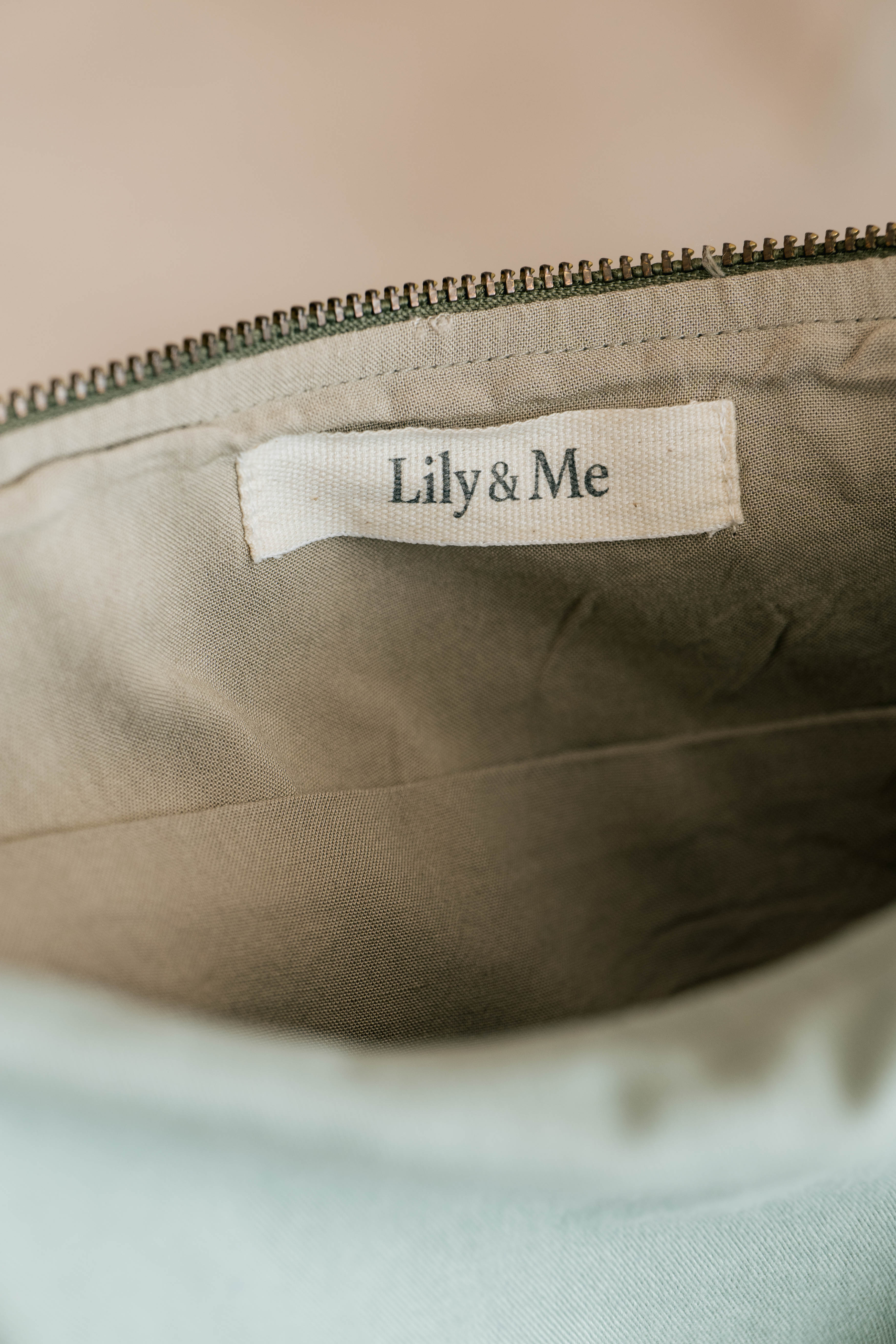 Soft, textured stretch cotton fabric with a zip fastening and finished with an adjustable strap and antique brass fixings.