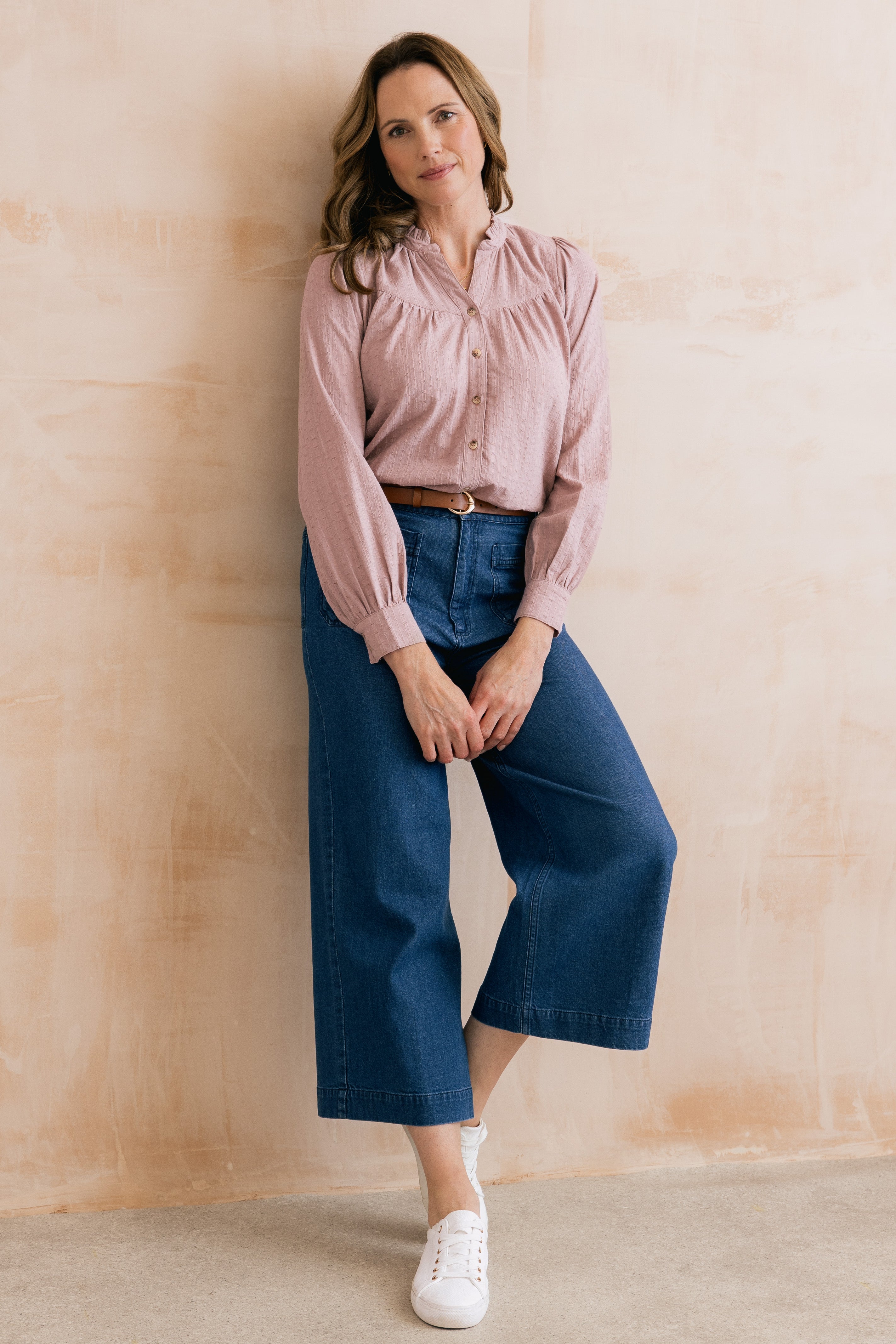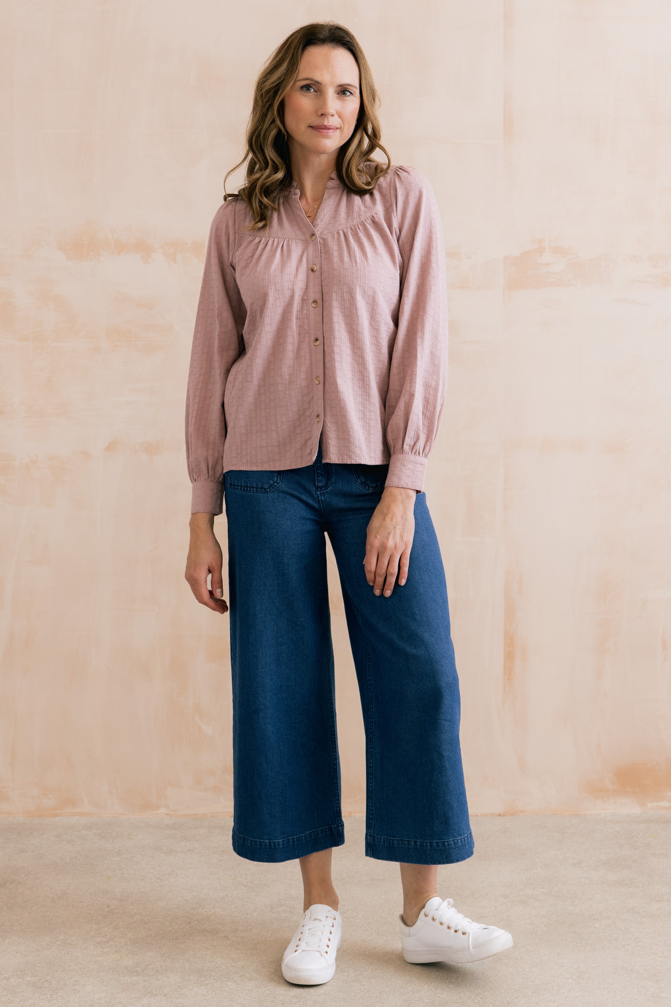 Woven organic cotton with a self stripe and pointelle detailing, the Wayfaring adds texture and interest to any outfit. Style with your favourite trousers or skirt and layer under a tank, knitwear, or one of our cord gilets.