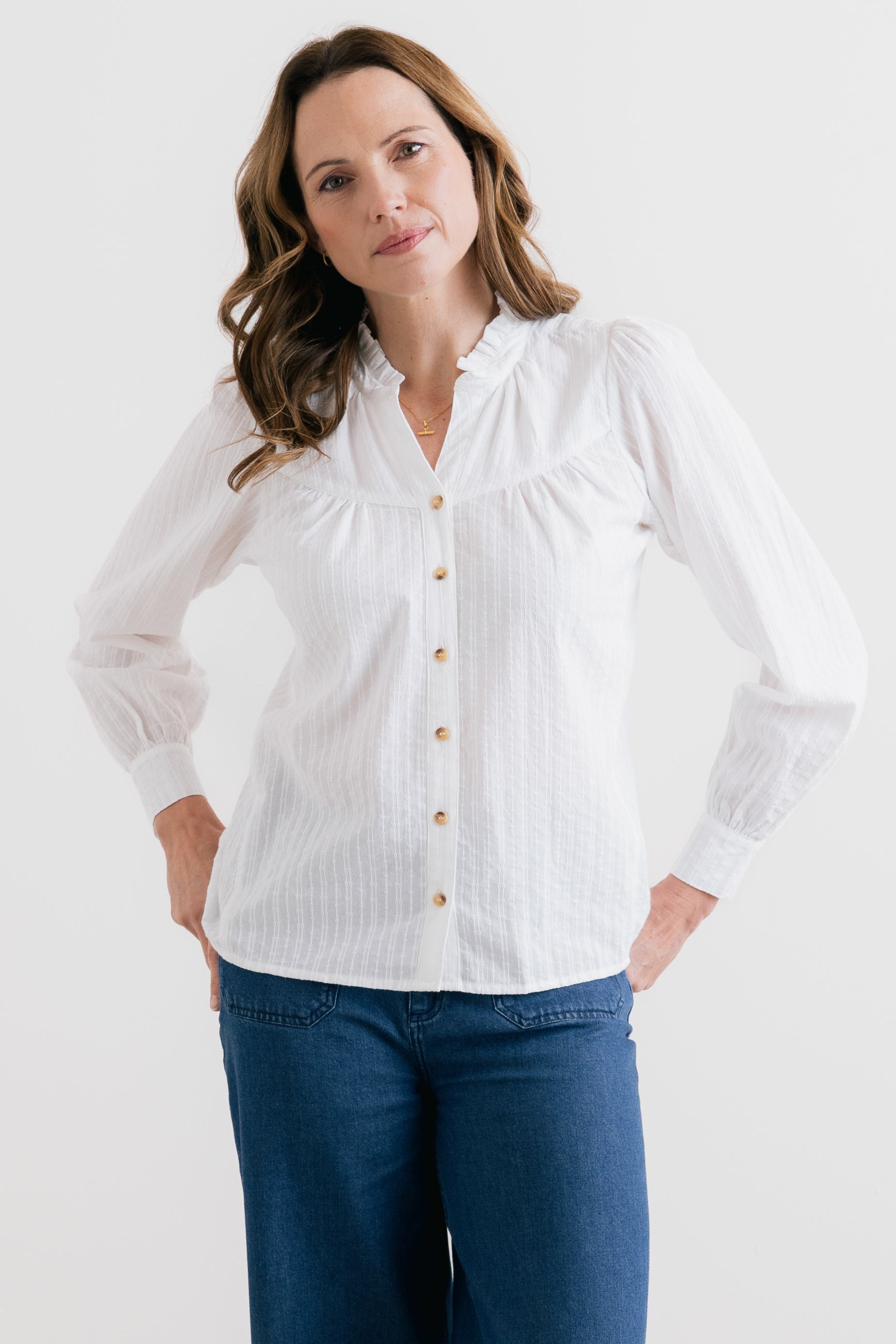 A pretty, feminine take on a classic shirt. The Wayfaring in sustainable organic cotton, has a relaxed shape with a scalloped mandarin collar, v-neckline and delicate gather from the front and back yoke seams.