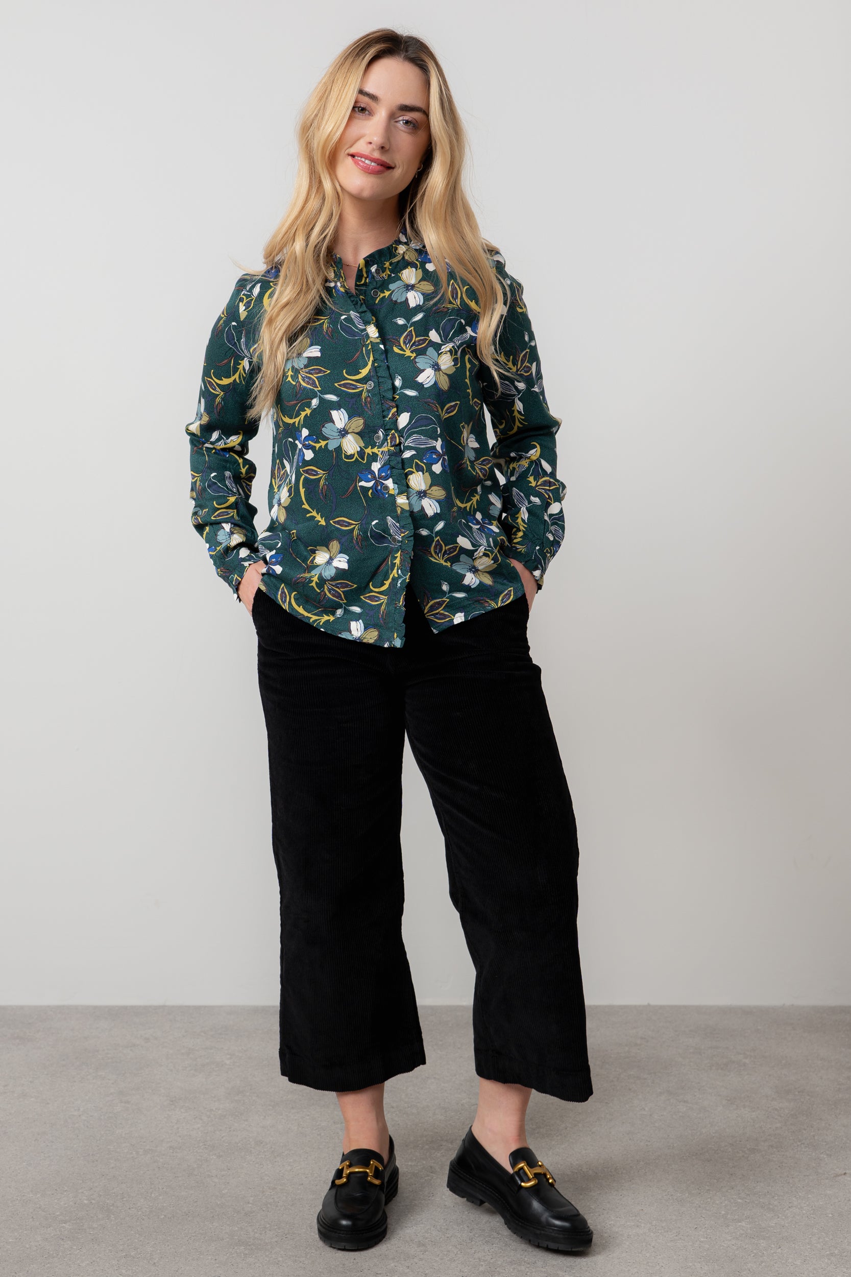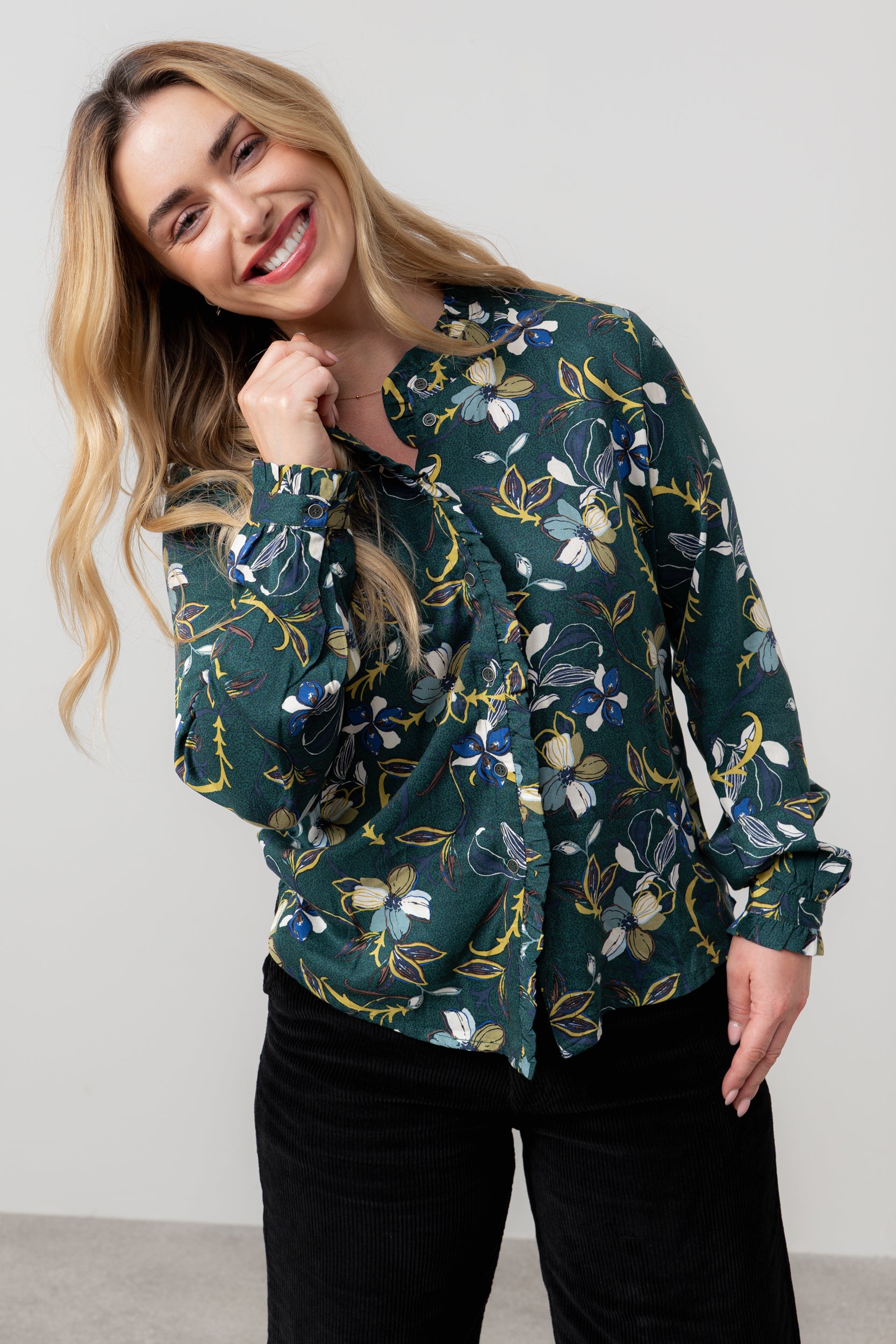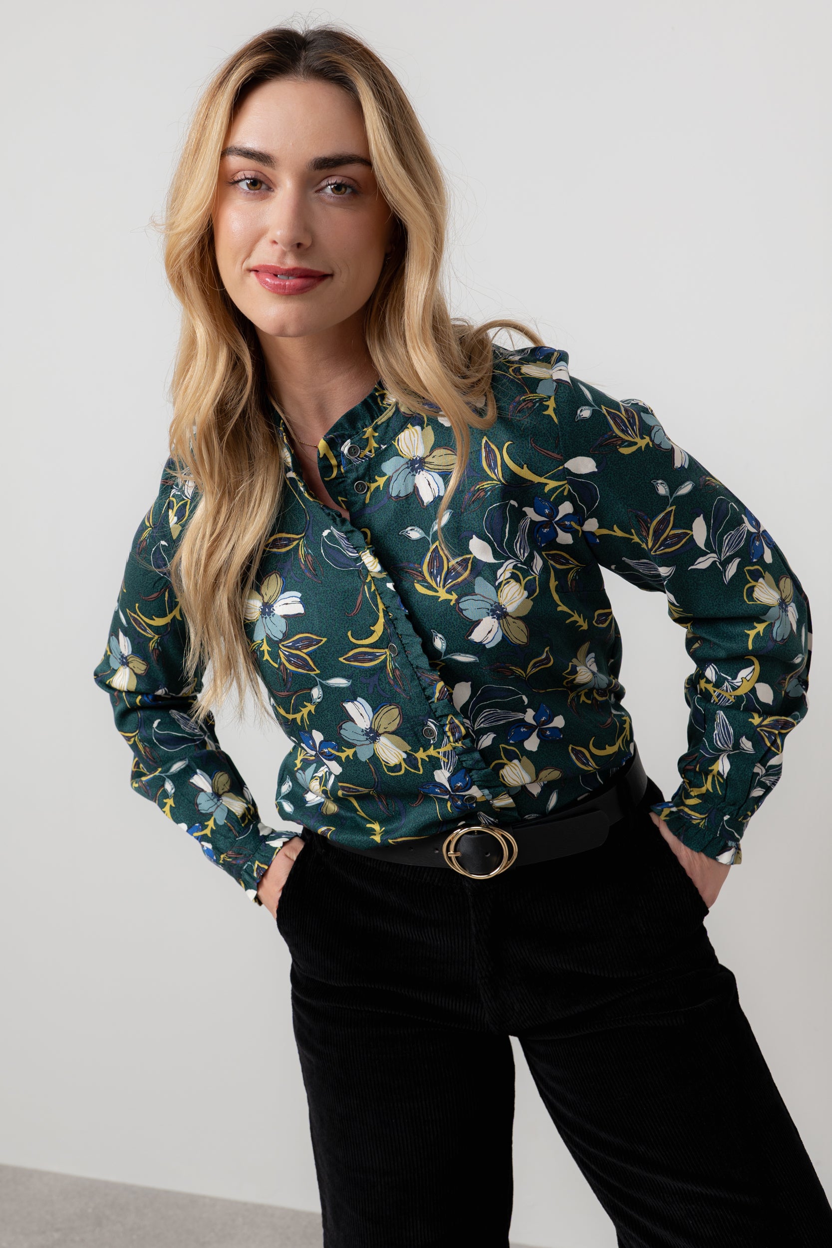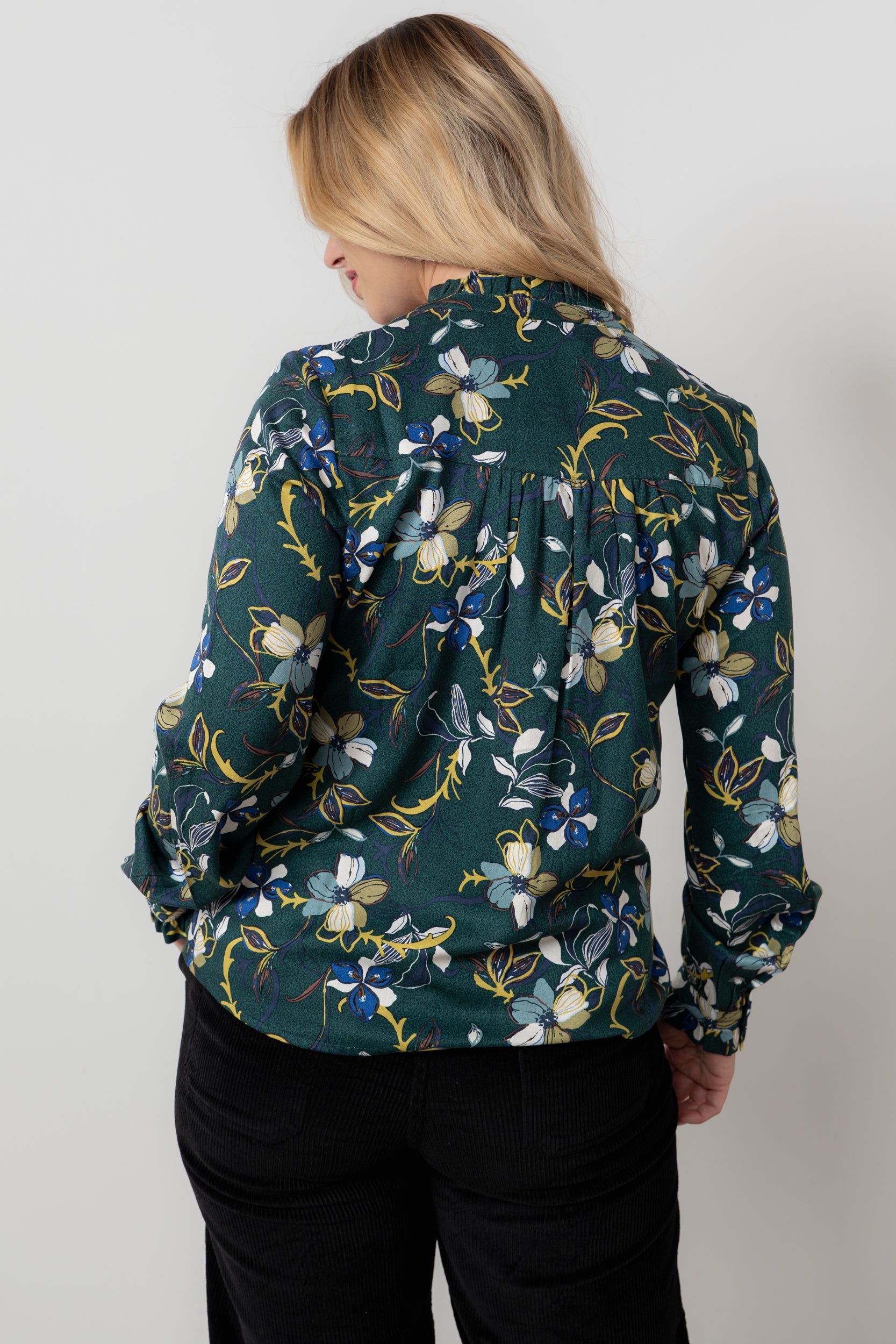 With a bespoke print and made from sustainable Ecovero™ Viscose, offering a beautiful drape. Pair with your favourite trousers or skirt and layer under a jumper or knitted tank to show off the collar!
