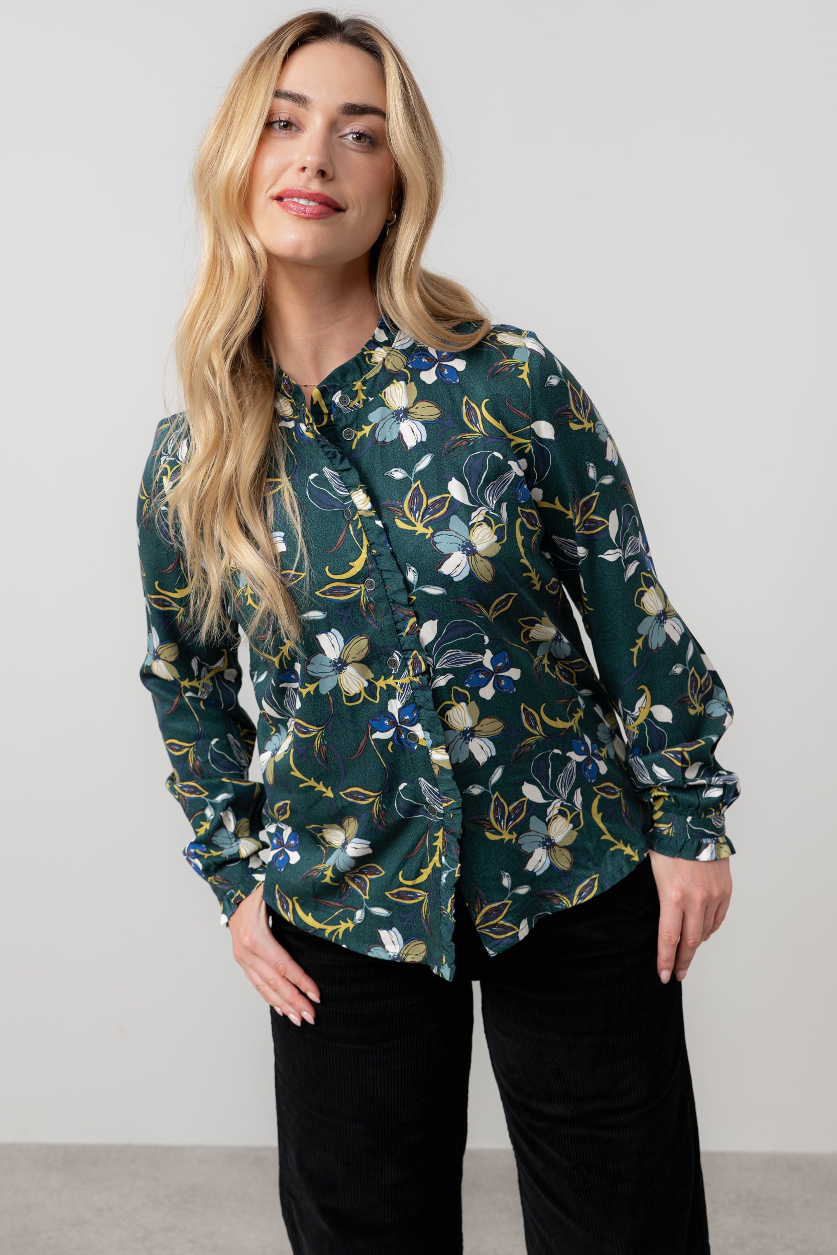 The Sage Blouse has femininity at the forefront, with a scalloped edge mandarin collar and scalloped detailing along the button placket edge and cuffs.