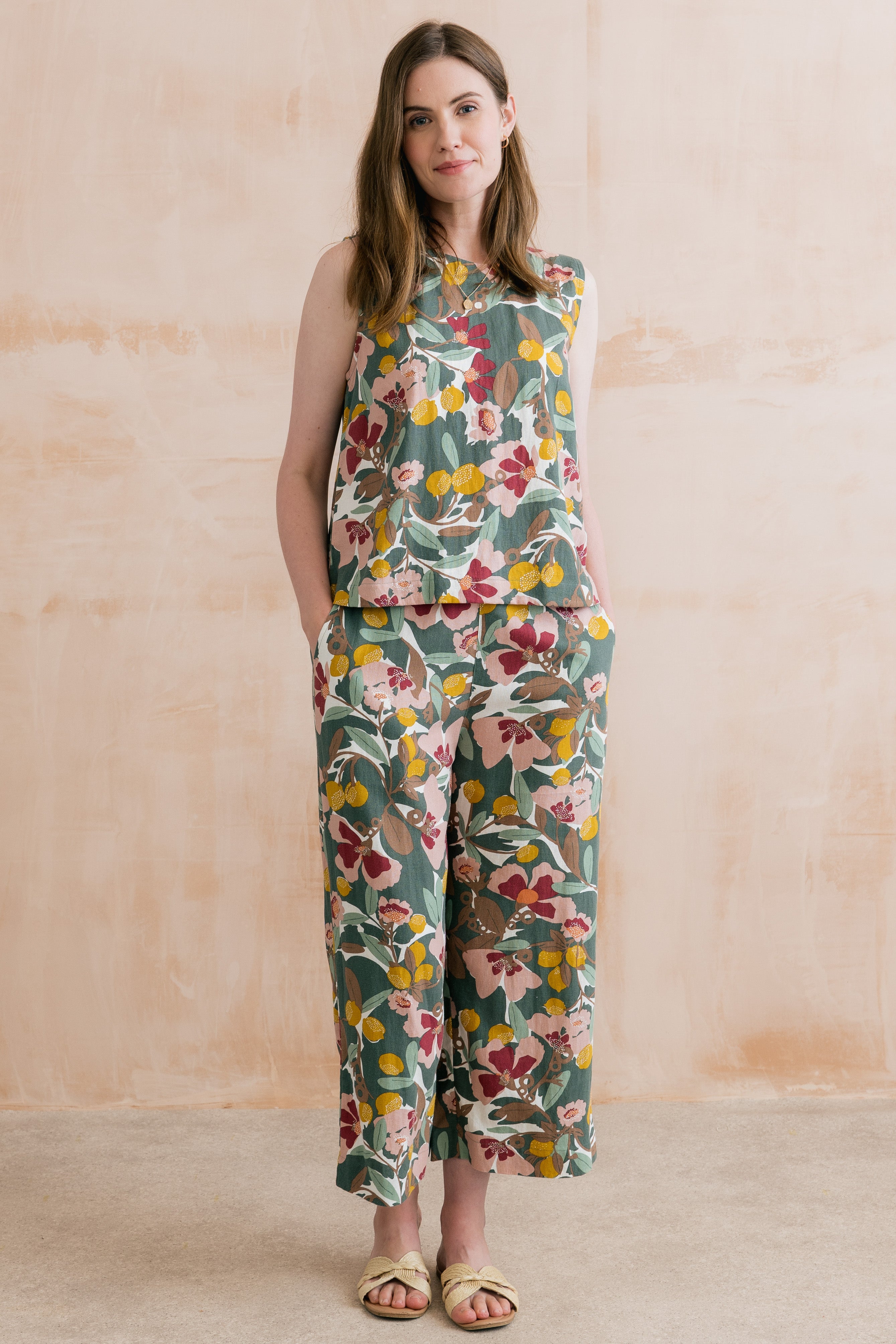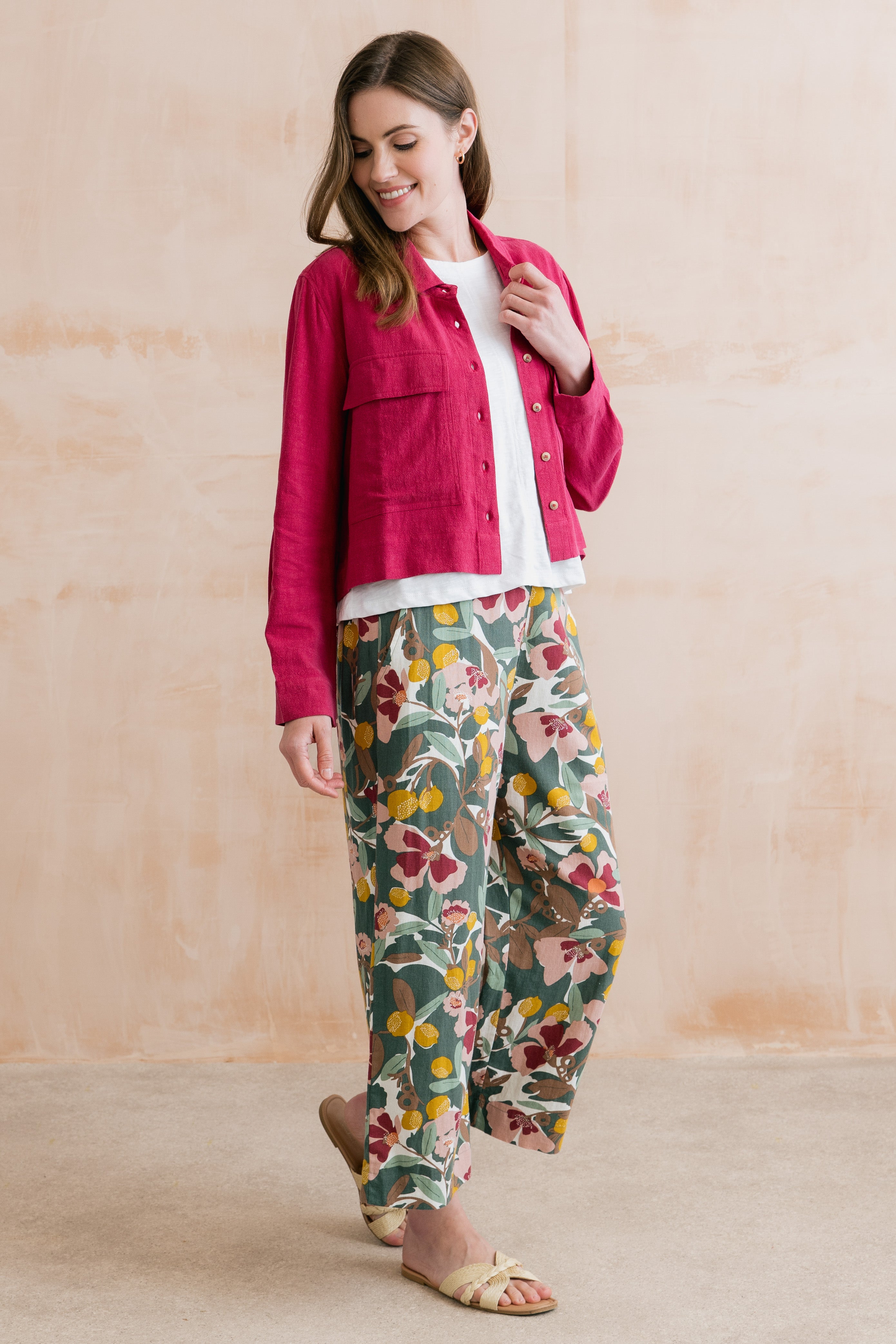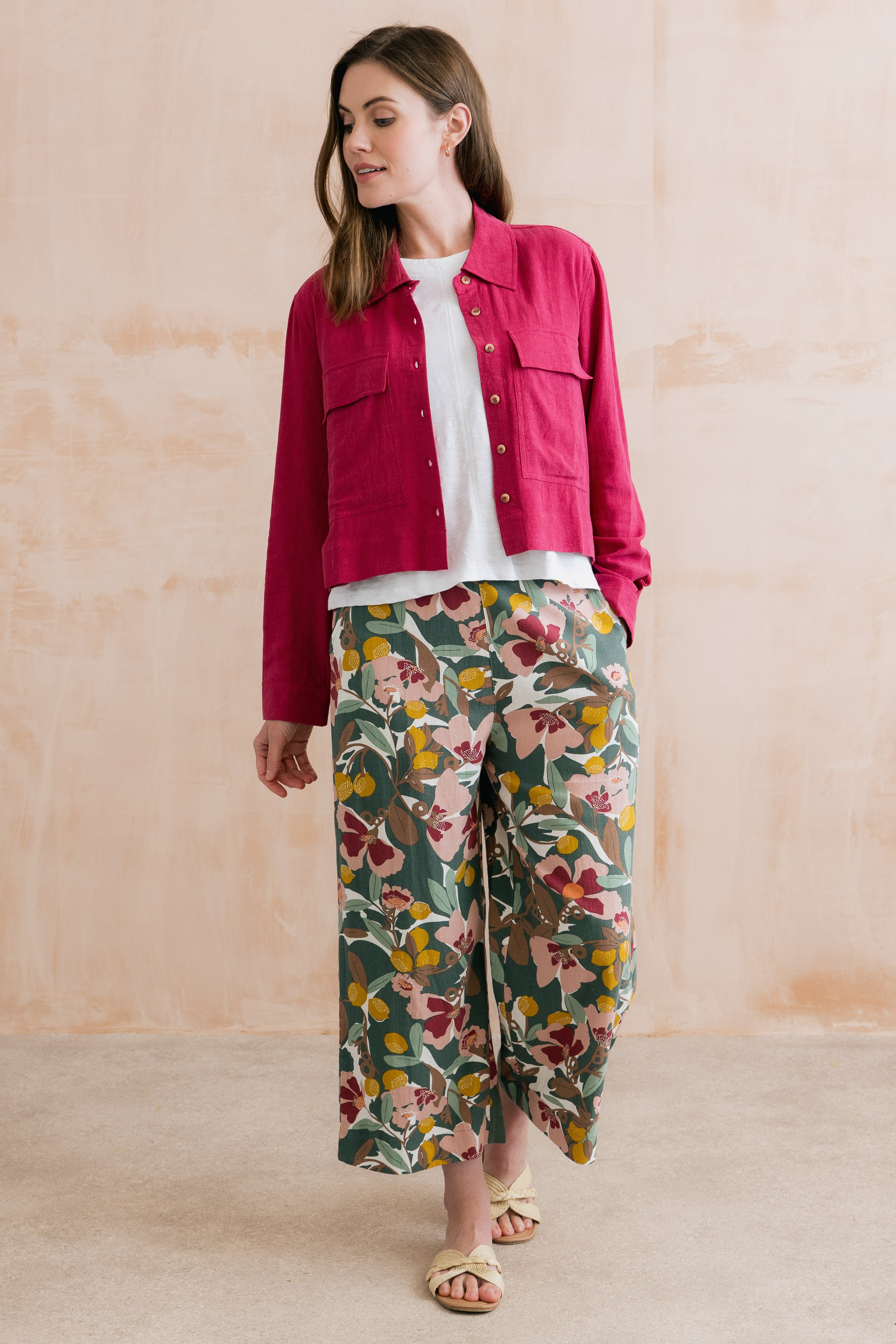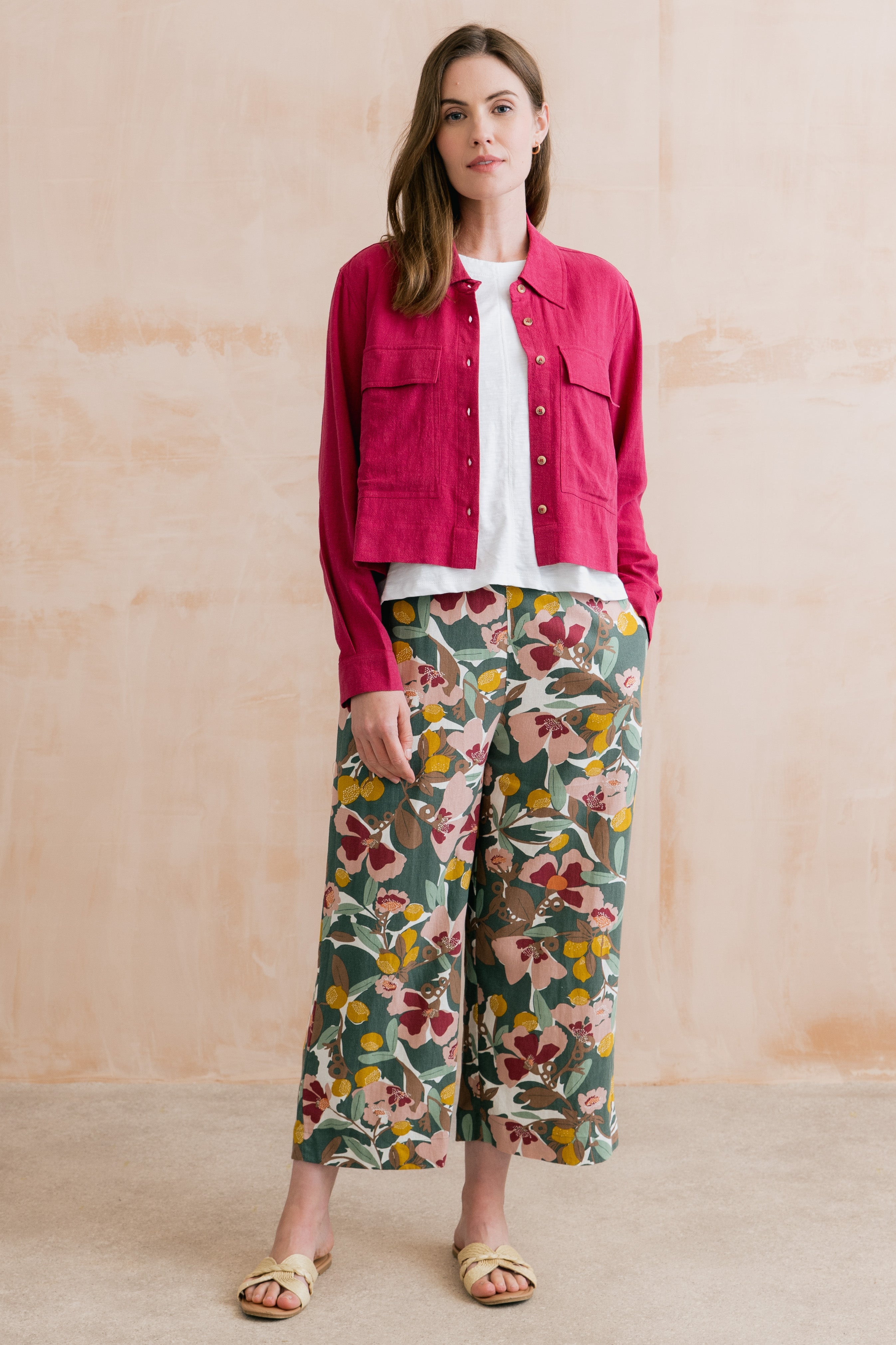 With a flat front and elasticated back waist, the flattering cropped wide-leg shape skims the body for a perfect fit, whilst the blended yarn allows for a smooth drape without the usual creasing caused by pure linen. Pair with a simple t-shirt for an easy everyday look or go bold with print-on-print by pairing with our Cora Vest. .