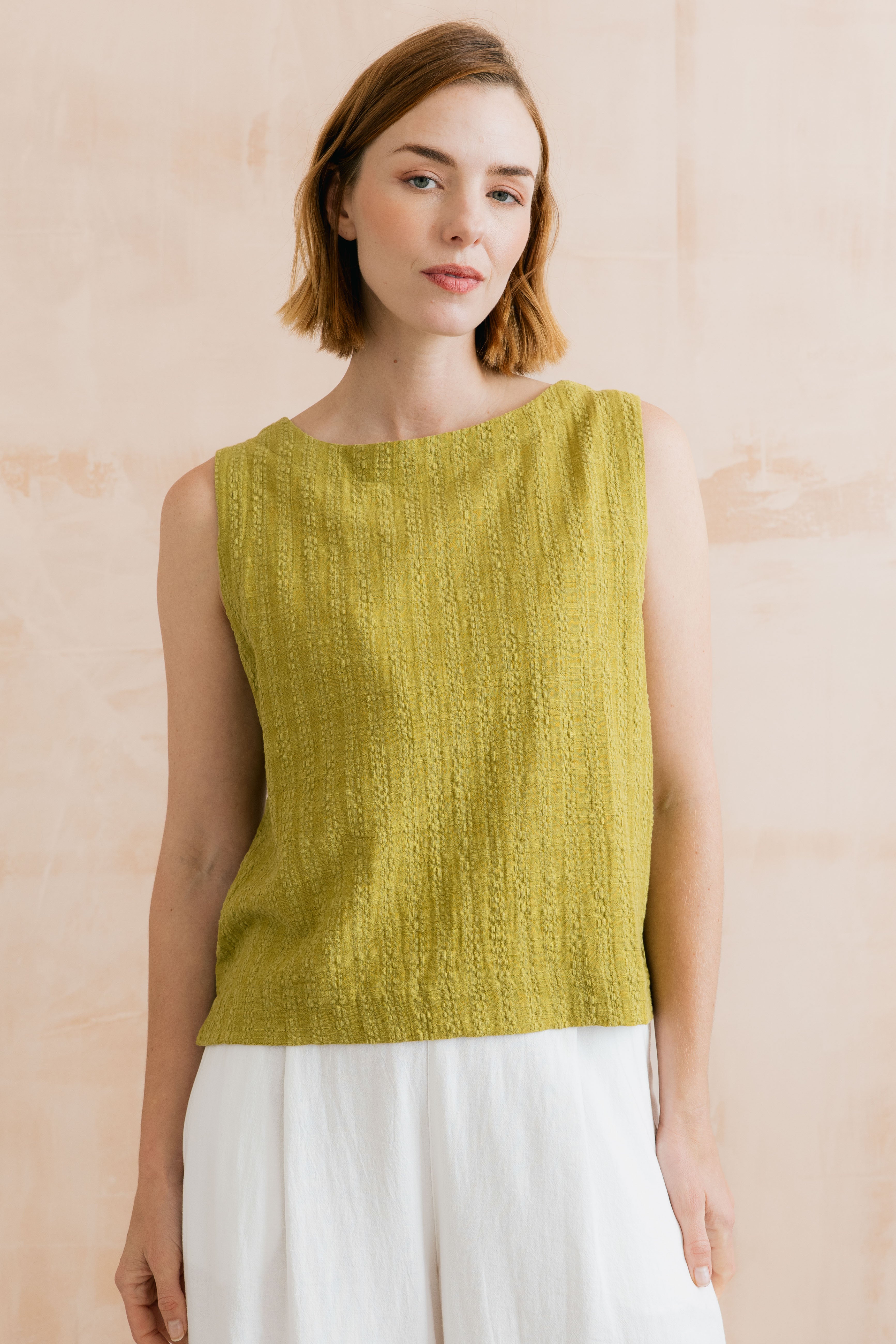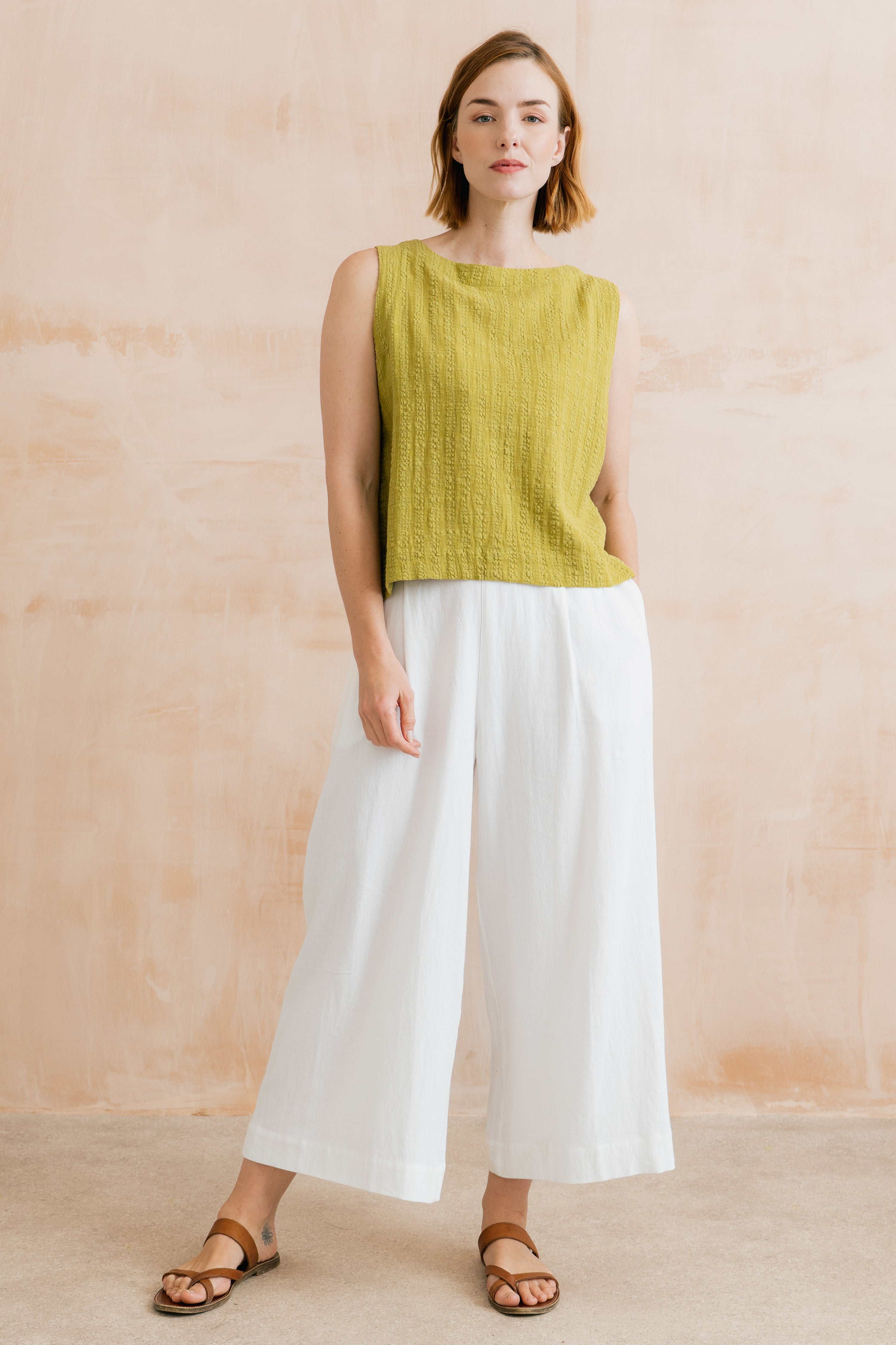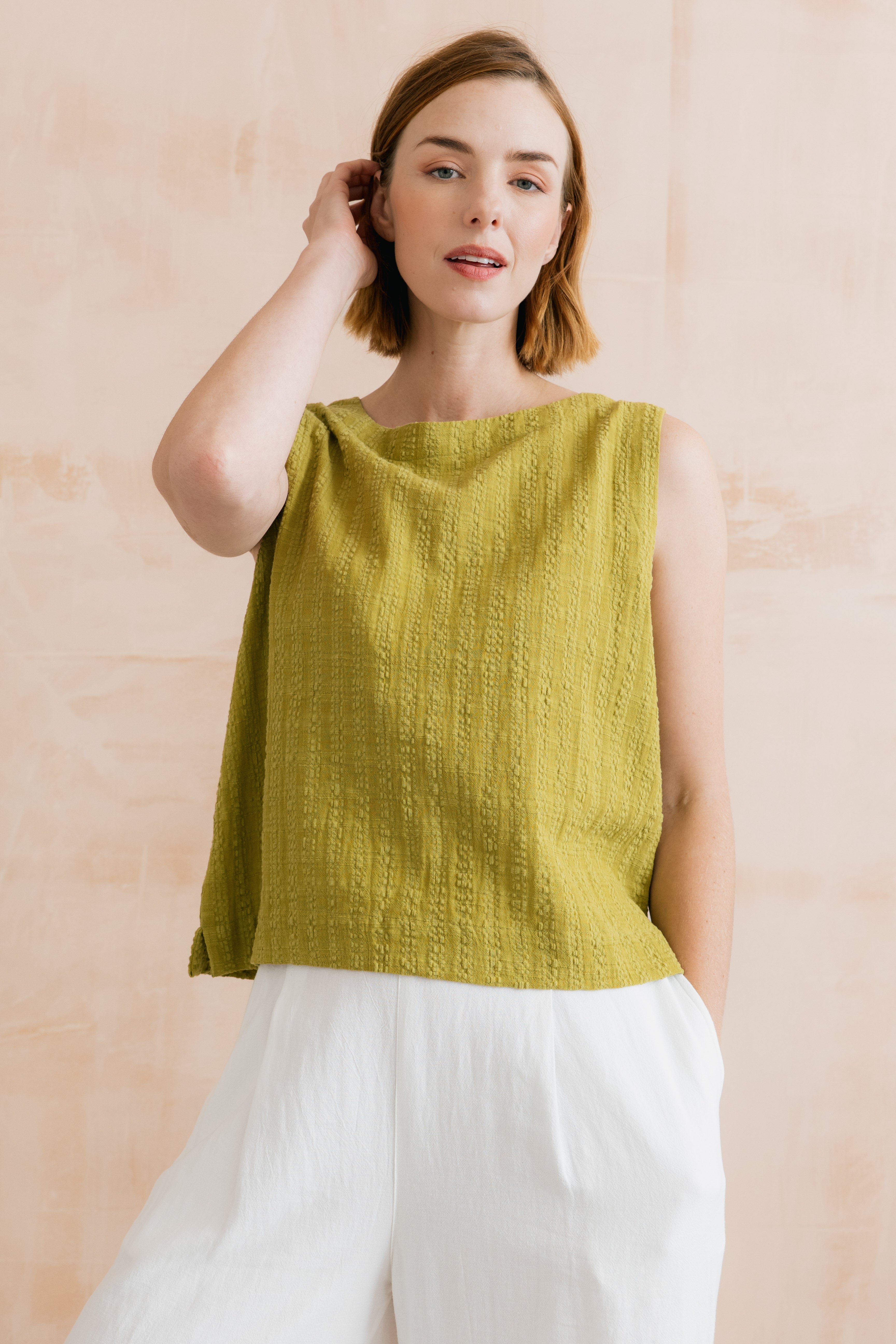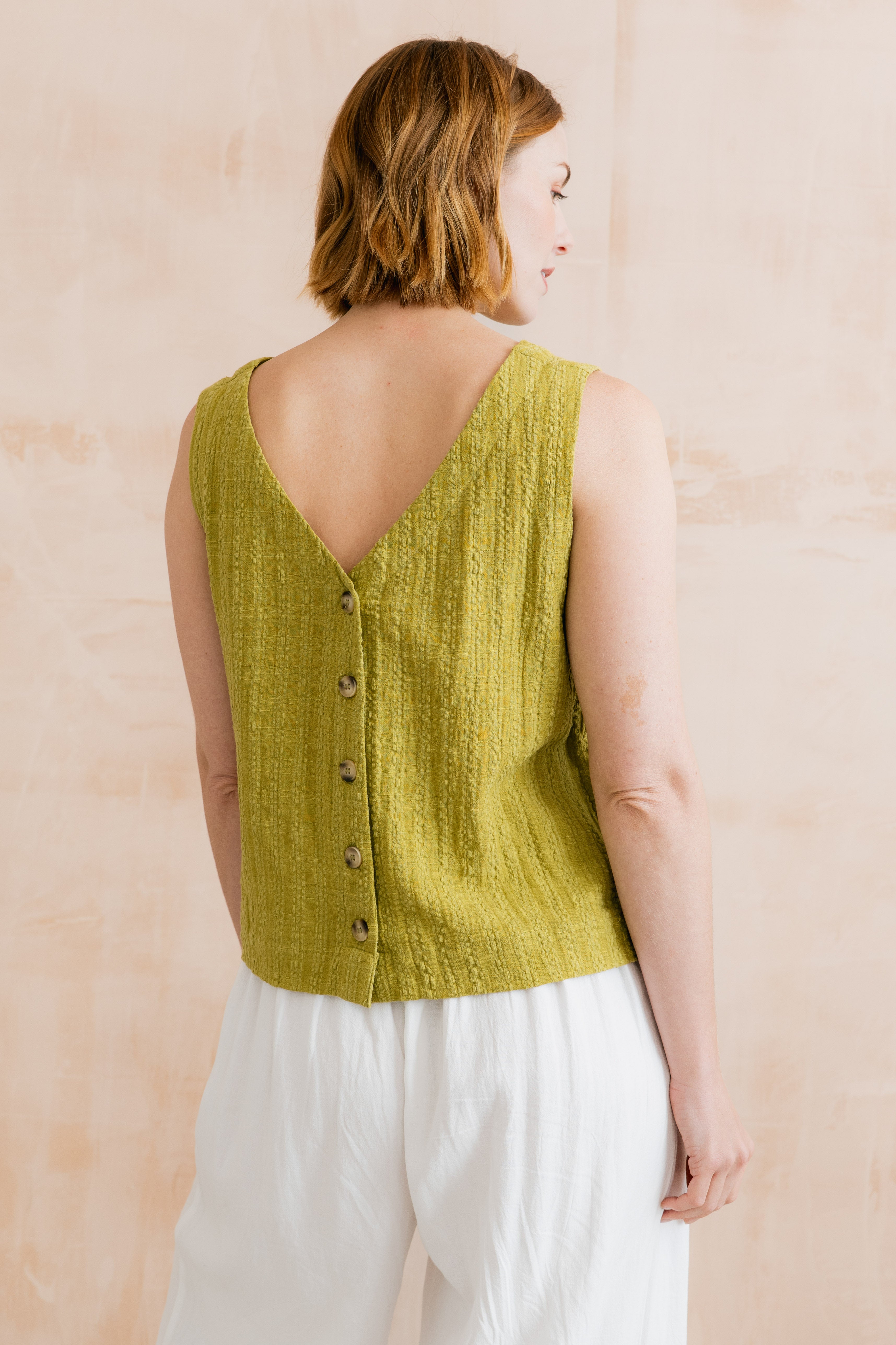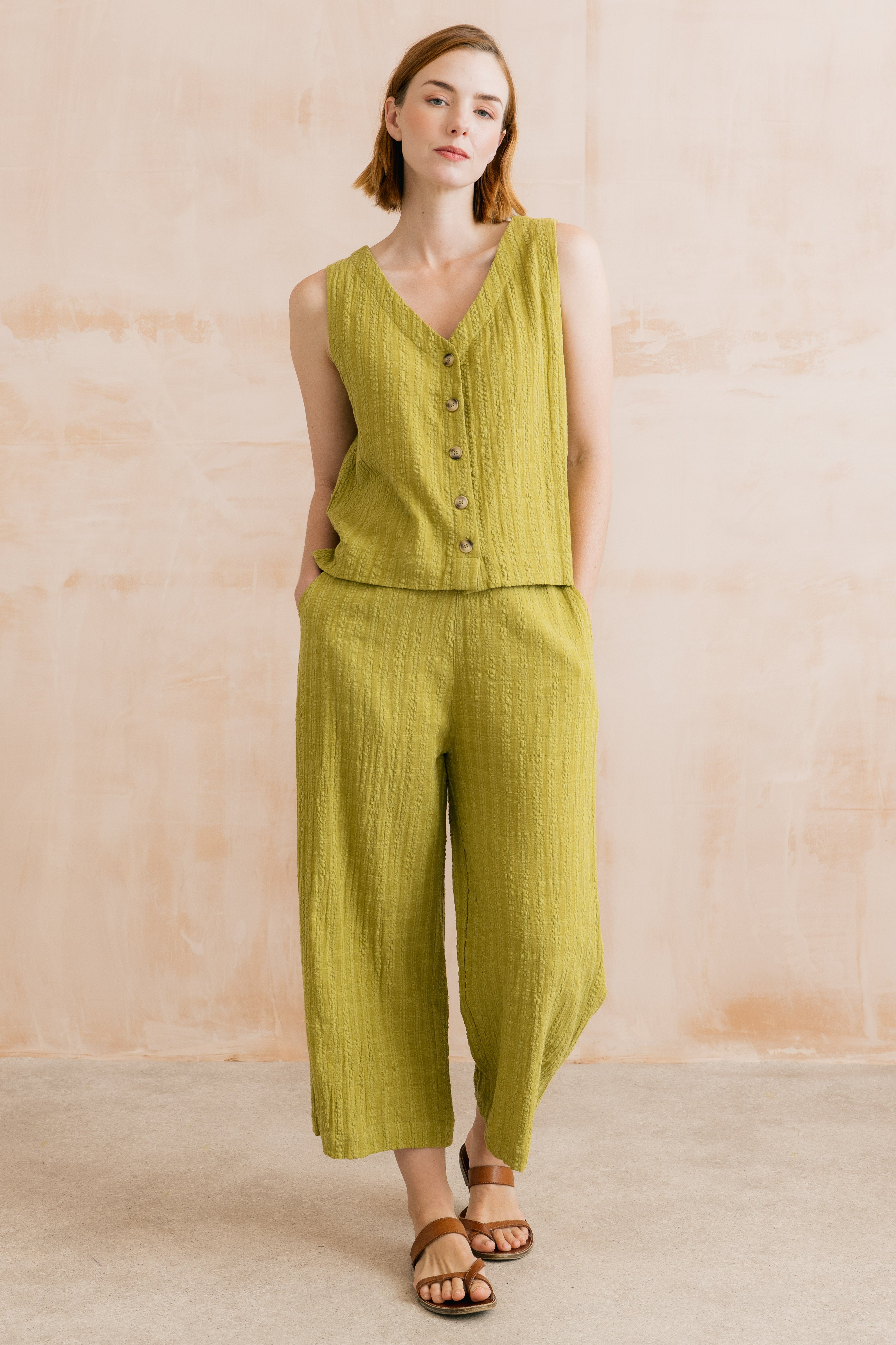 Our best-selling Allium Buttoned Vest is back for another season. A modern spin on a classic vest, with a V-neckline and button-through detail. Made from textured organic cotton blended with viscose, creating a soft and breathable, summer-weight seersucker fabric.