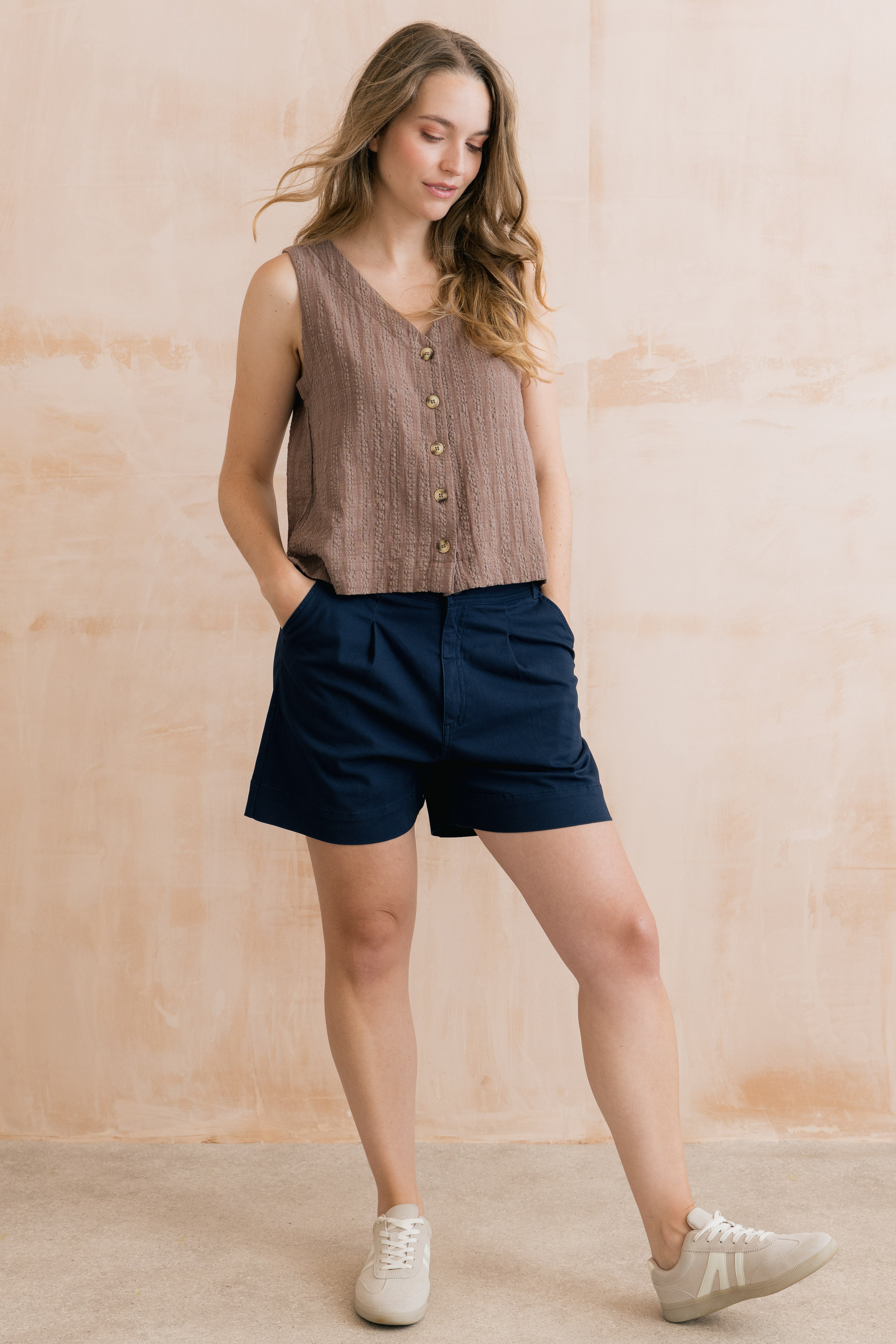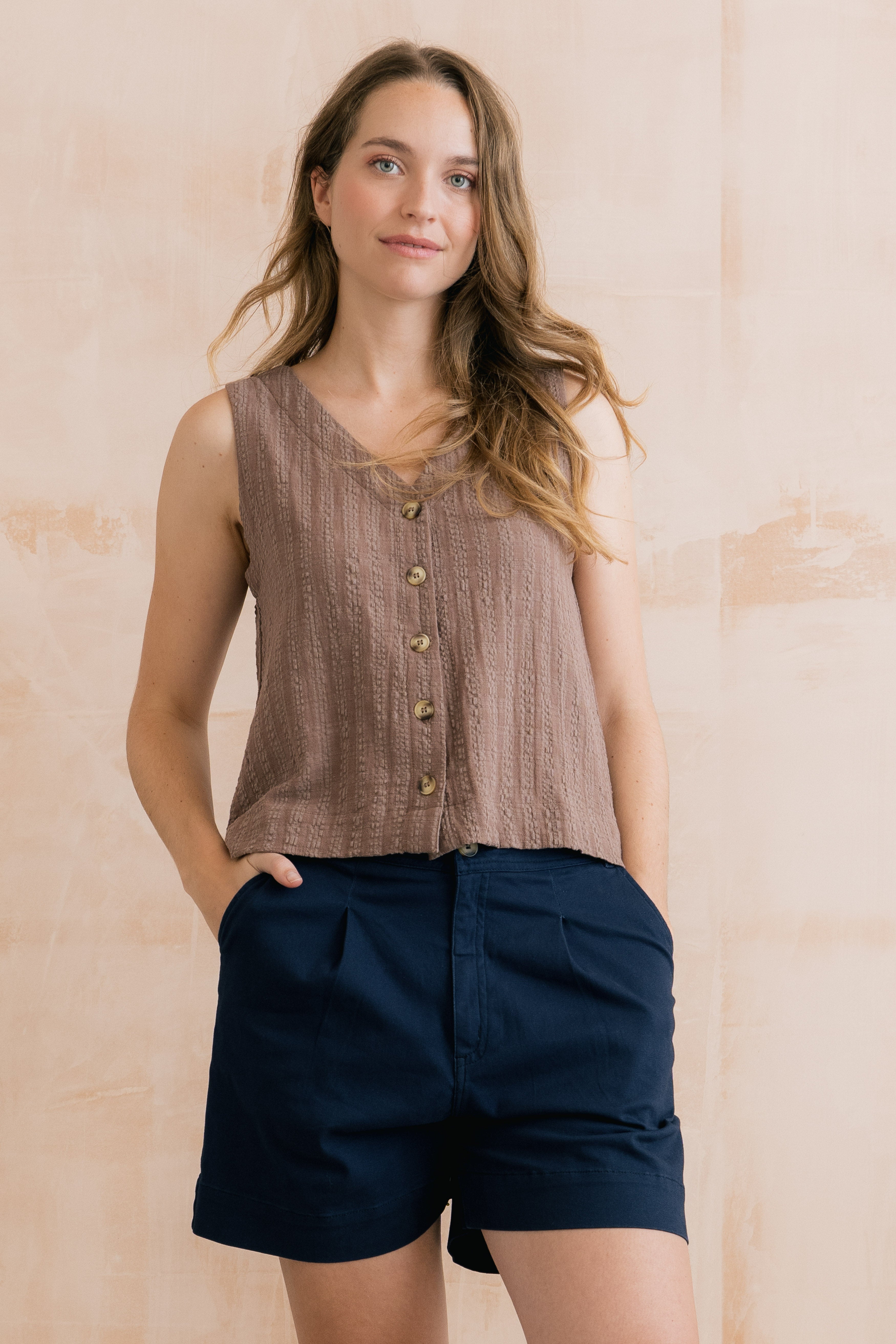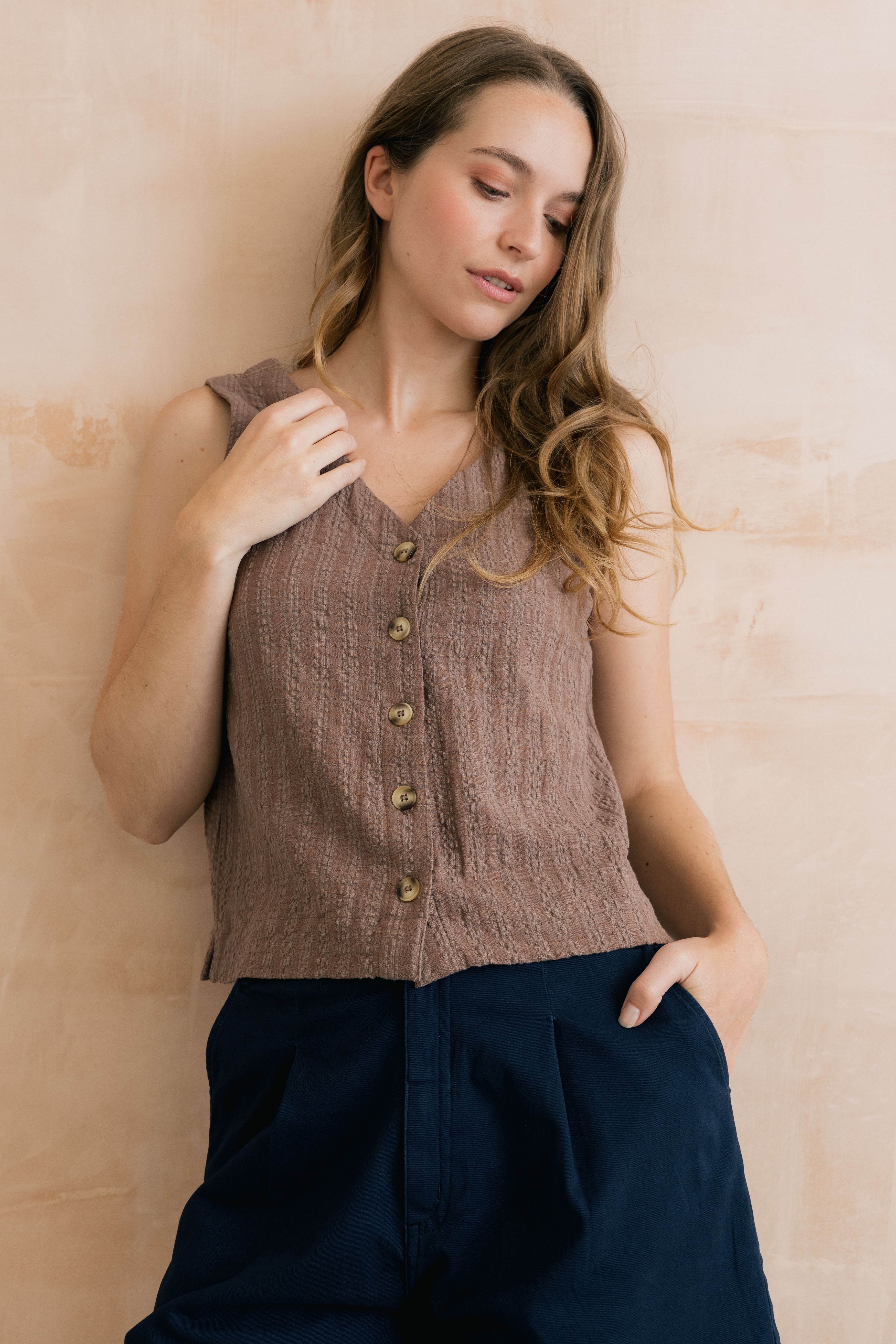 Our best-selling Allium Buttoned Vest is back for another season. A modern spin on a classic vest, with a V-neckline and button-through detail. Made from textured organic cotton blended with viscose, creating a soft and breathable, summer-weight seersucker fabric.