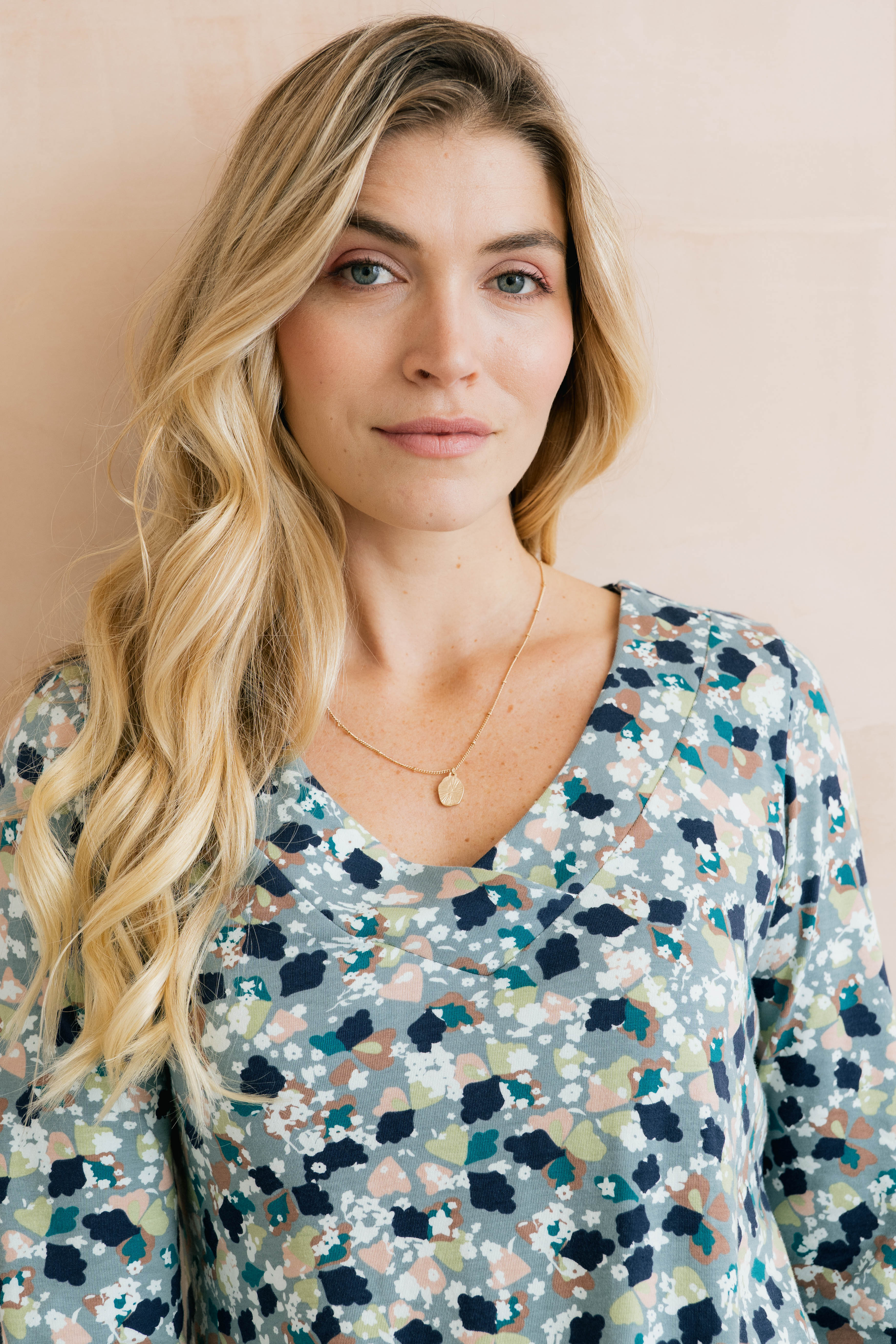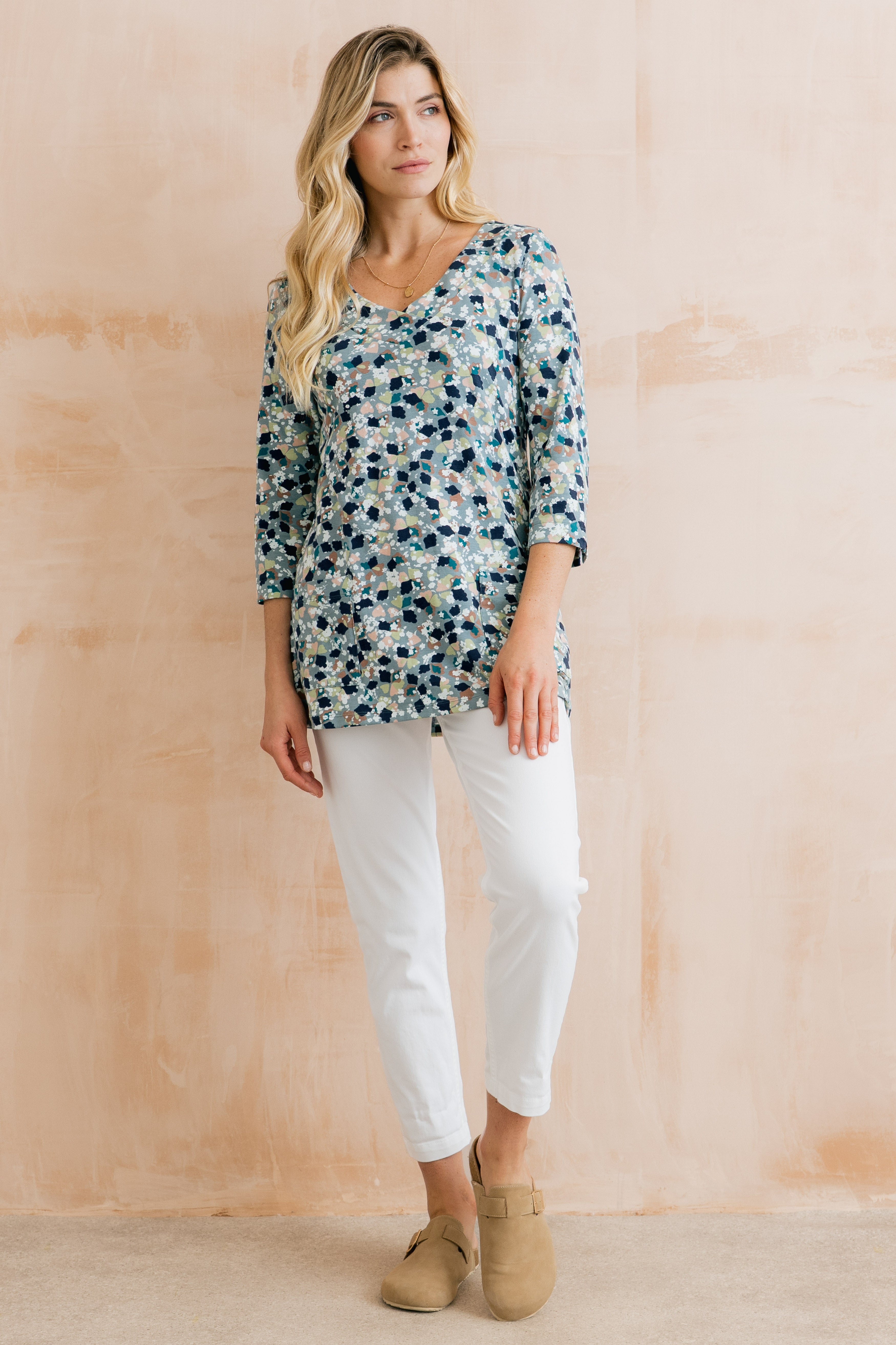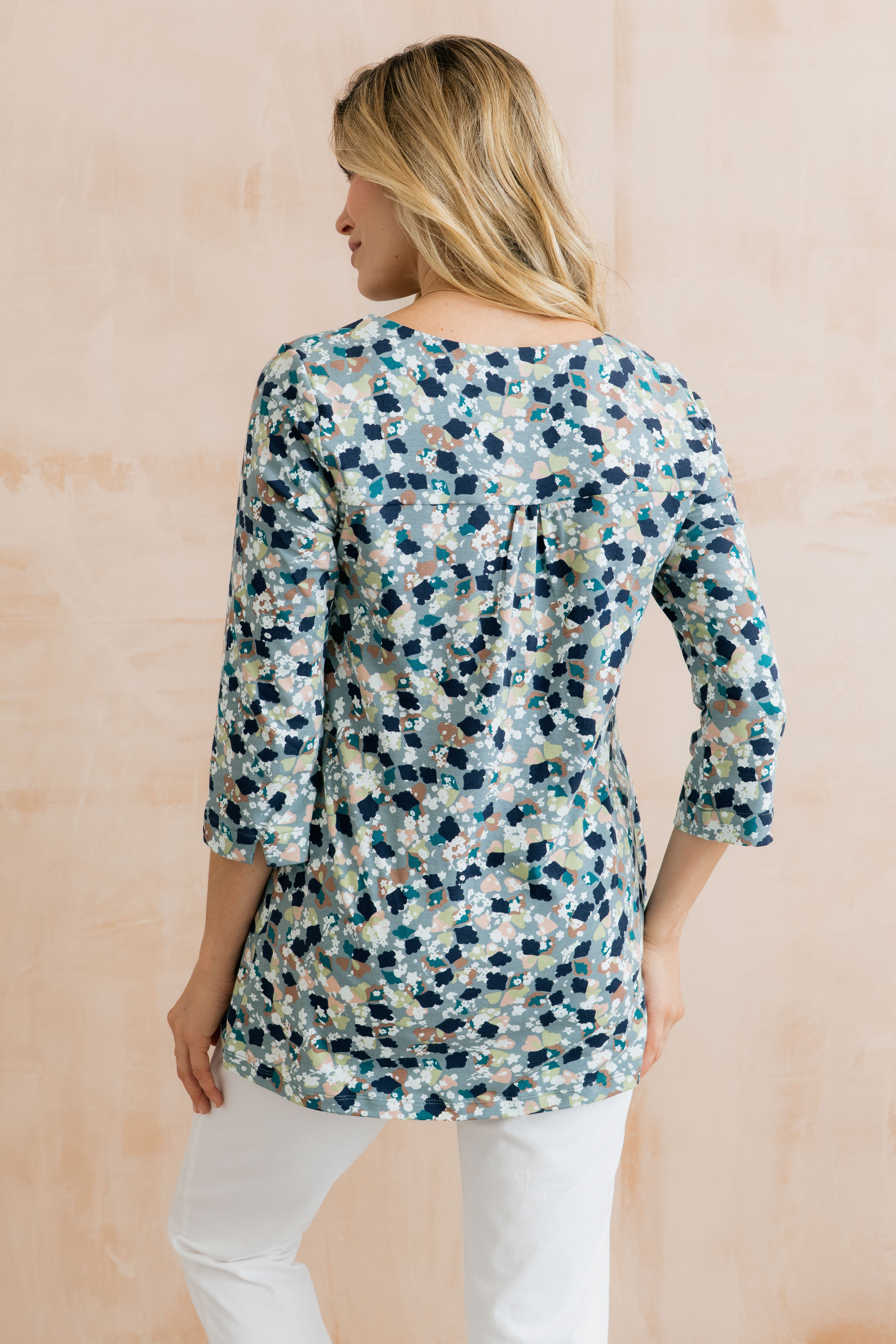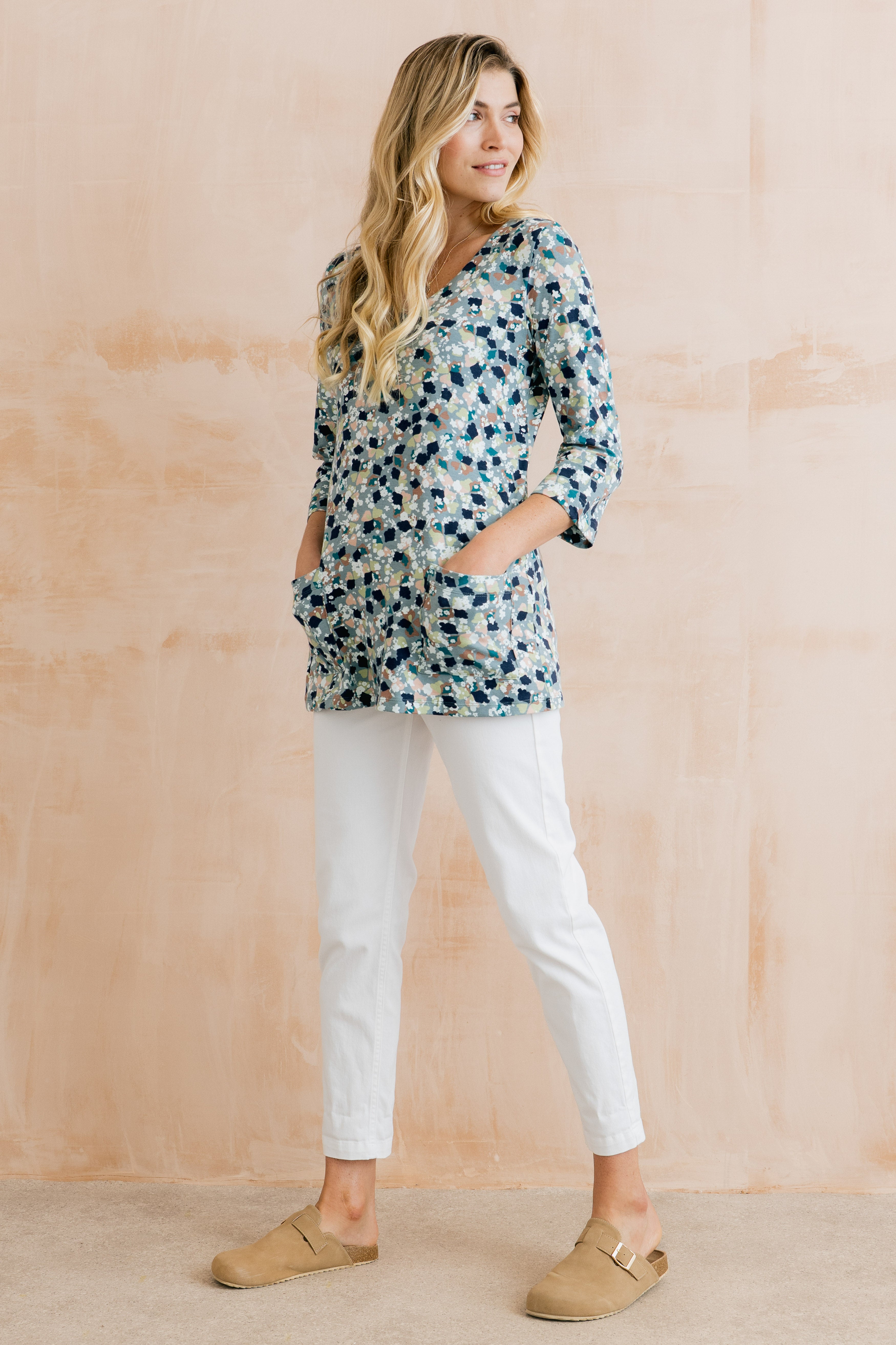 This pretty floral tunic has a soft v-neckline, 3/4 length sleeves and patch pockets.