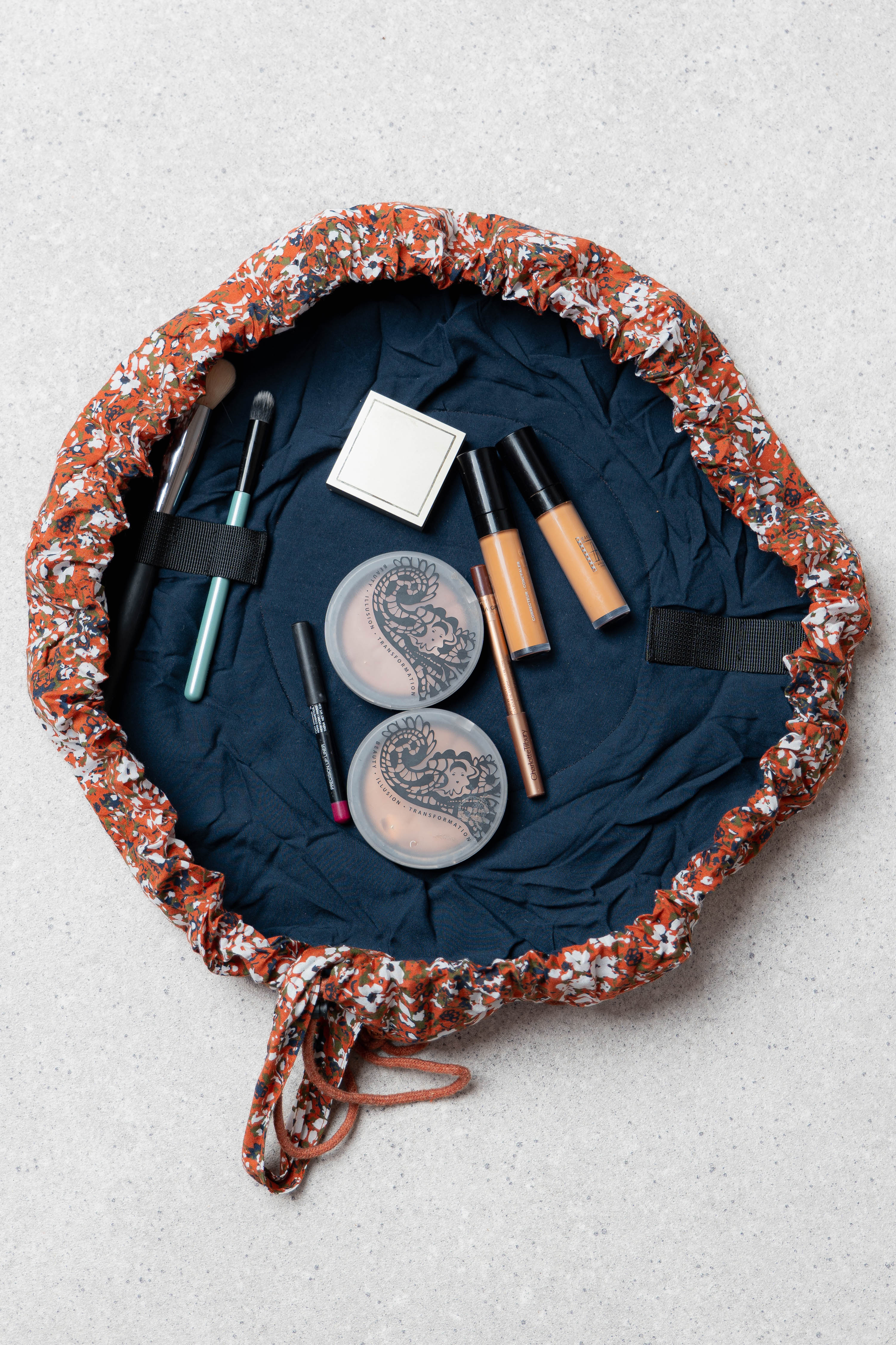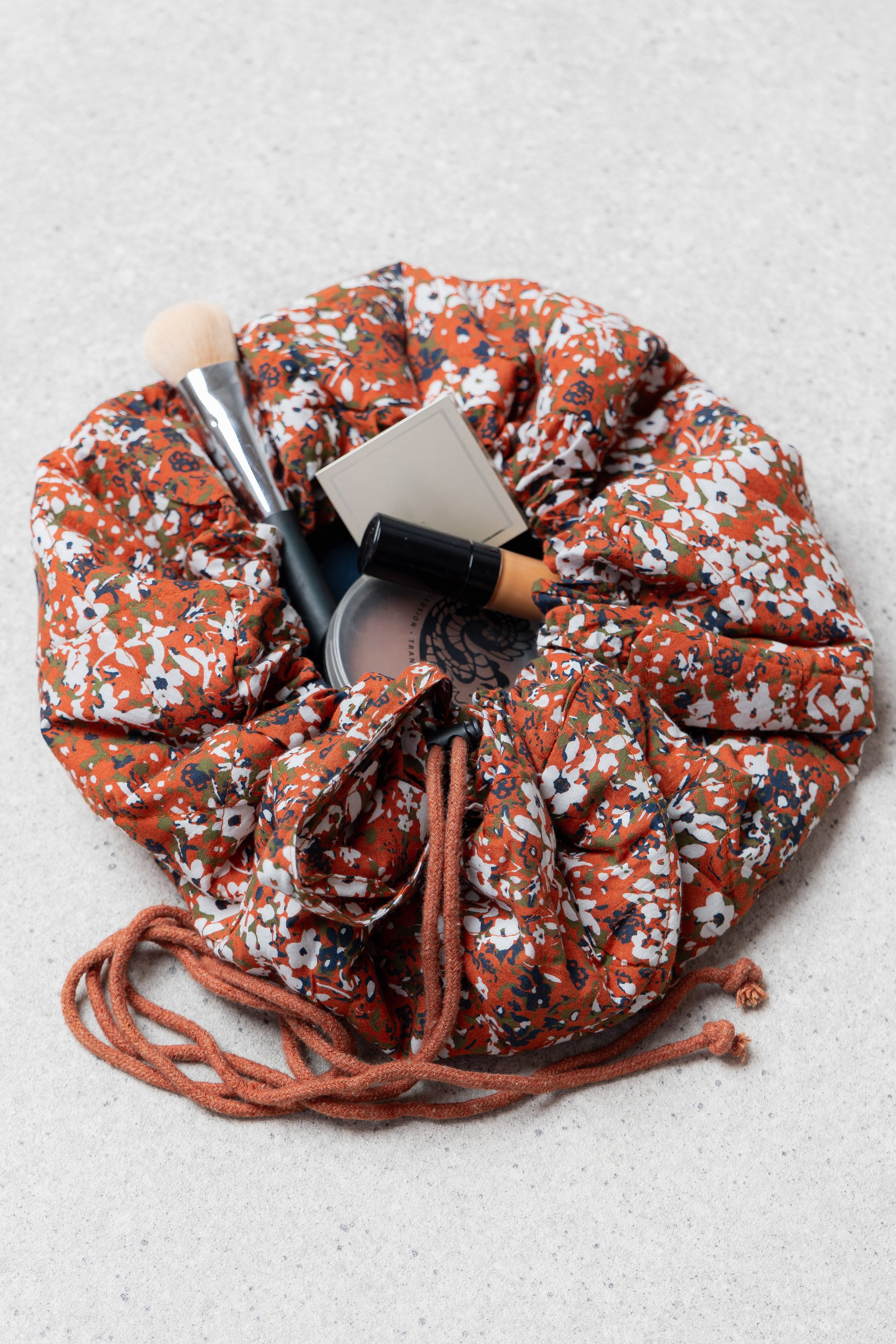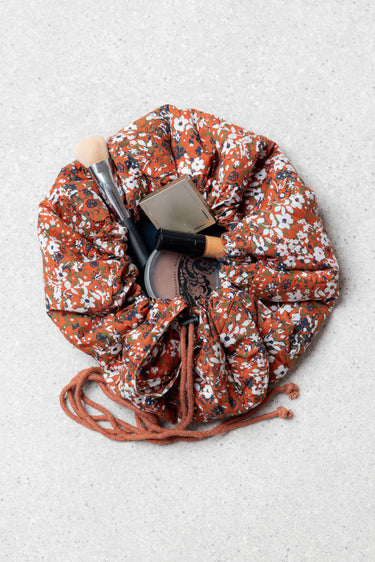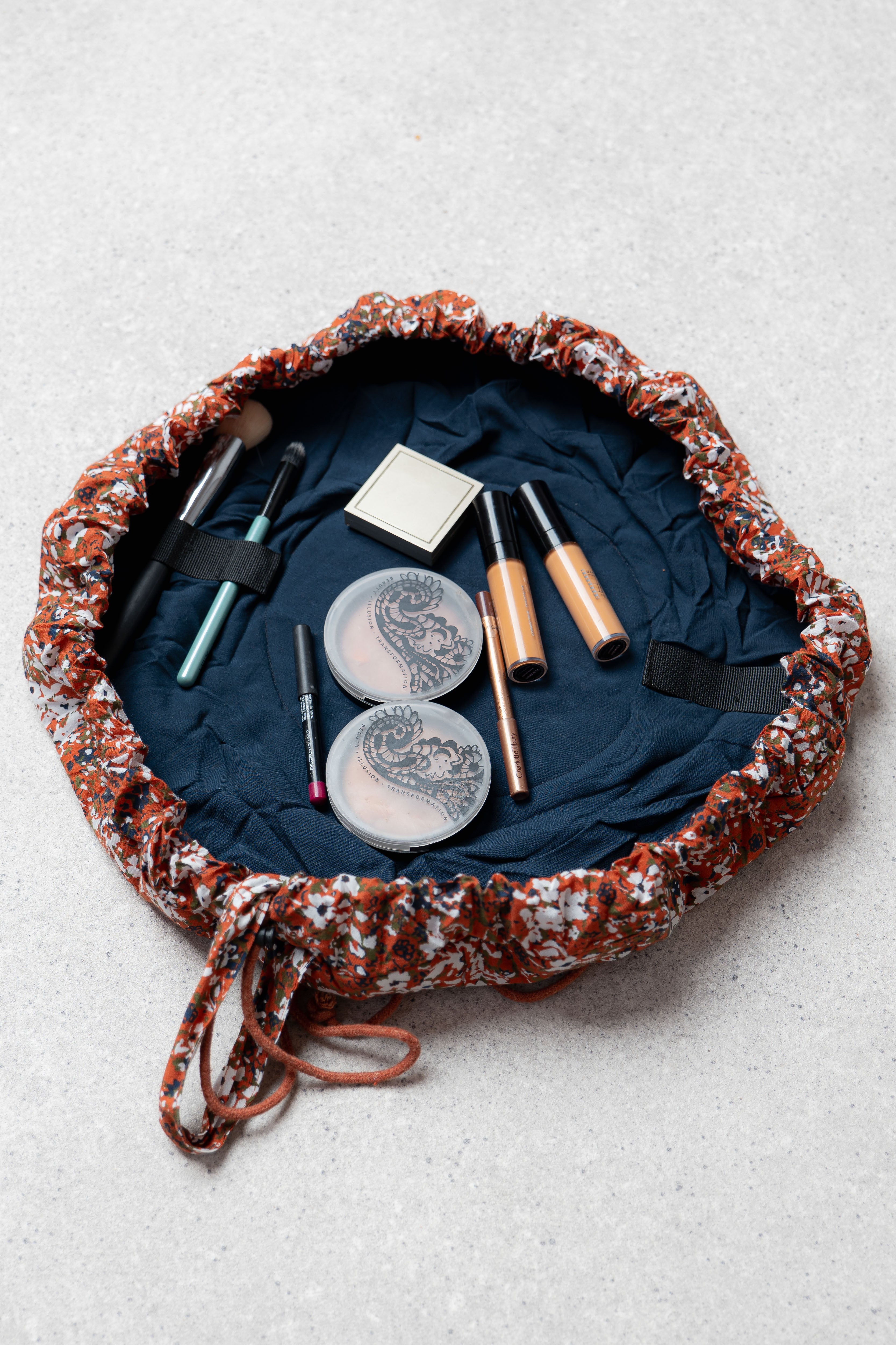 This quilted cotton make up pouch lays flat, letting you see all of your cosmetics in an instant! Handy elasticated hoops hold your brushes and kit in place and a drawstring and handle allow you to close and transport all your make-up essentials.