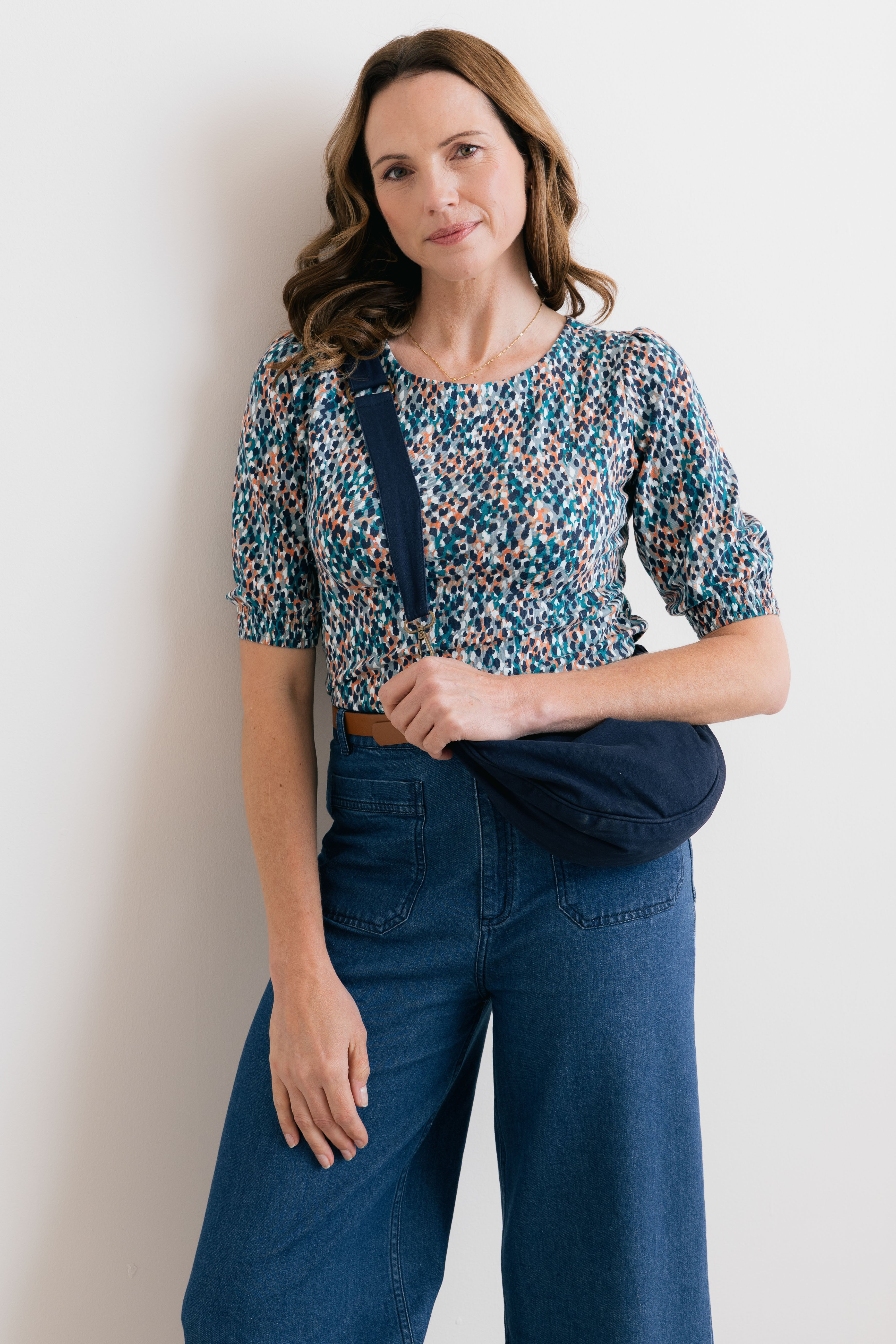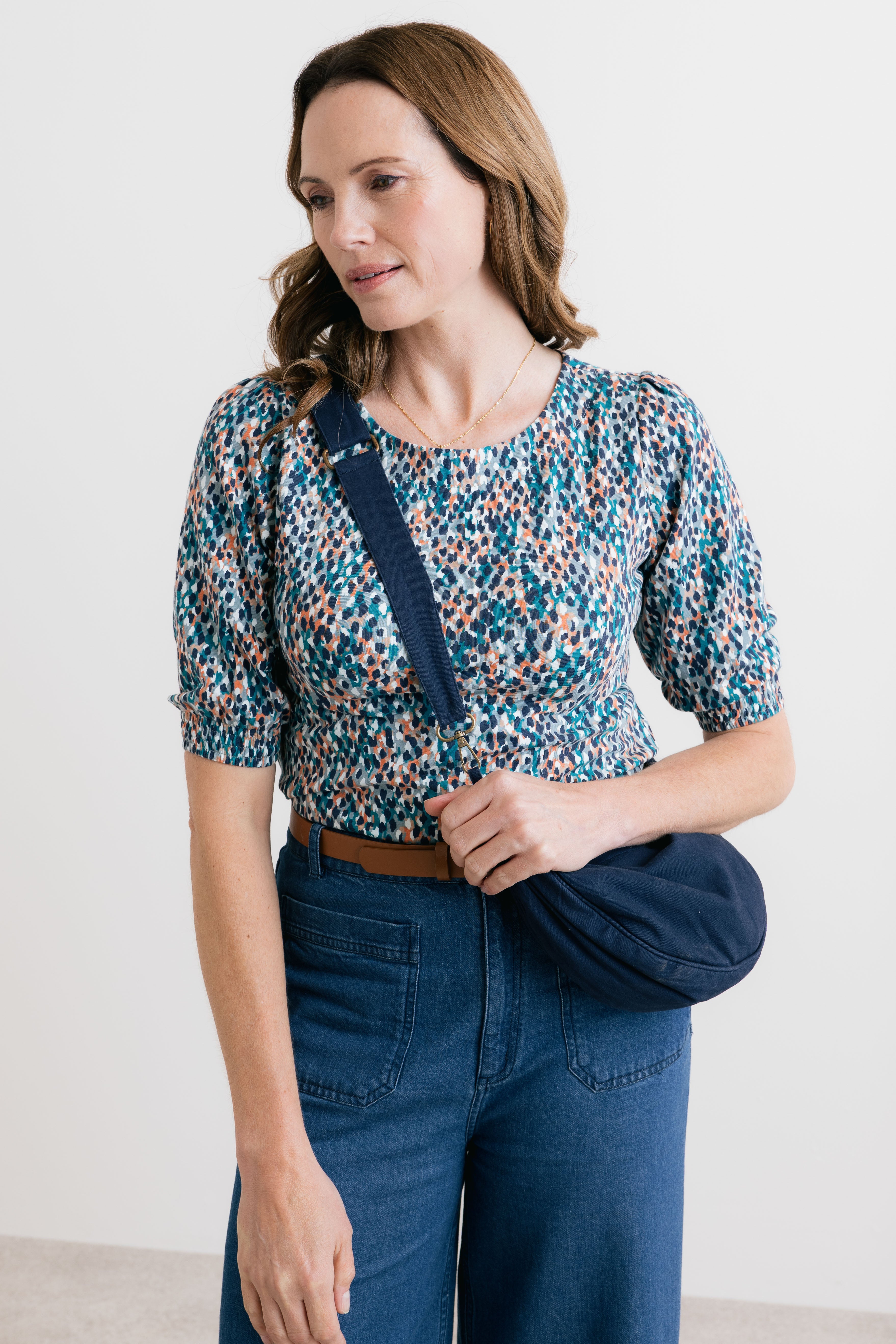 Soft, textured stretch cotton fabric with a zip fastening and finished with an adjustable strap and antique brass fixings.