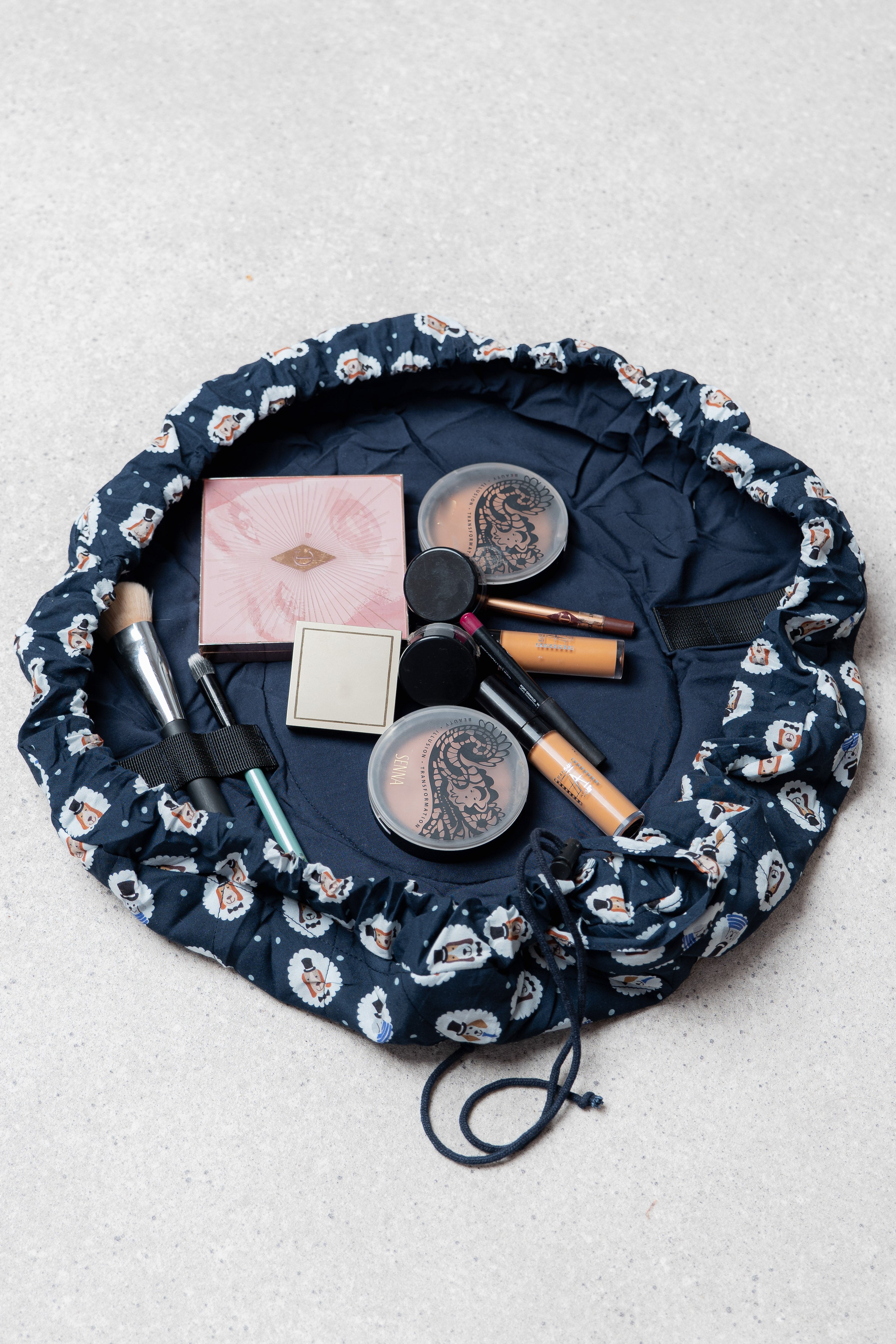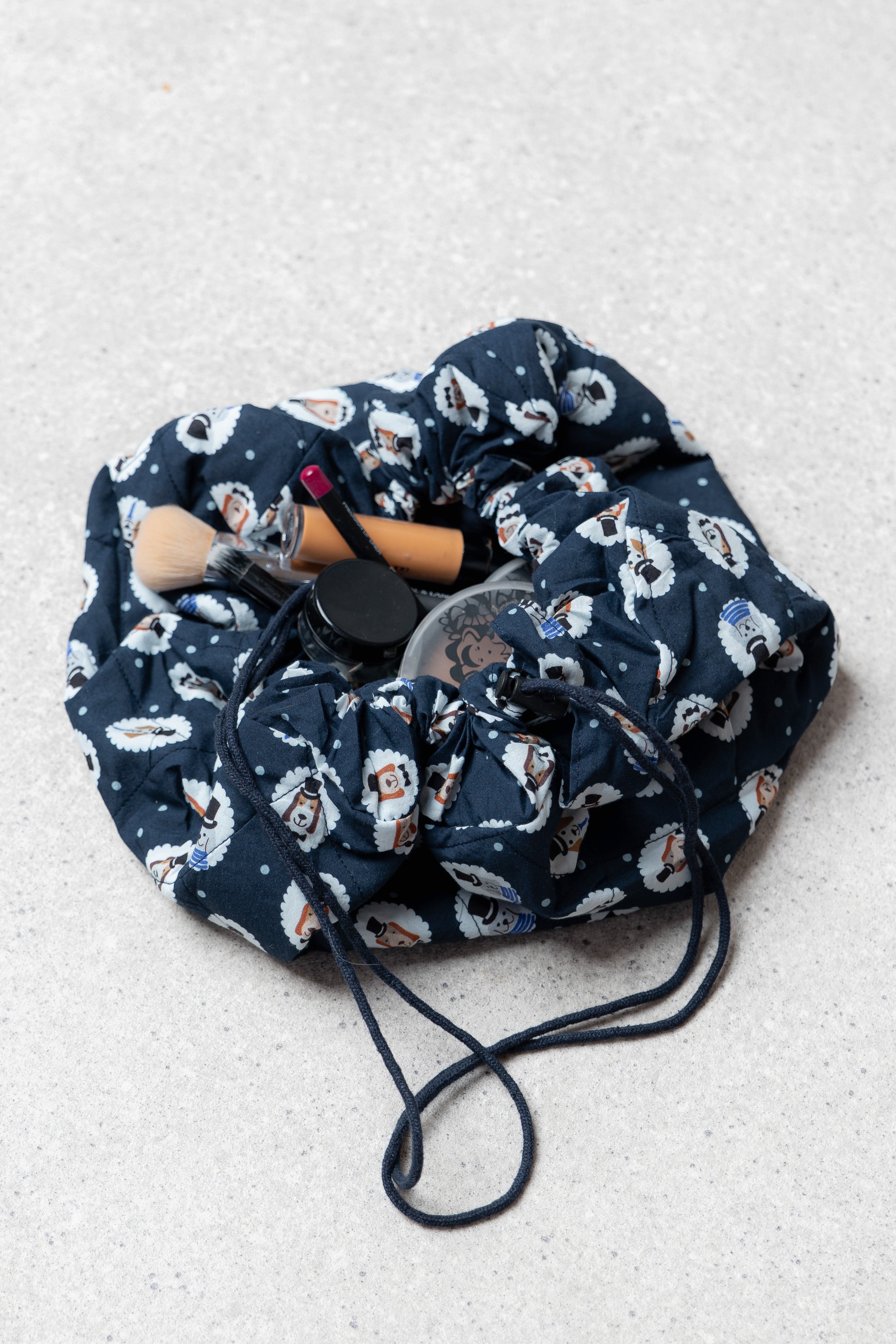 This quilted cotton make up pouch lays flat, letting you see all of your cosmetics in an instant! Handy elasticated hoops hold your brushes and kit in place and a drawstring and handle allow you to close and transport all your make-up essentials.