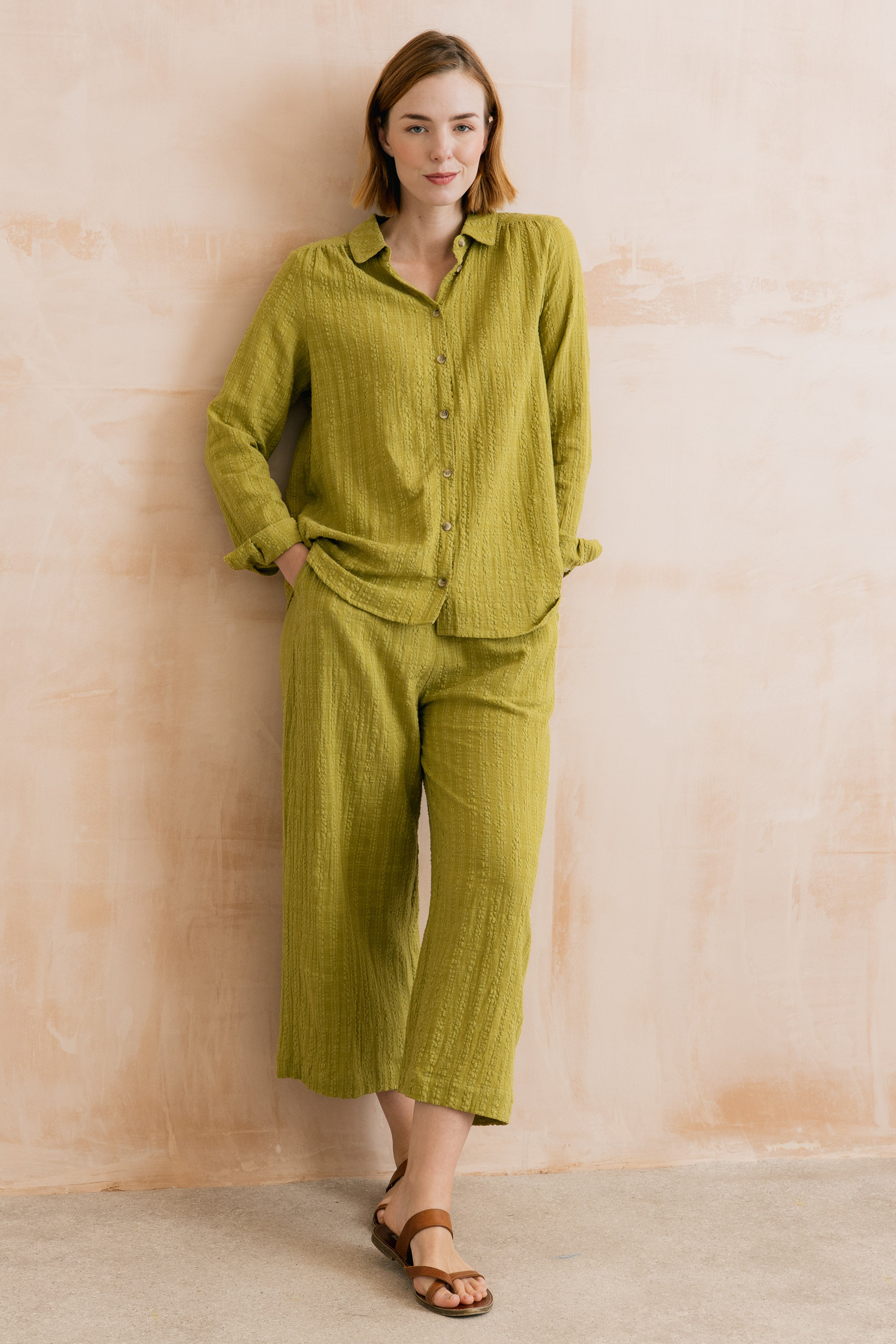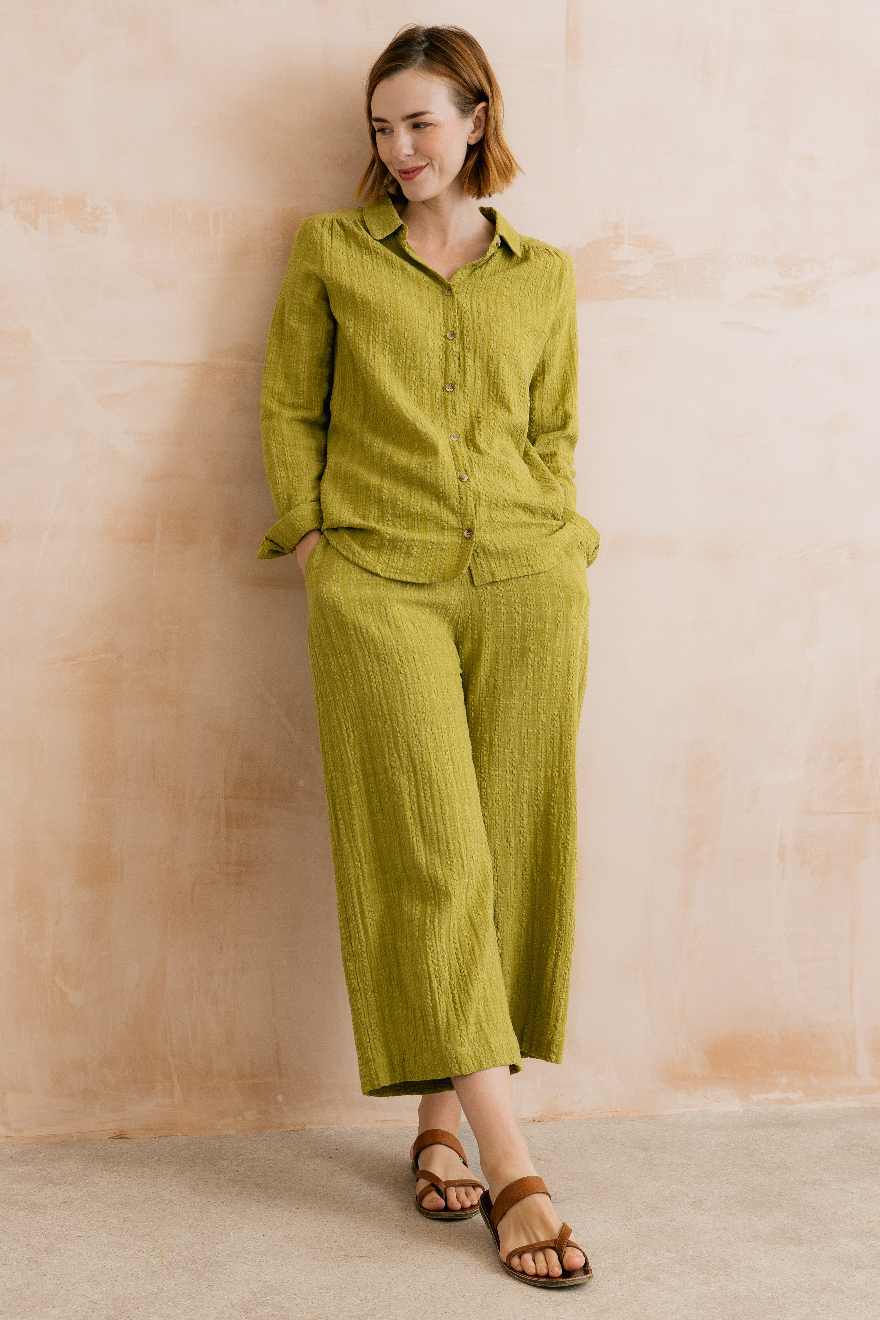 With a flat front and elasticated back waist, the flattering cropped wide-leg shape skims the body for a perfect fit. Pair with a simple t-shirt for an easy everyday look or add a matching Savannah shirt for a tactile two piece.