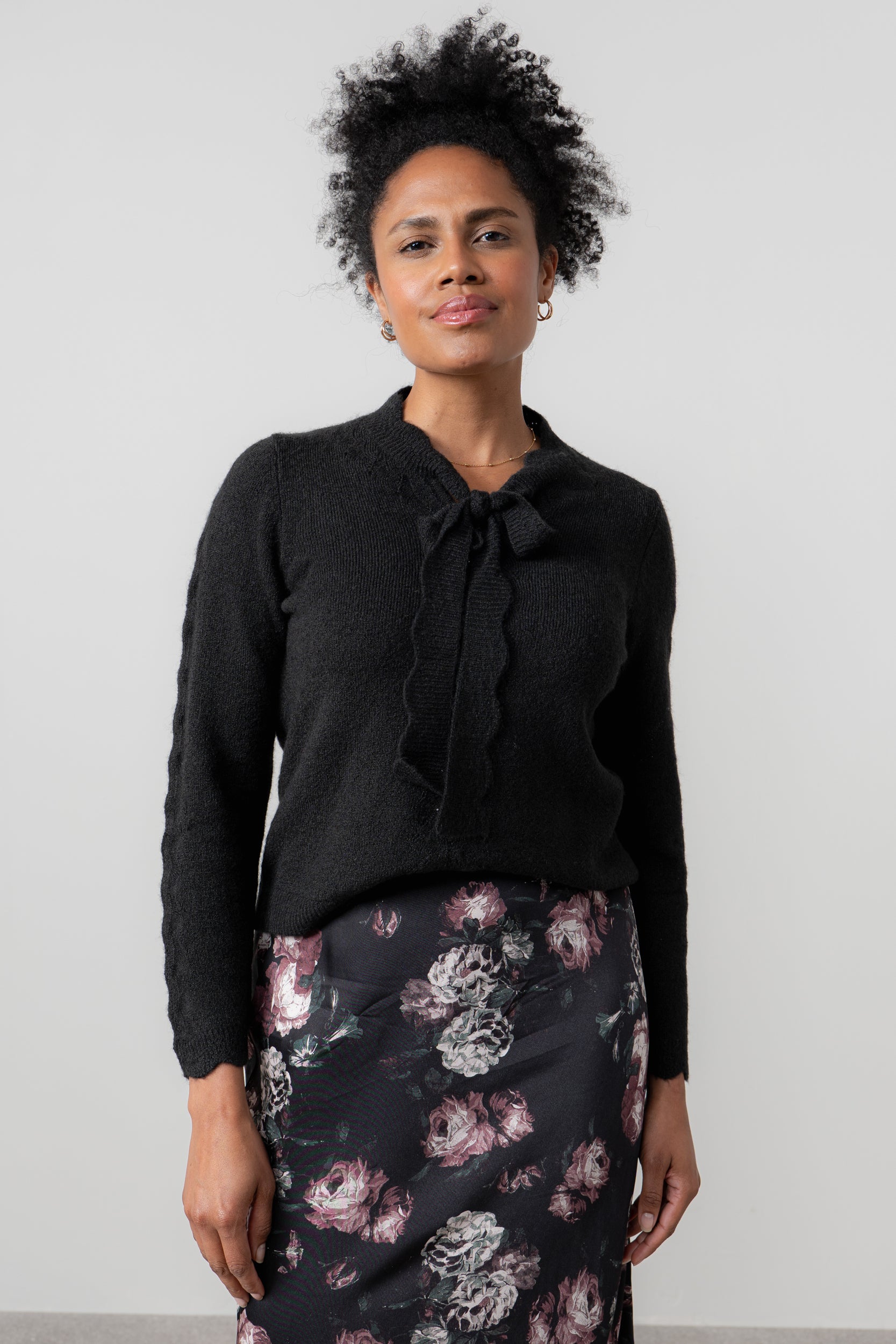 An elevated knit jumper with pretty pointelle detailing at the front and back of the body and on the sleeves. Scalloping at the neck and cuffs and a statement tie neck detail adds drama.
