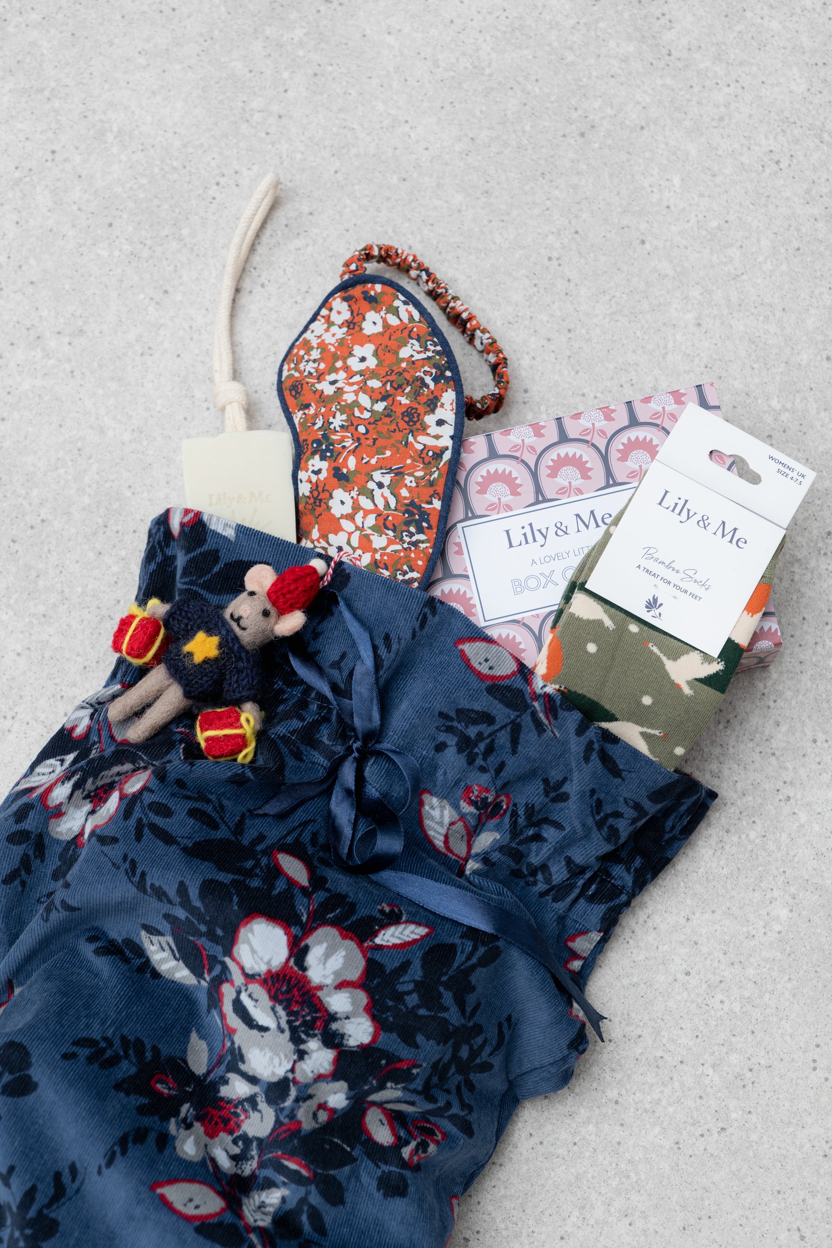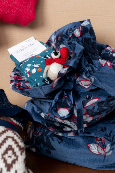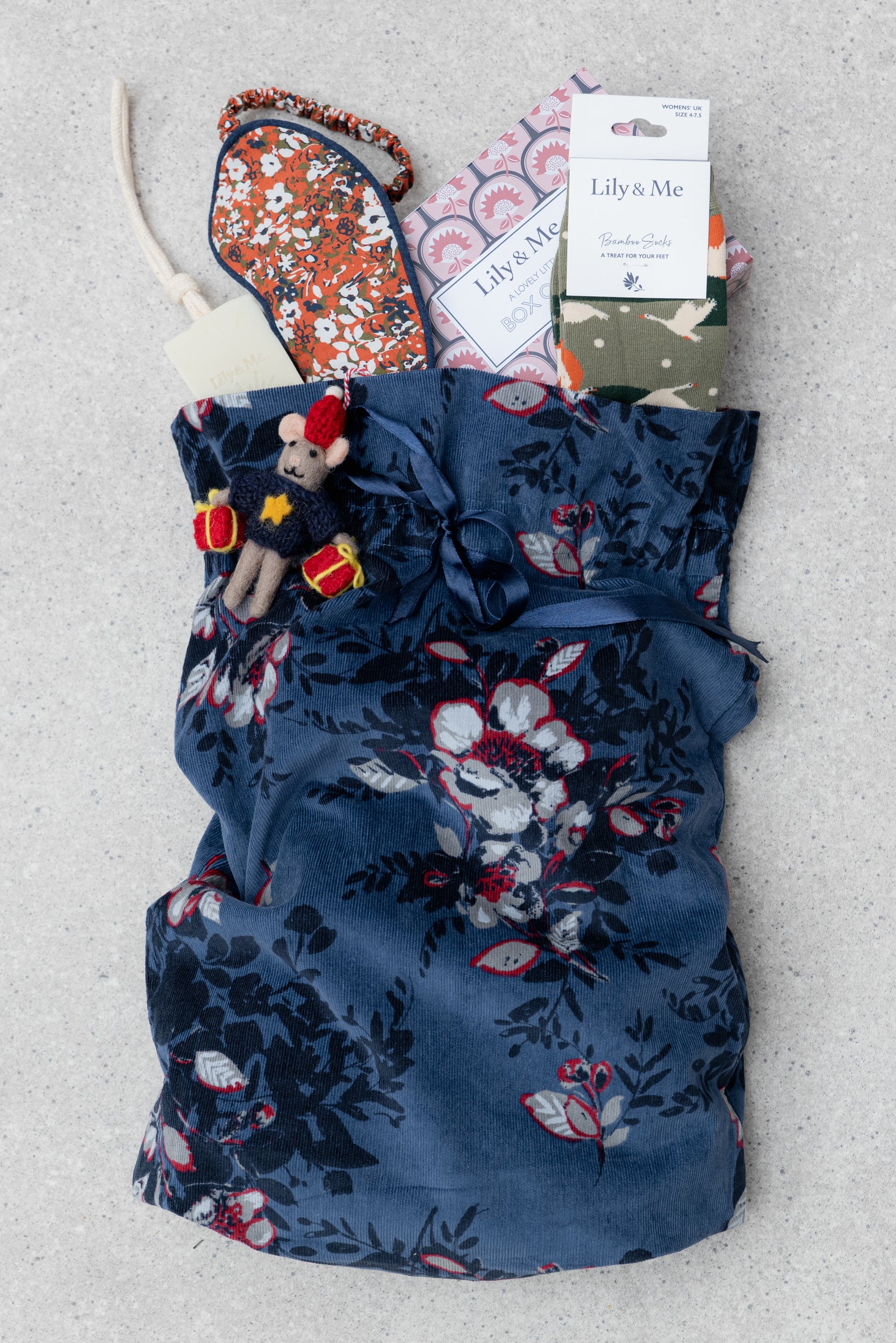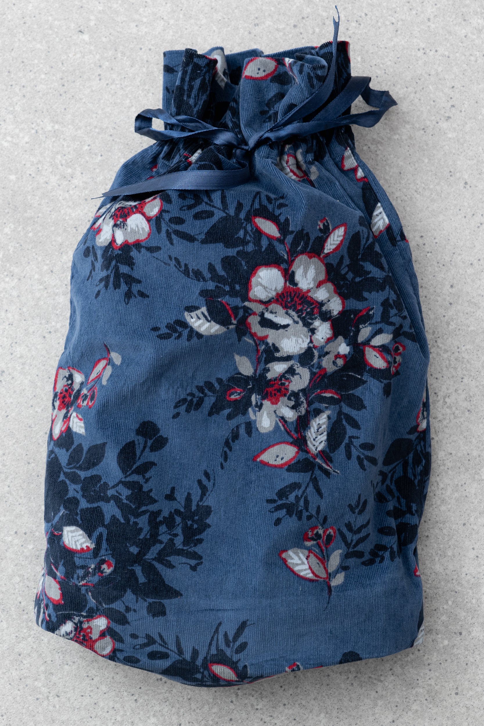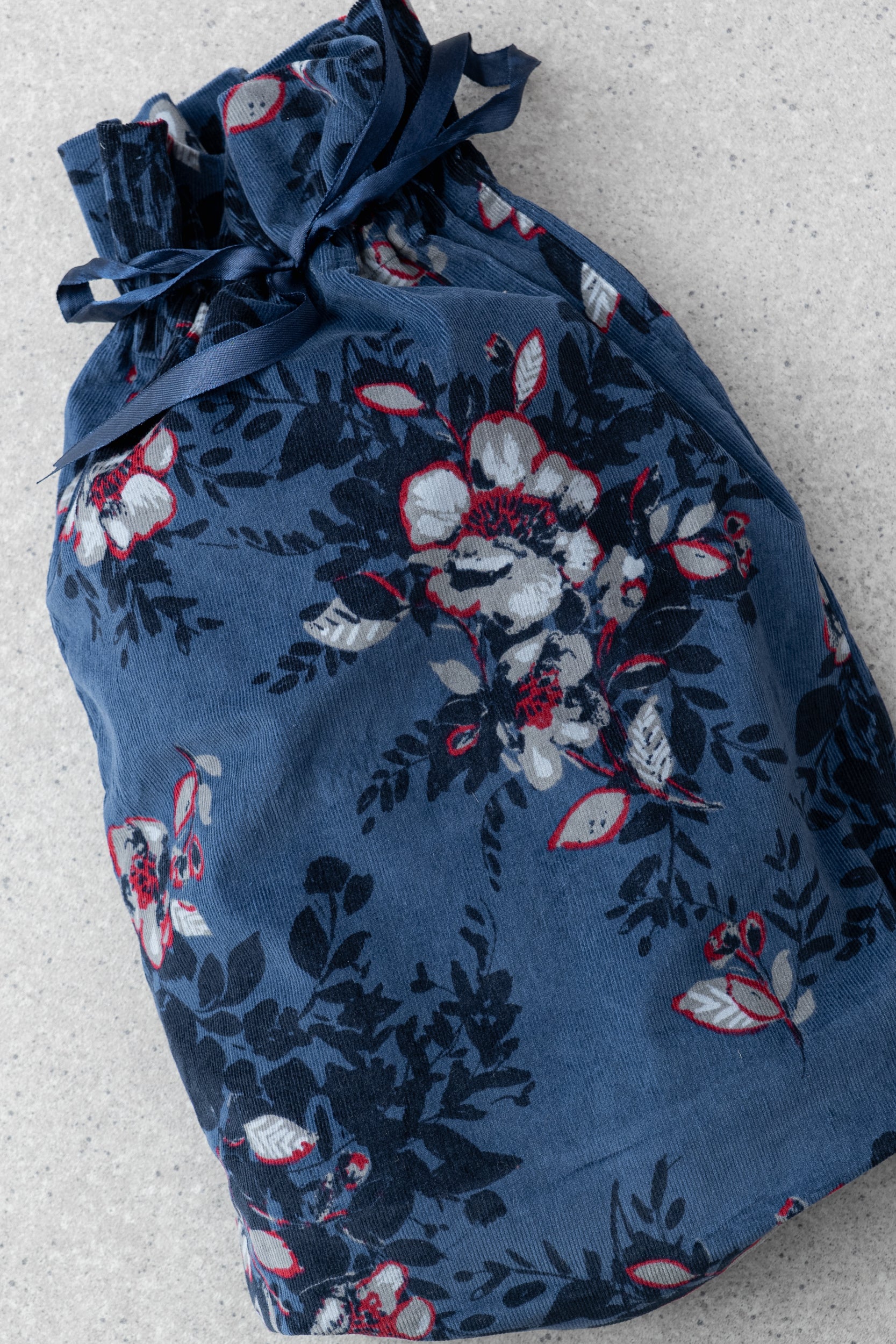 Beautiful printed cord drawstring giftbags. A lovely way to wrap your gifts, our bags offer a sustainable option. Made from soft corduroy and available in a variety of bespoke prints.