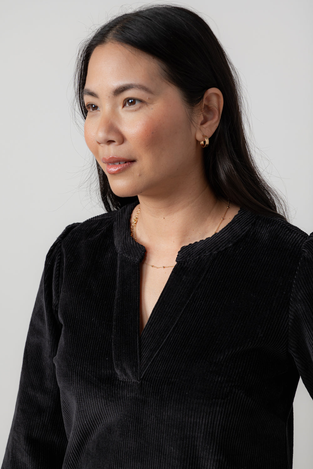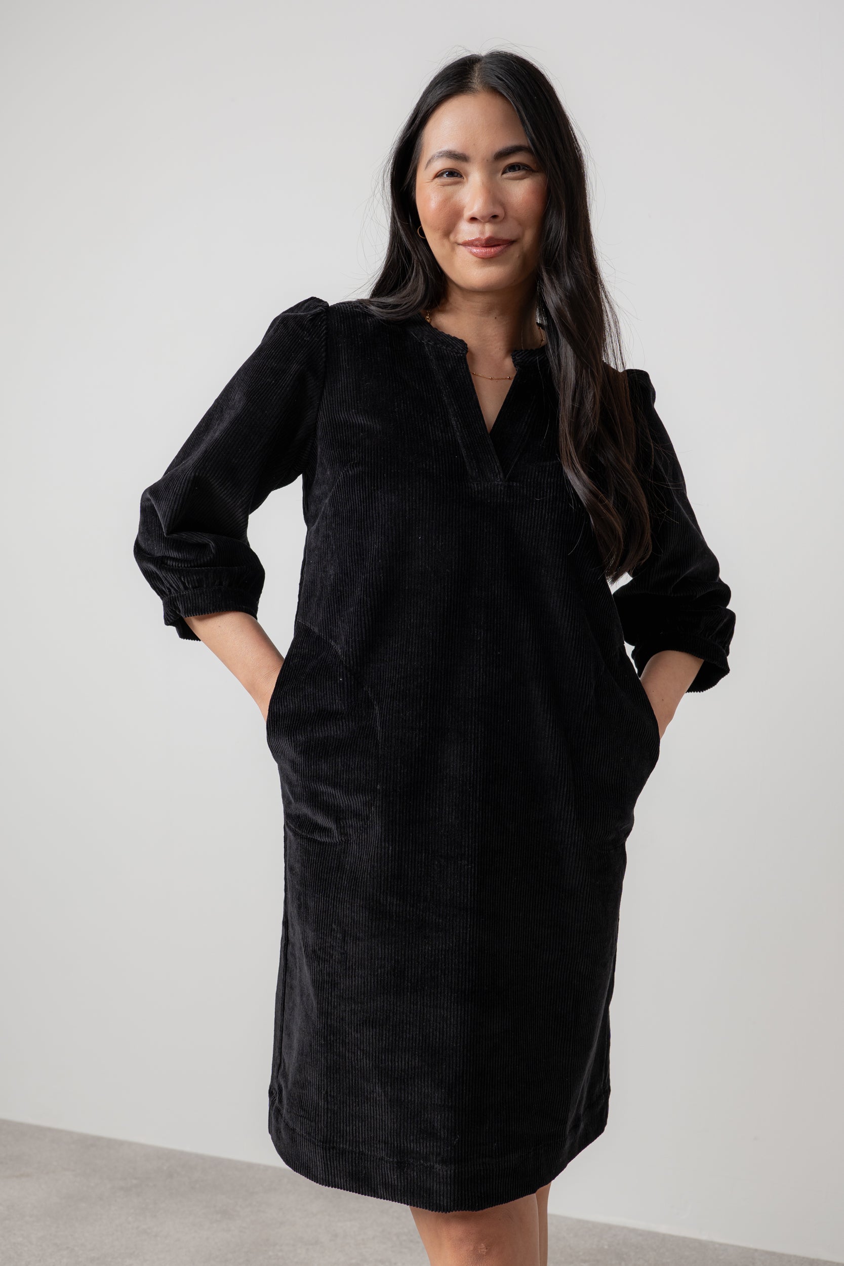New this season, the Harvest Dress is an easy wearing shift shape. Made from soft, tactile jumbo cord with a touch of elastane to give stretch to the fabric for a more comfortable fit. With a mandarin collar, flattering notch neckline and three quarter sleeves.