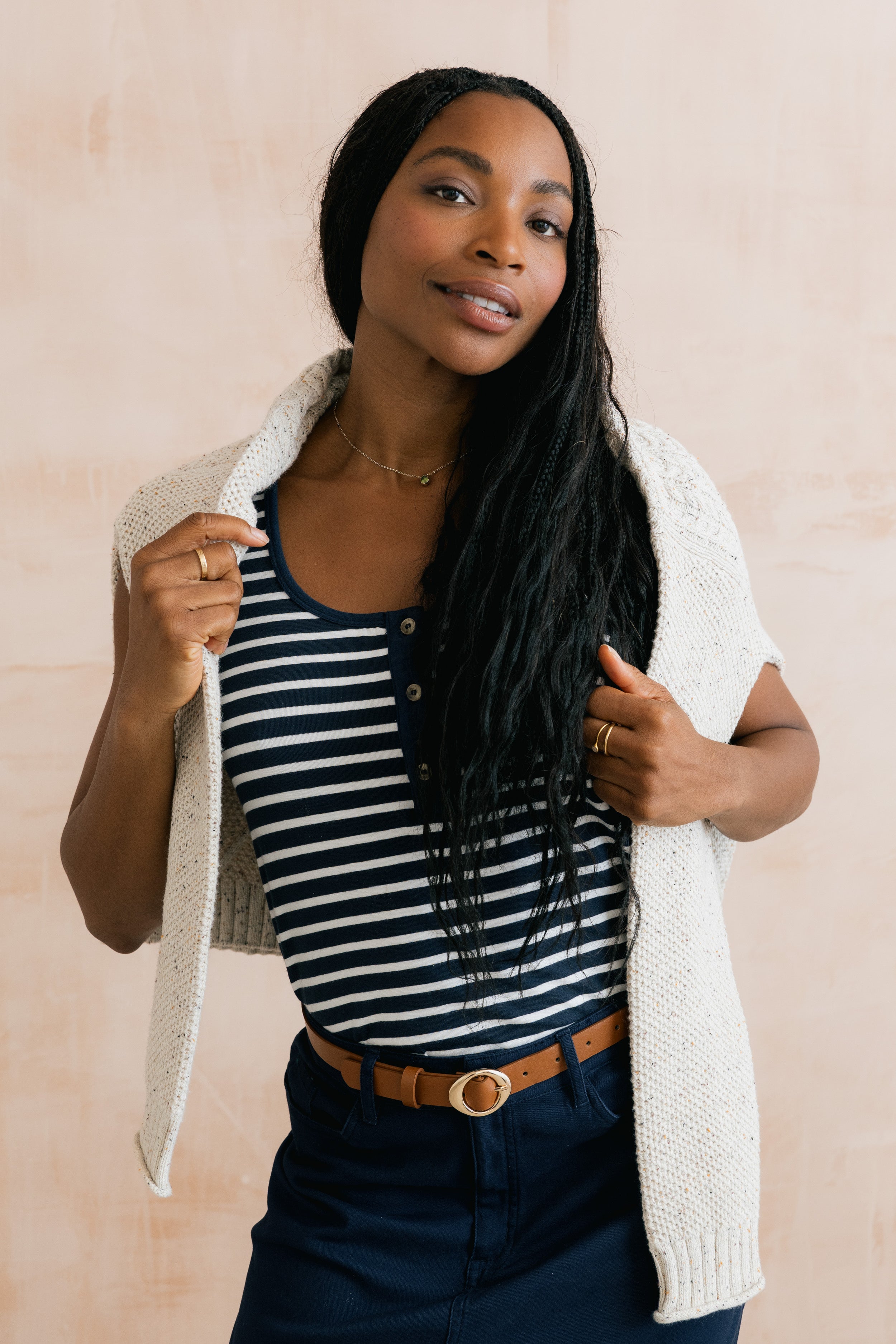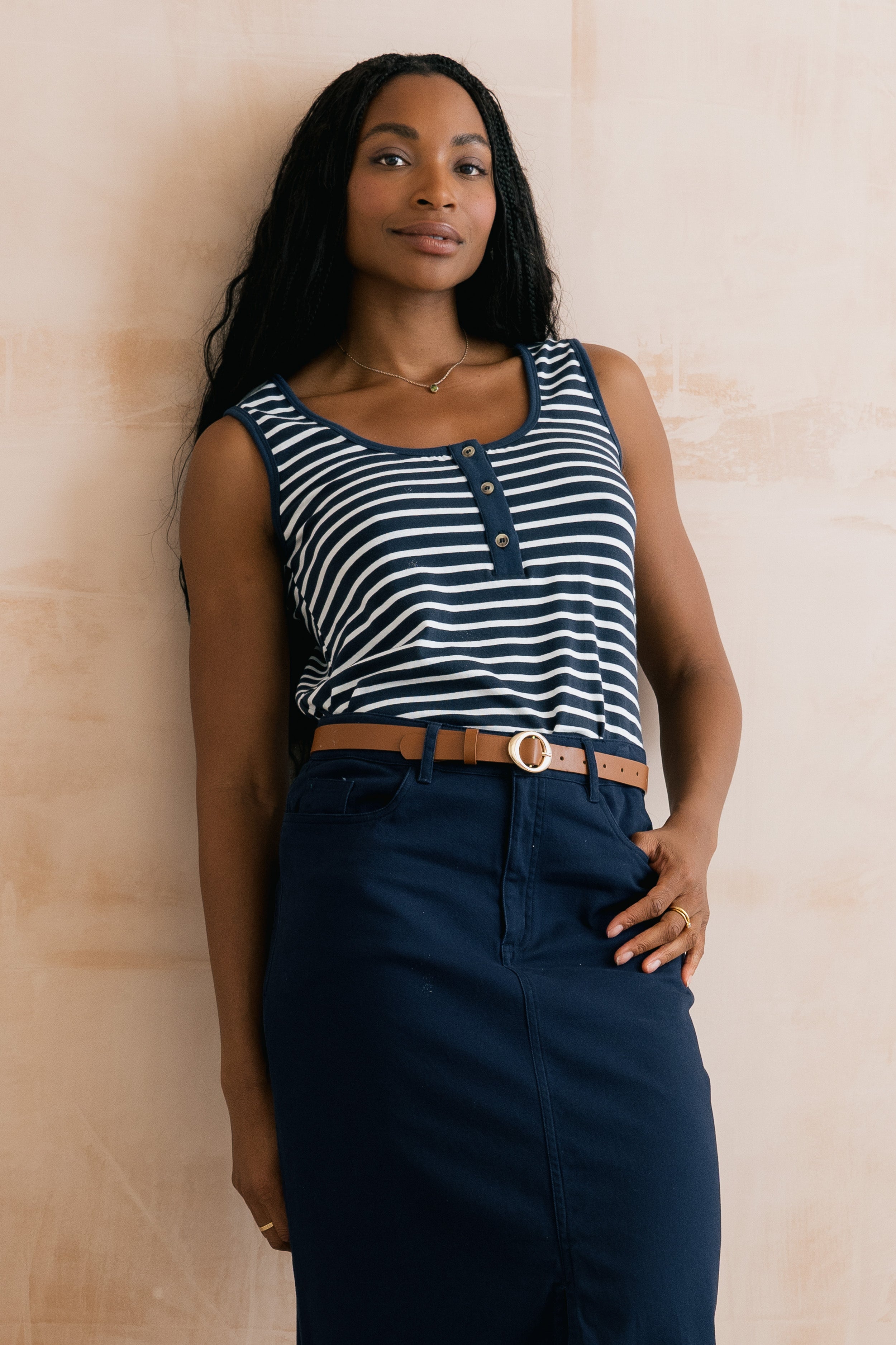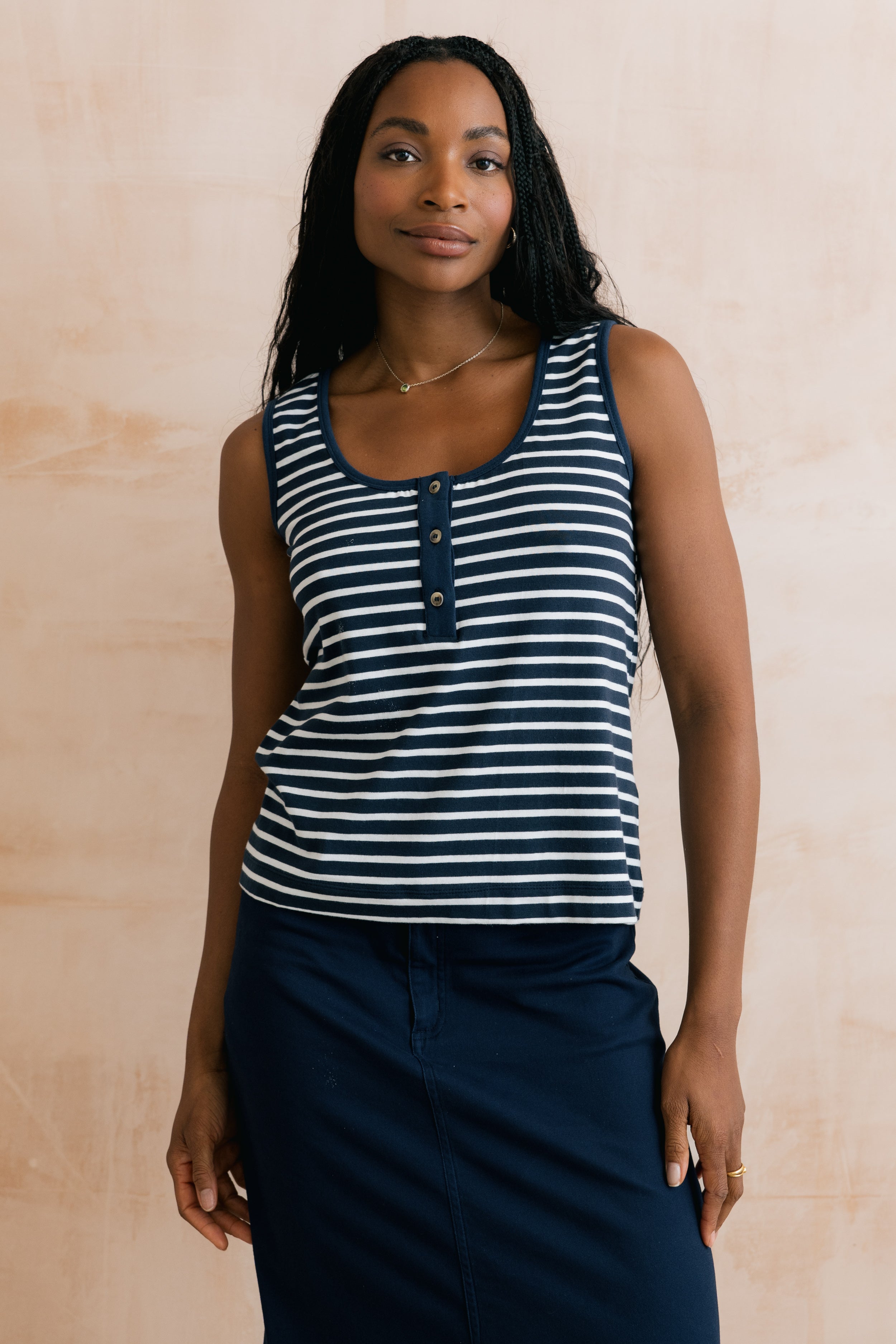 An easy wearing essential, the Haze vest has a deep round neck with a half buttoned placket, built up back and wide straps.