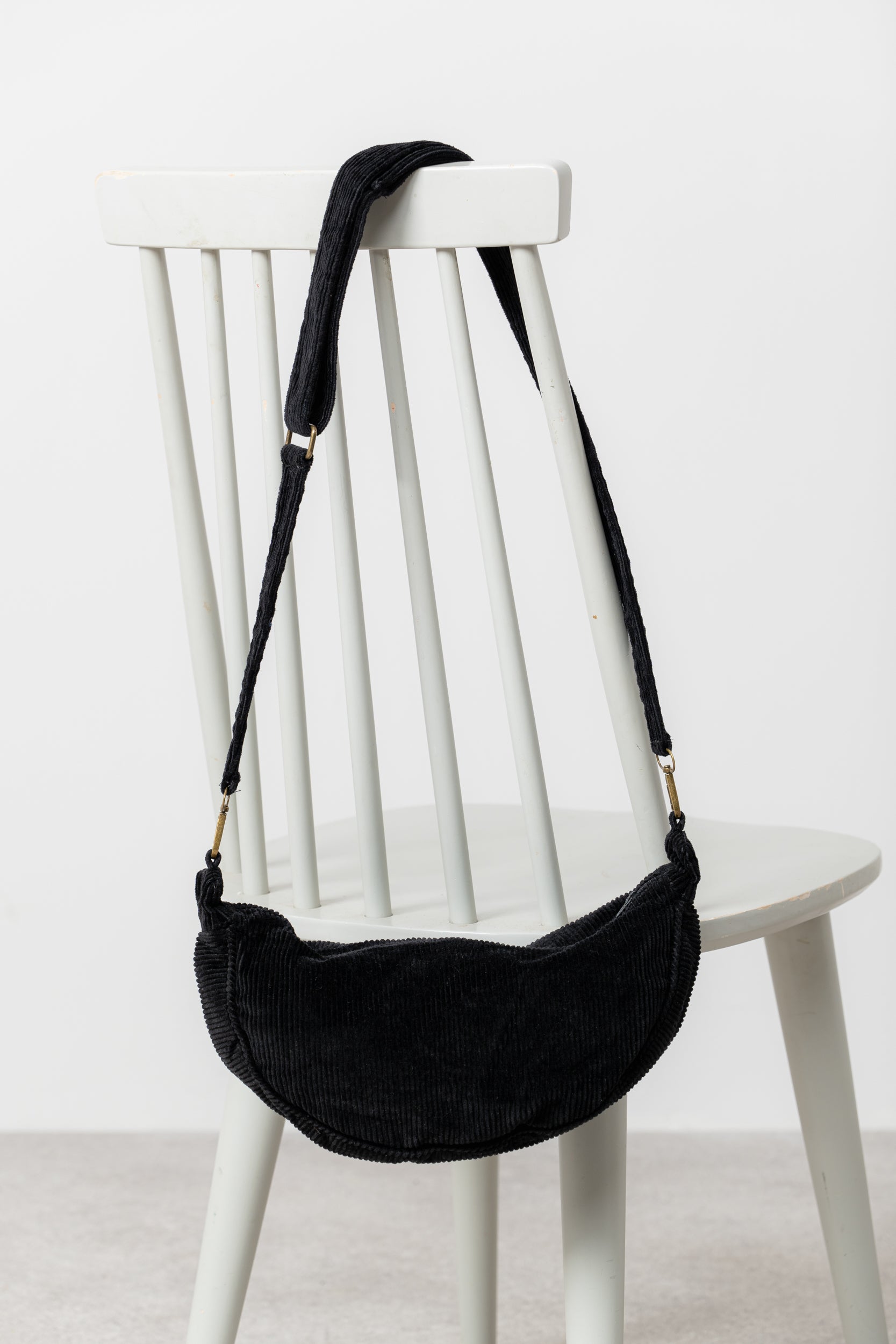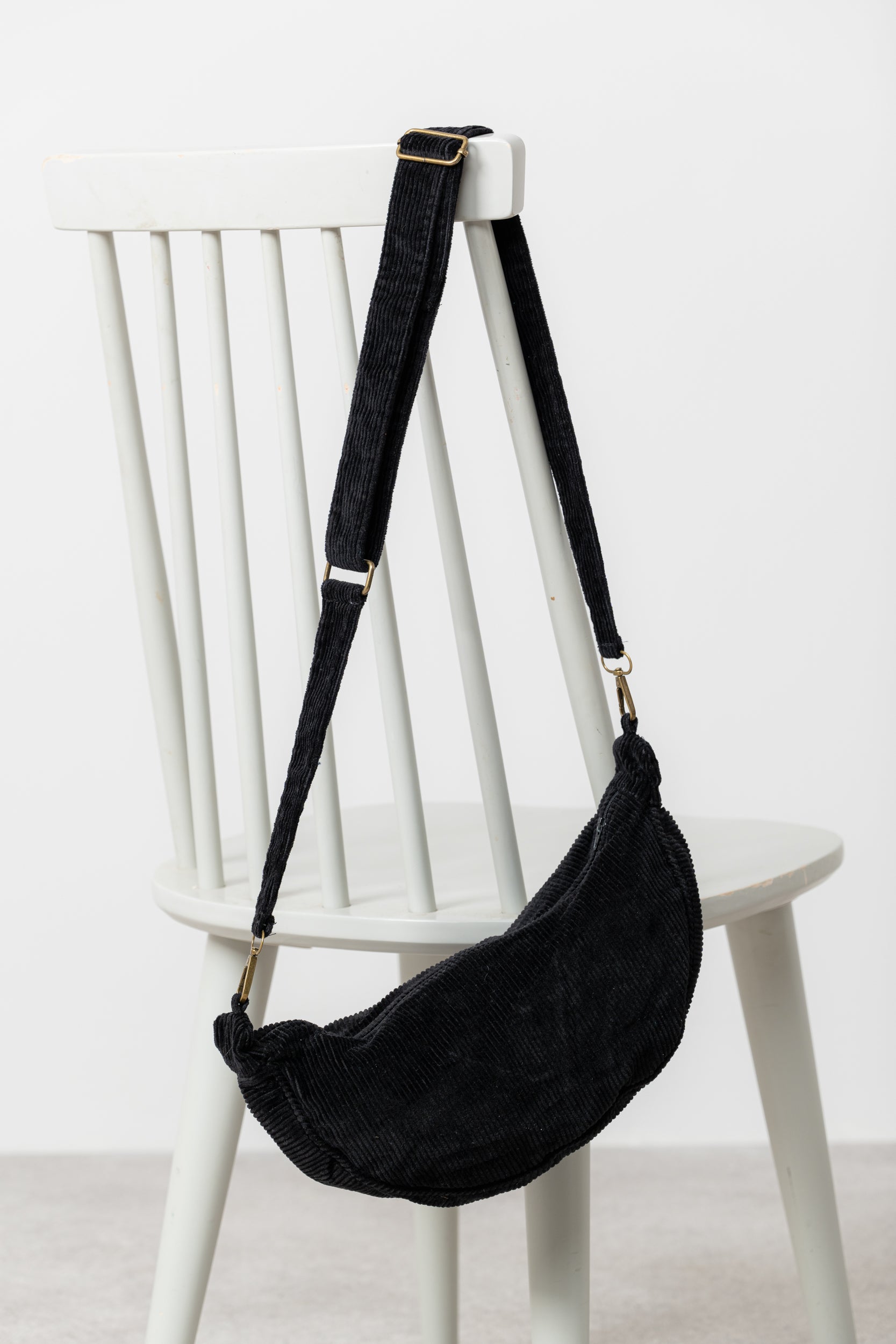 Soft textured jumbo cord fabric with a zip fastening and finished with an adjustable strap and antique brass fixings.