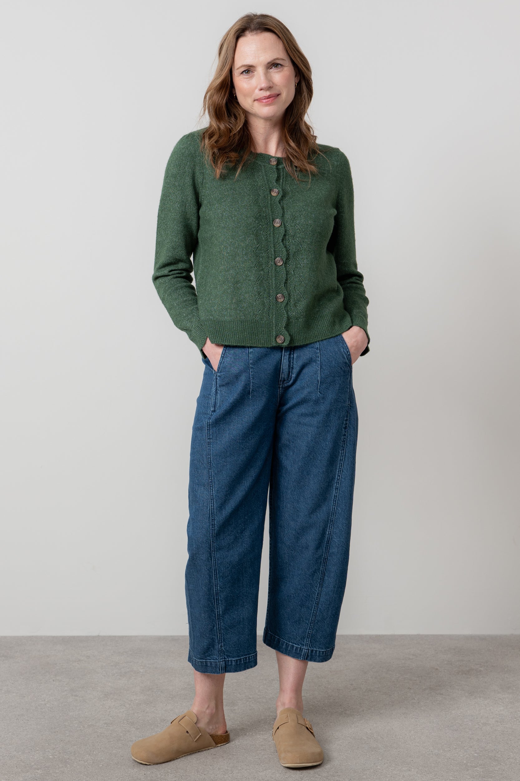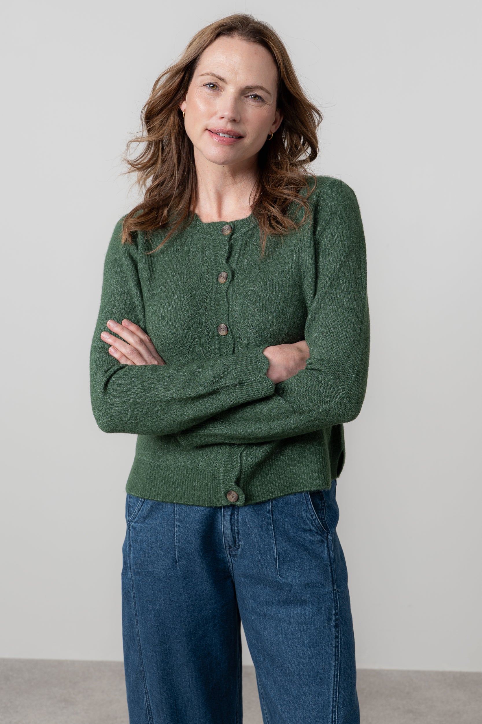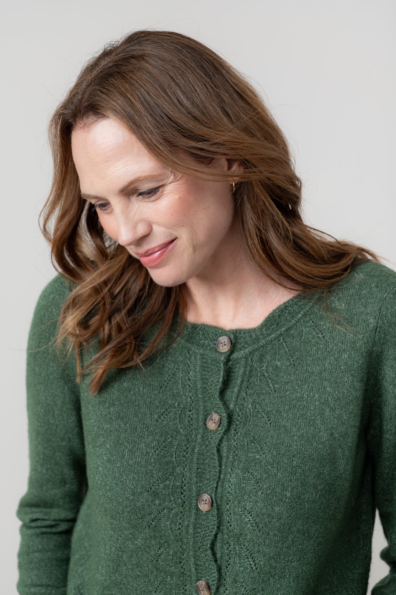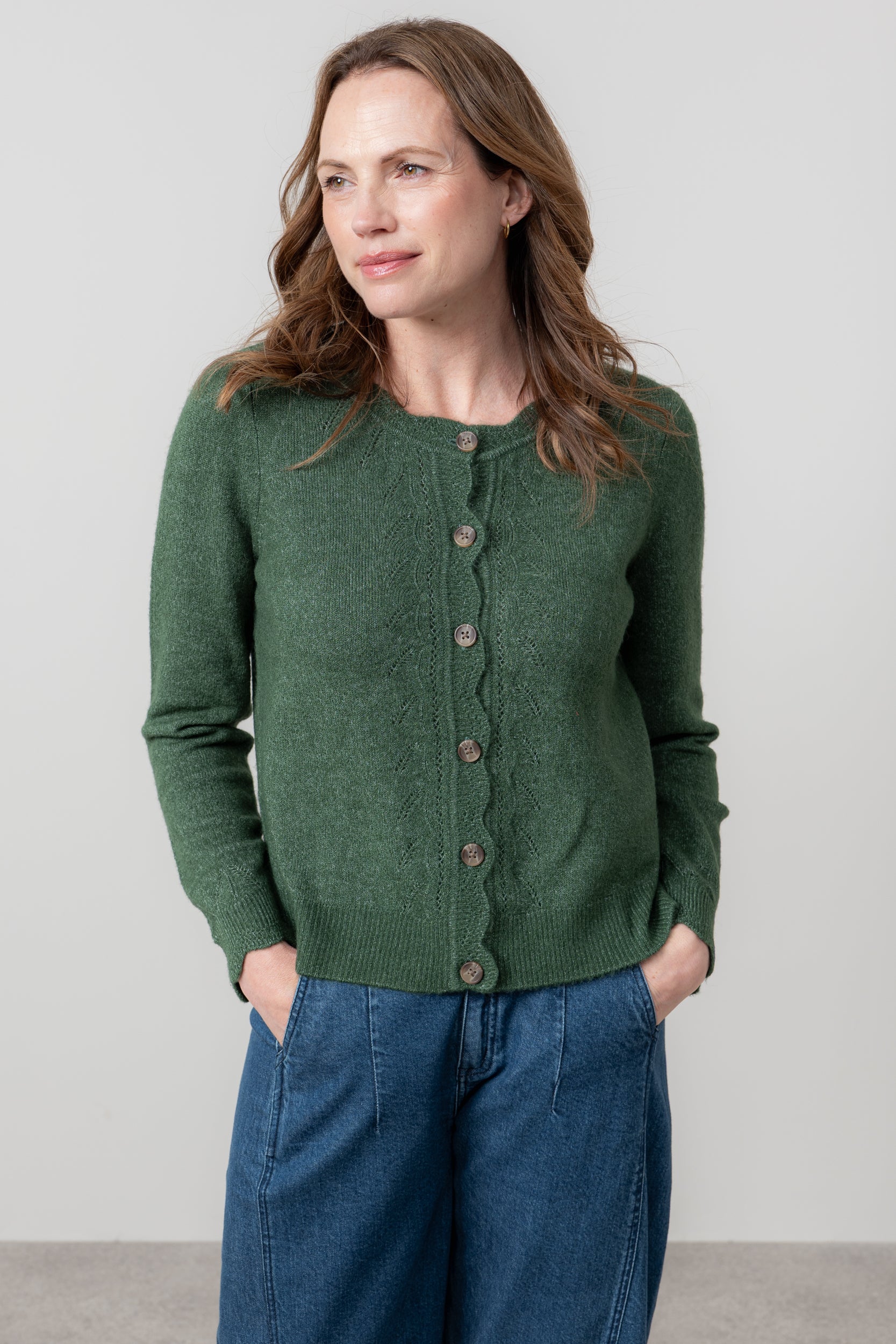 A beautiful pointelle knit cardigan with a pretty scalloped neckline, placket and cuffs. Perfect for outfitting with just about any outfit.