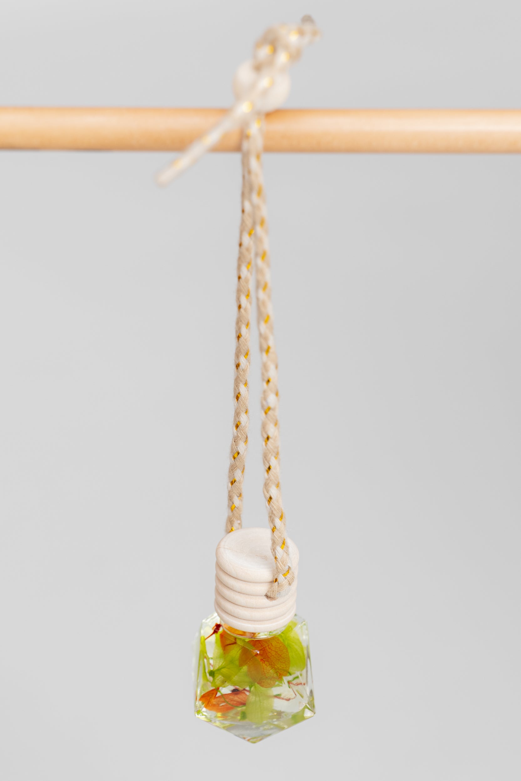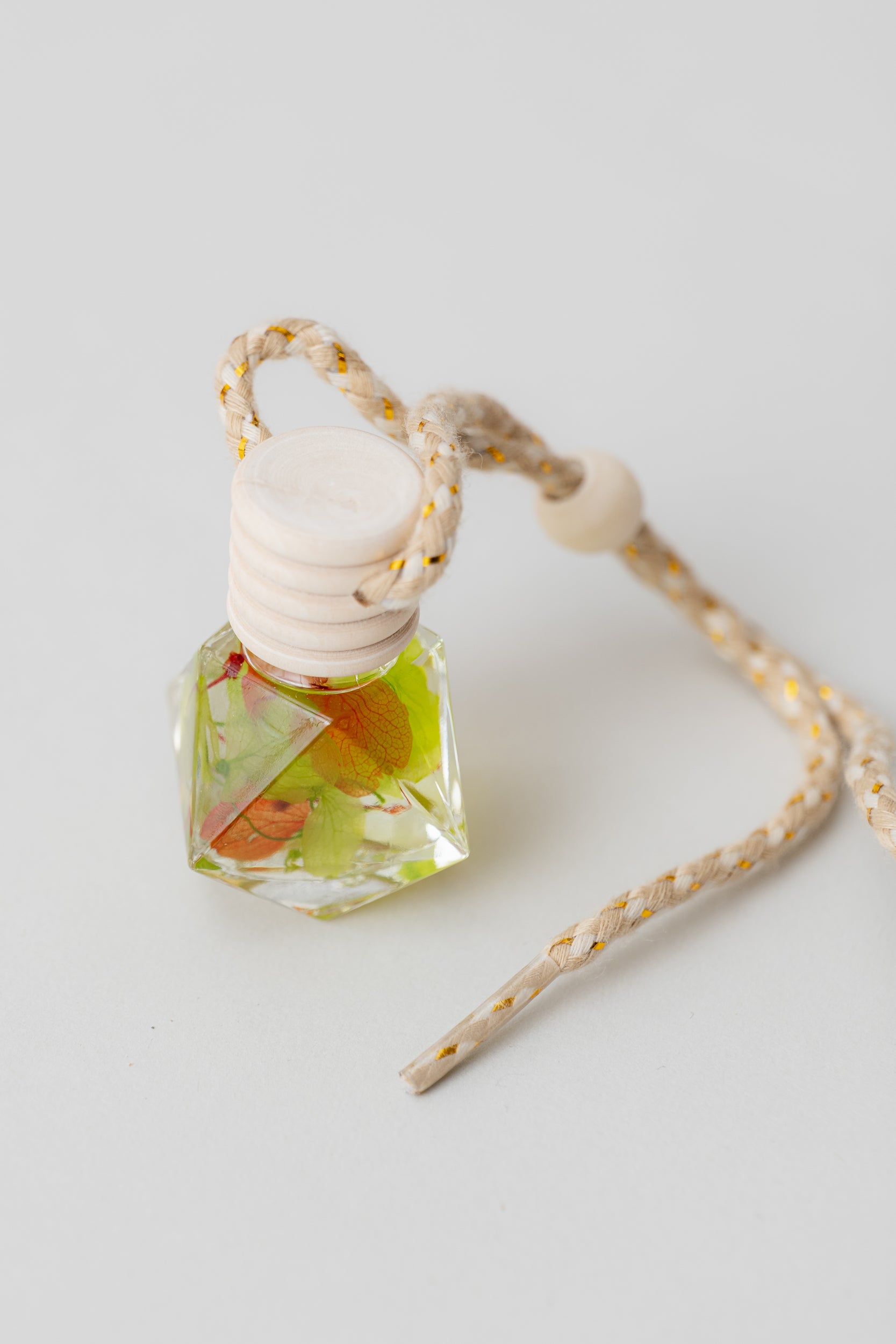 Beautiful mini diffusers, in a variety of scents. Perfect for your car or wardrobe, these versatile glass bottle diffusers have a pretty rope for hanging and a wooden lid to disperse the scent. Filled with mood boosting scent and dried hydrangea petals.