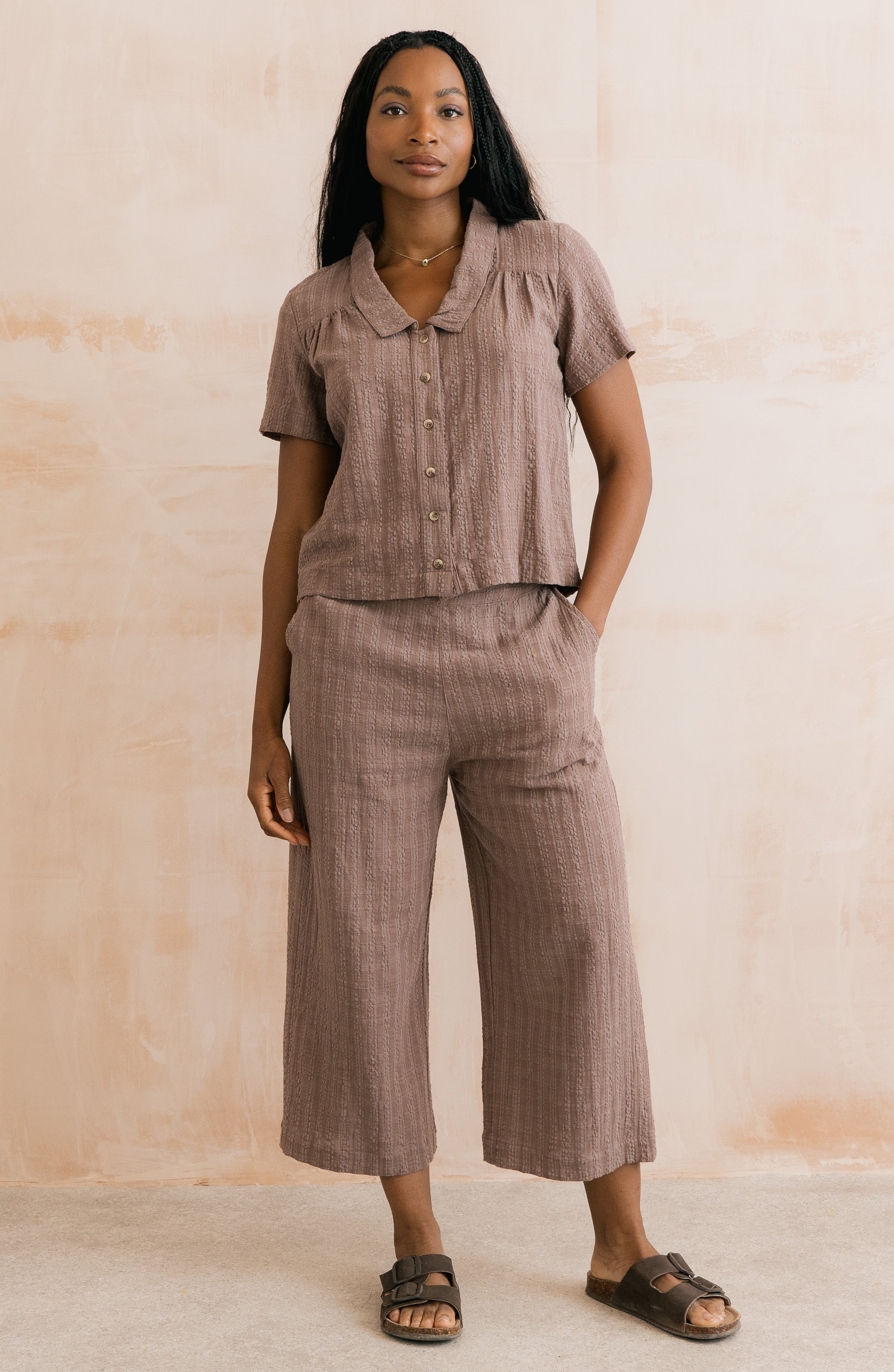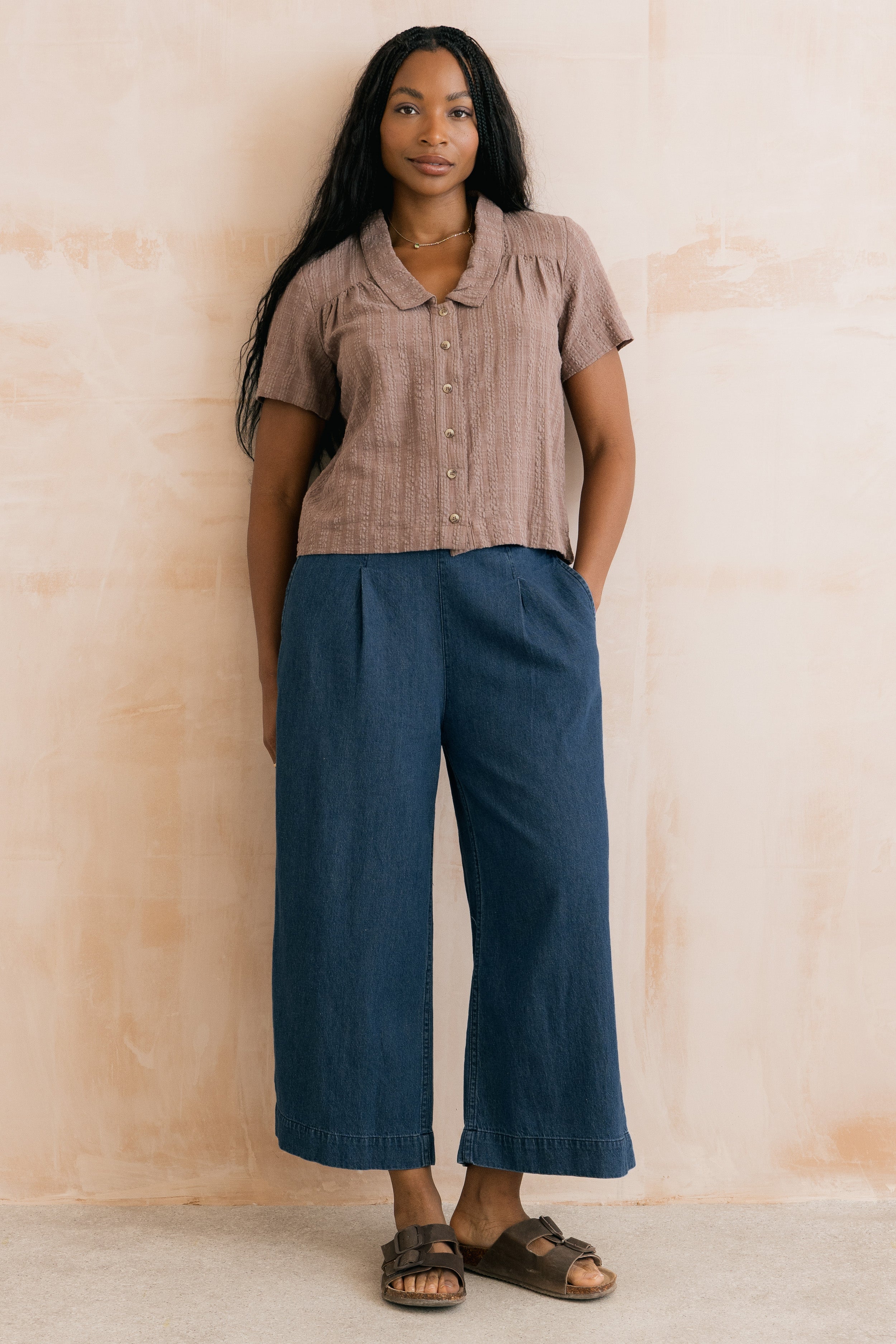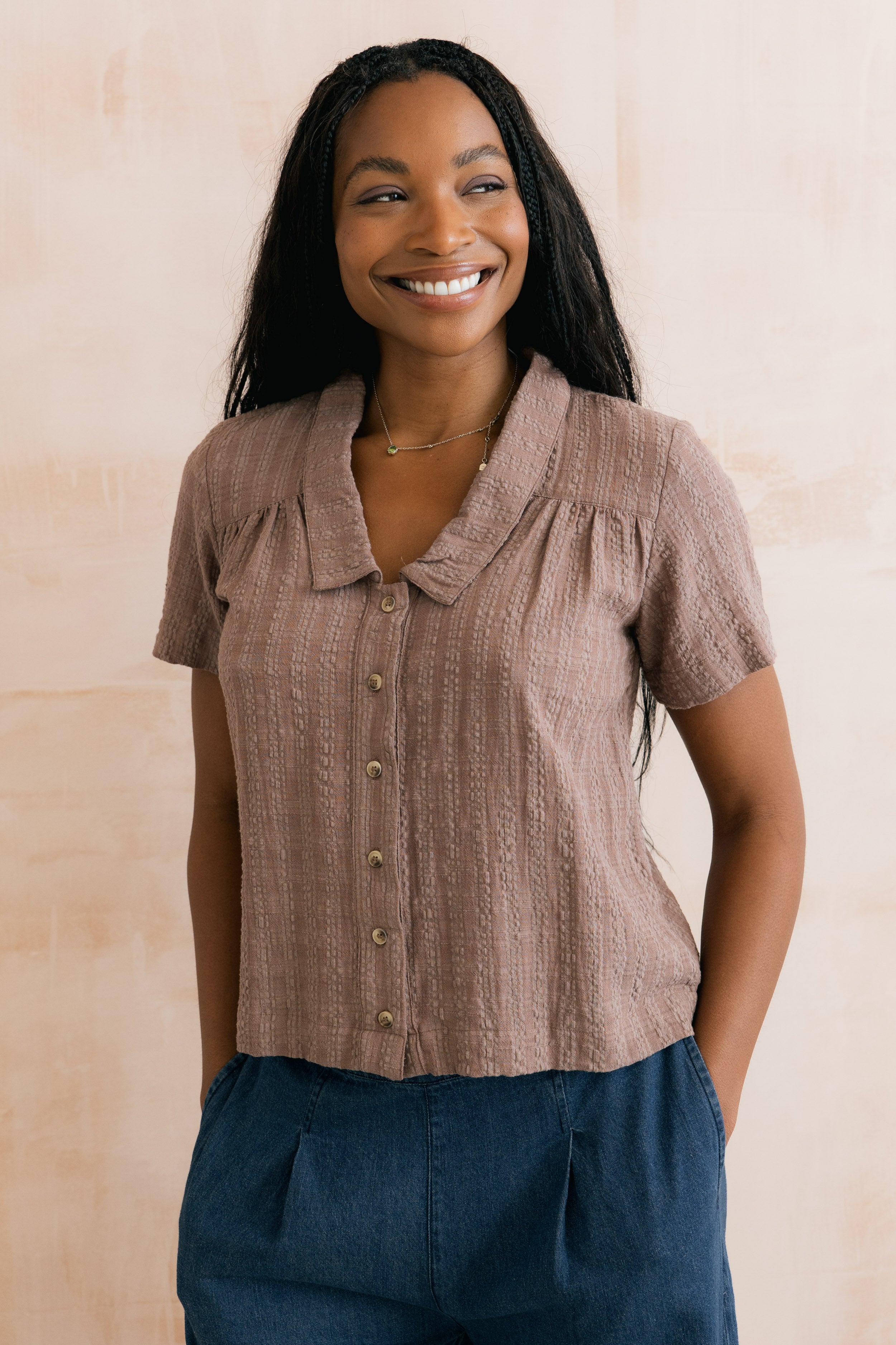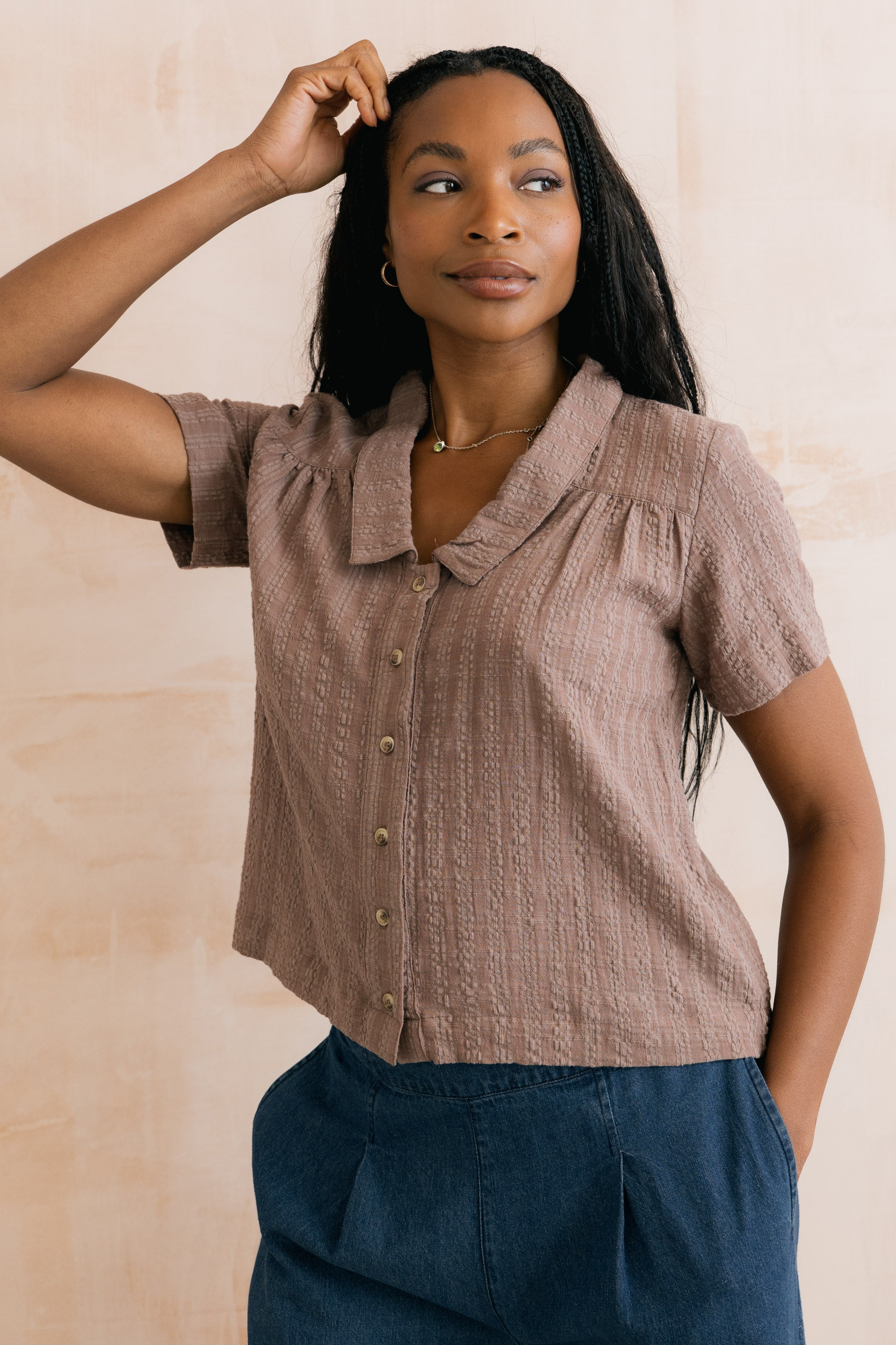 This cute boxy fit shirt is made from textured organic cotton seersucker blended with viscose for a soft handfeel. With a relaxed shape, gather detail at the front yoke seam and an on-trend vintage-inspired collar, the Lowlands is an elevated take on a classic summer shirt.