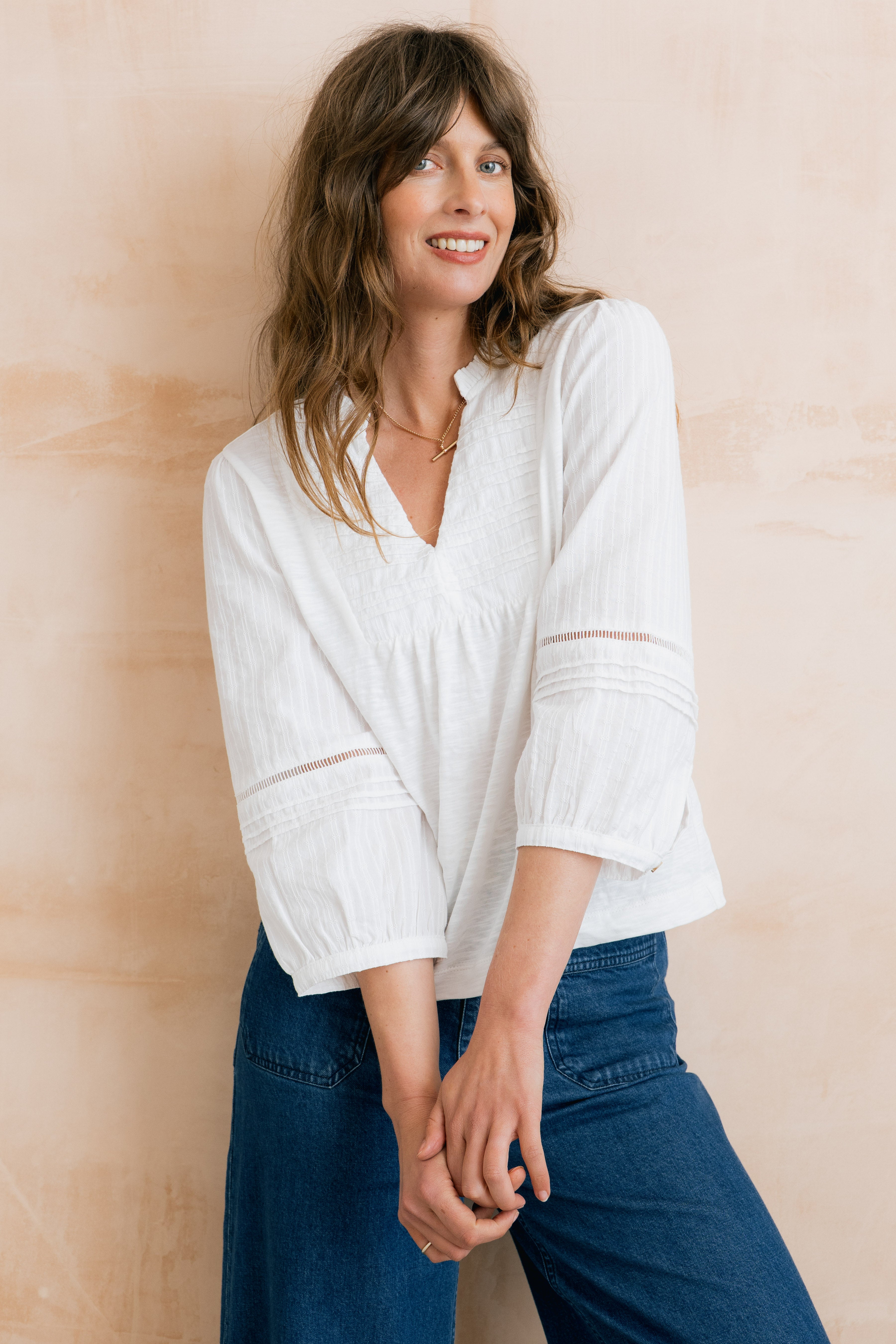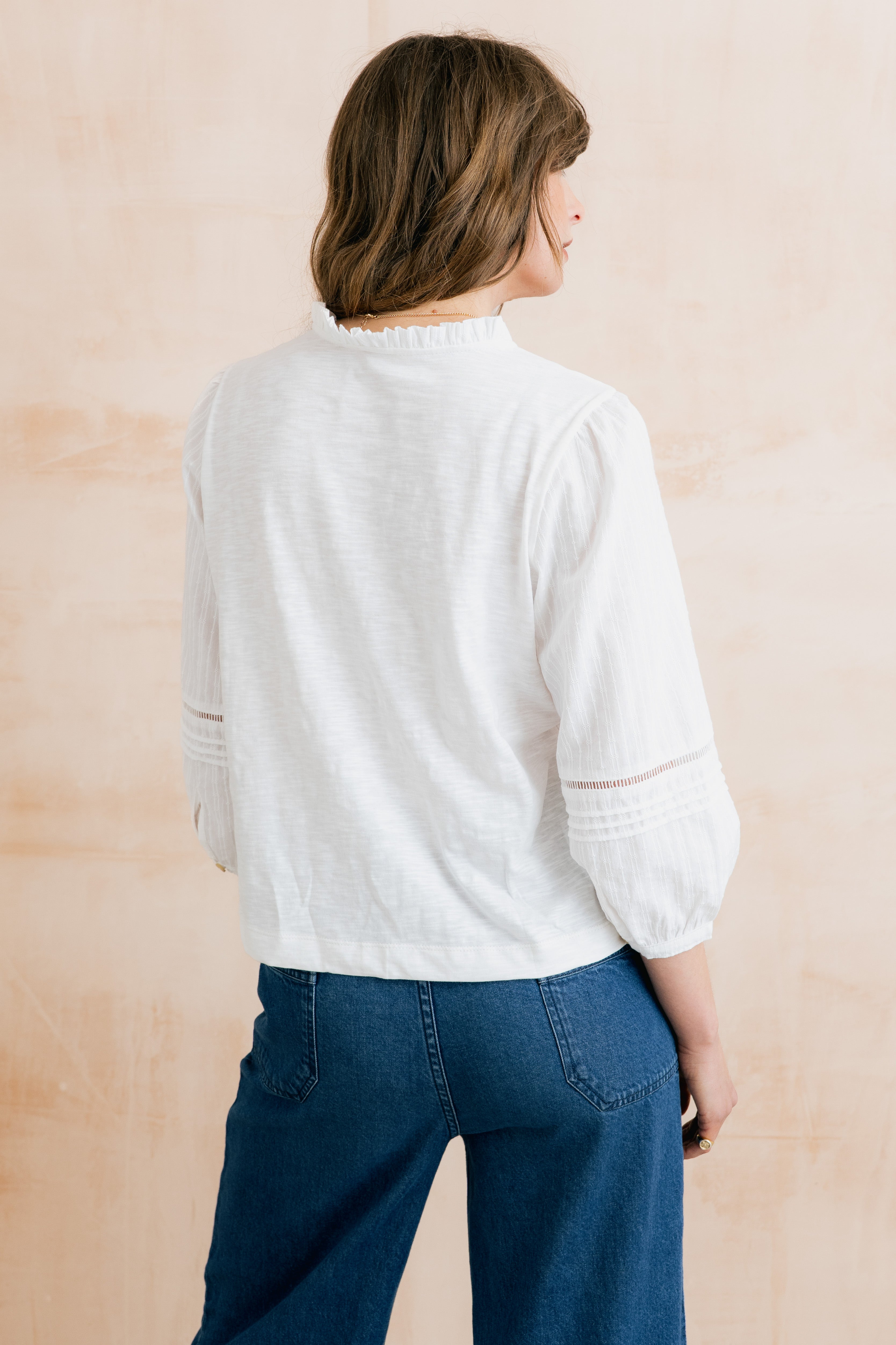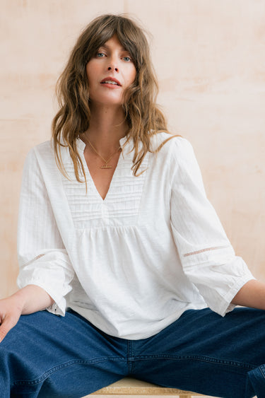 A stylish organic cotton jersey blouse with beautiful embroidered cotton sleeves and pintuck detailing at the neckline. Lace trim inserts and added pintucks at the sleeves offer further delicate detailing.