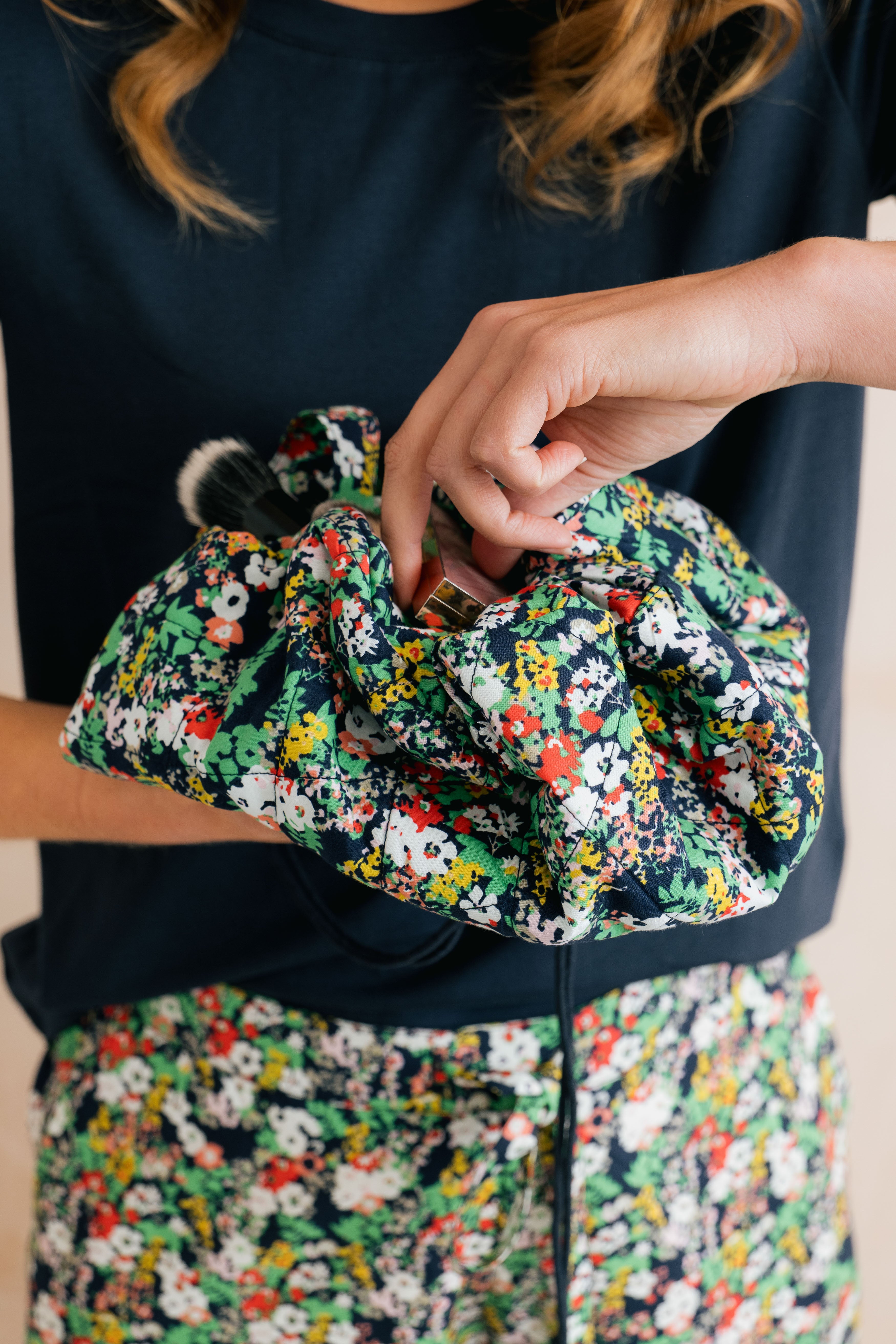 This quilted cotton make up pouch lays flat, letting you see all of your cosmetics in an instant! Handy elasticated hoops hold your brushes and kit in place and a drawstring and handle allow you to close and transport all your make-up essentials.