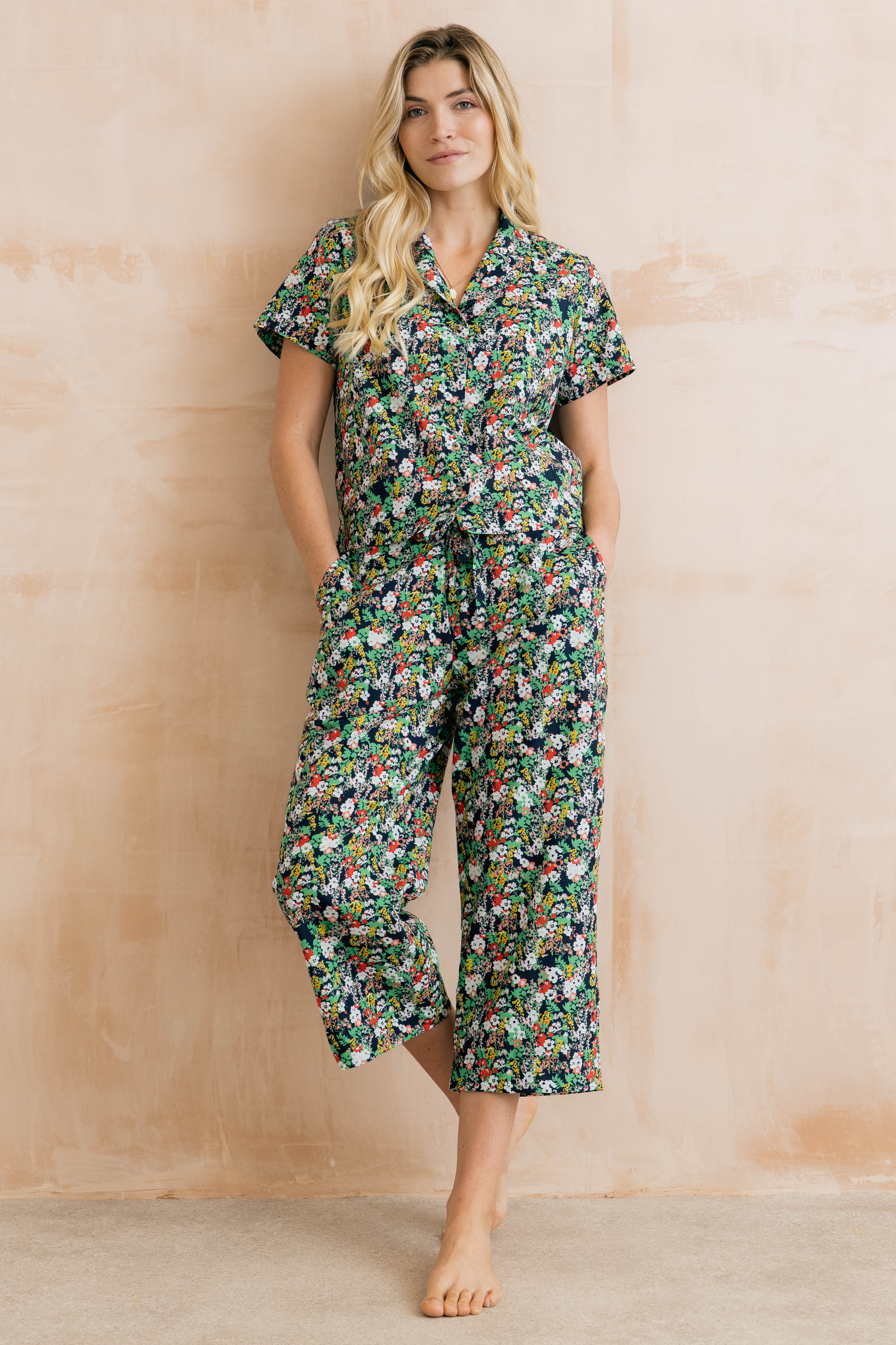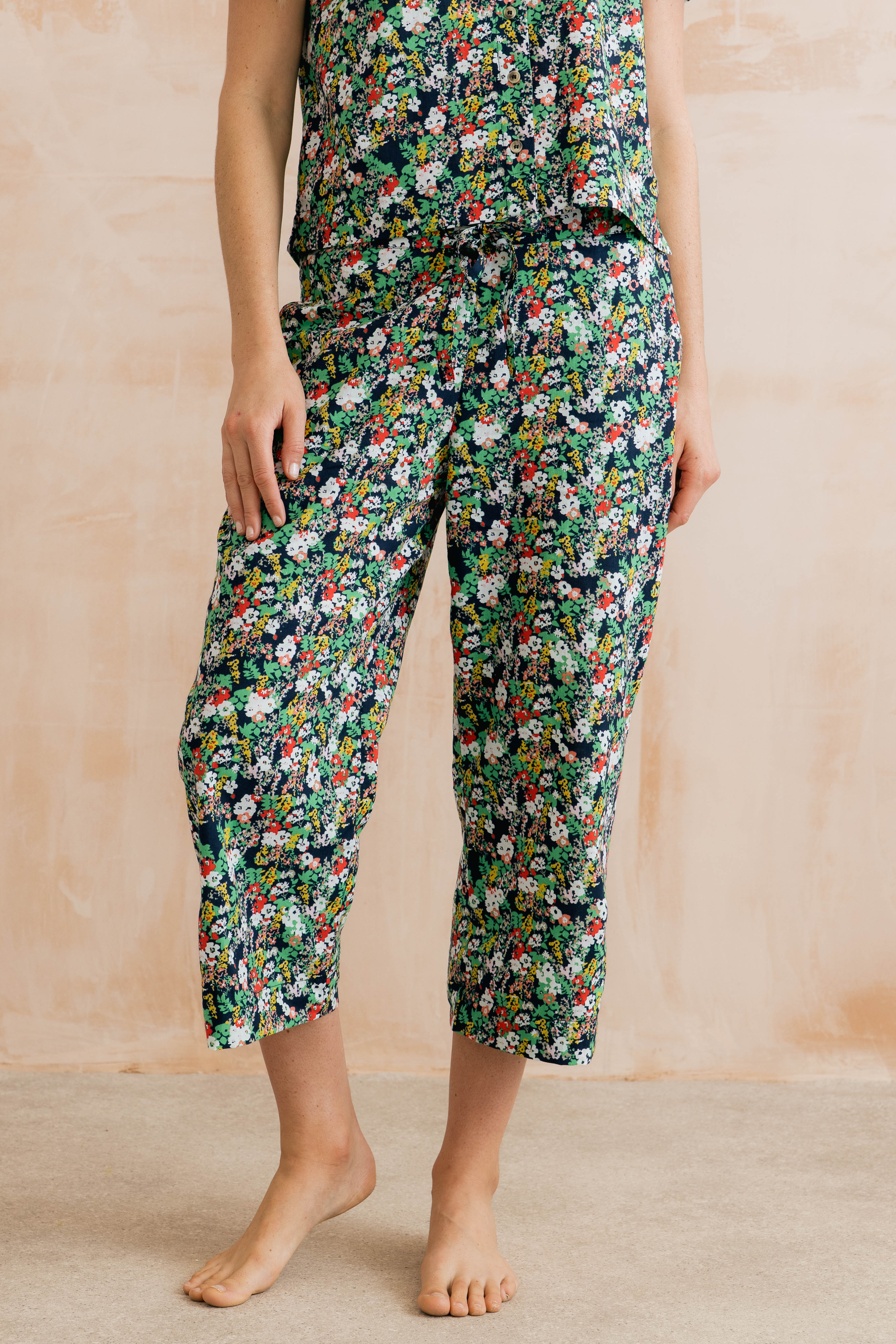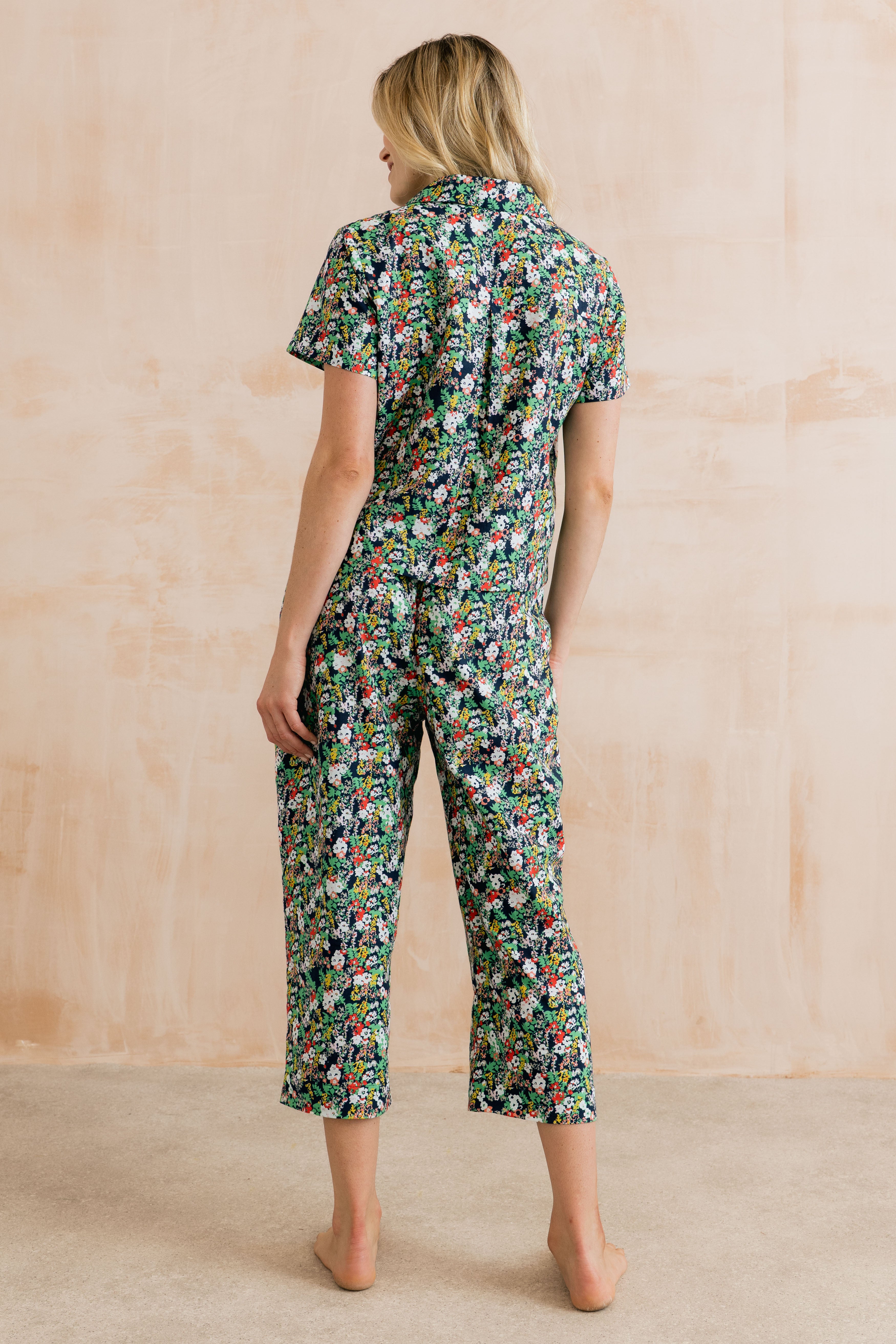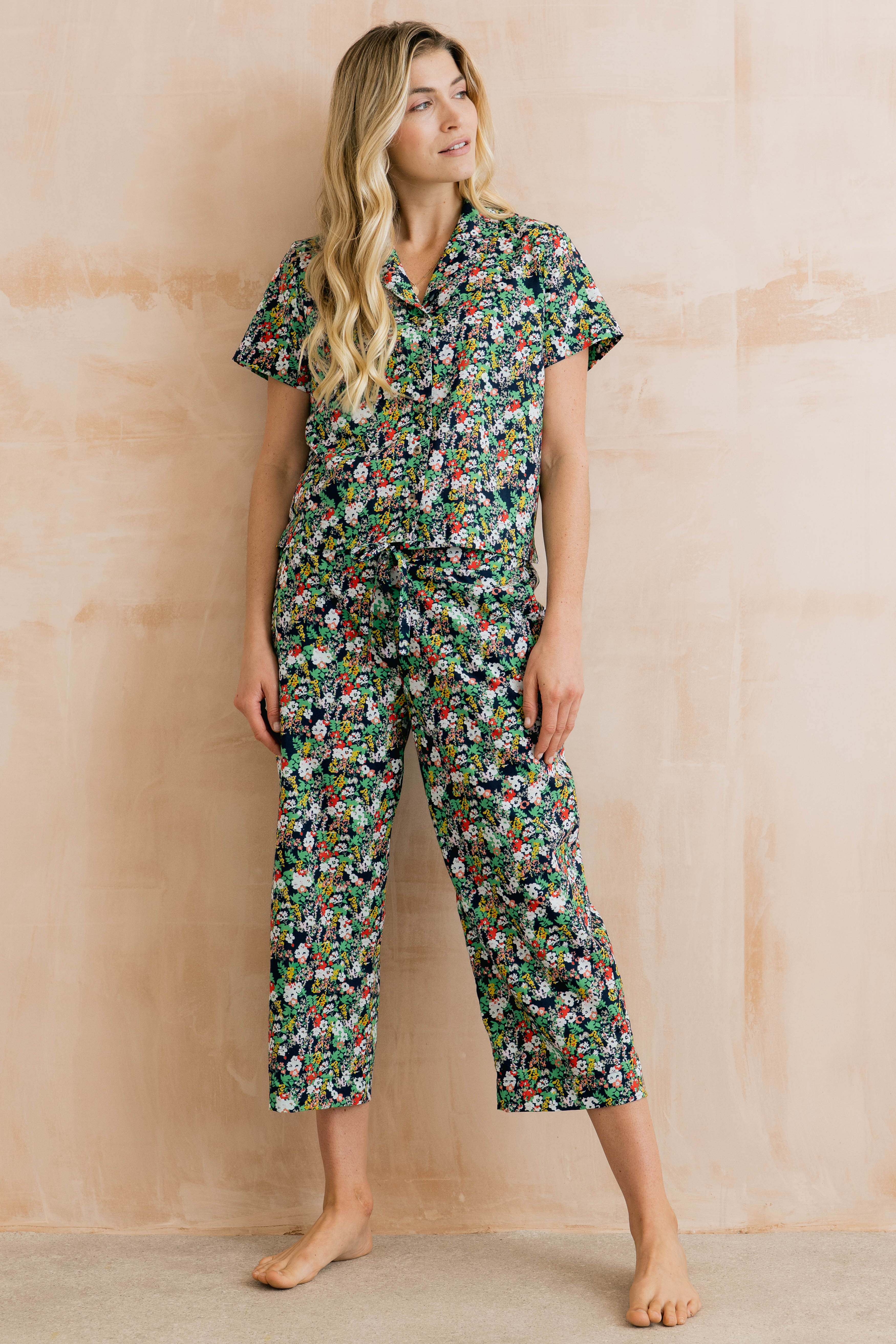 Our organic cotton Mayflower Crop Pyjama Set is a comfortable choice for the warmer months. Designed in a relaxed fit, the short-sleeved top is paired with cropped-length bottoms for a lighter, breathable feel on milder nights. Featuring a delicate Mayflower print on a navy base, the set is presented in a matching drawstring bag – perfect for treating yourself or gifting.