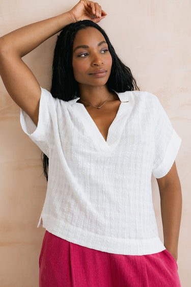 Seamless sleeves with turn back cuff detail adds to the relaxed, modern silhouette. Made from textured organic cotton seersucker blended with viscose for a soft handfeel.