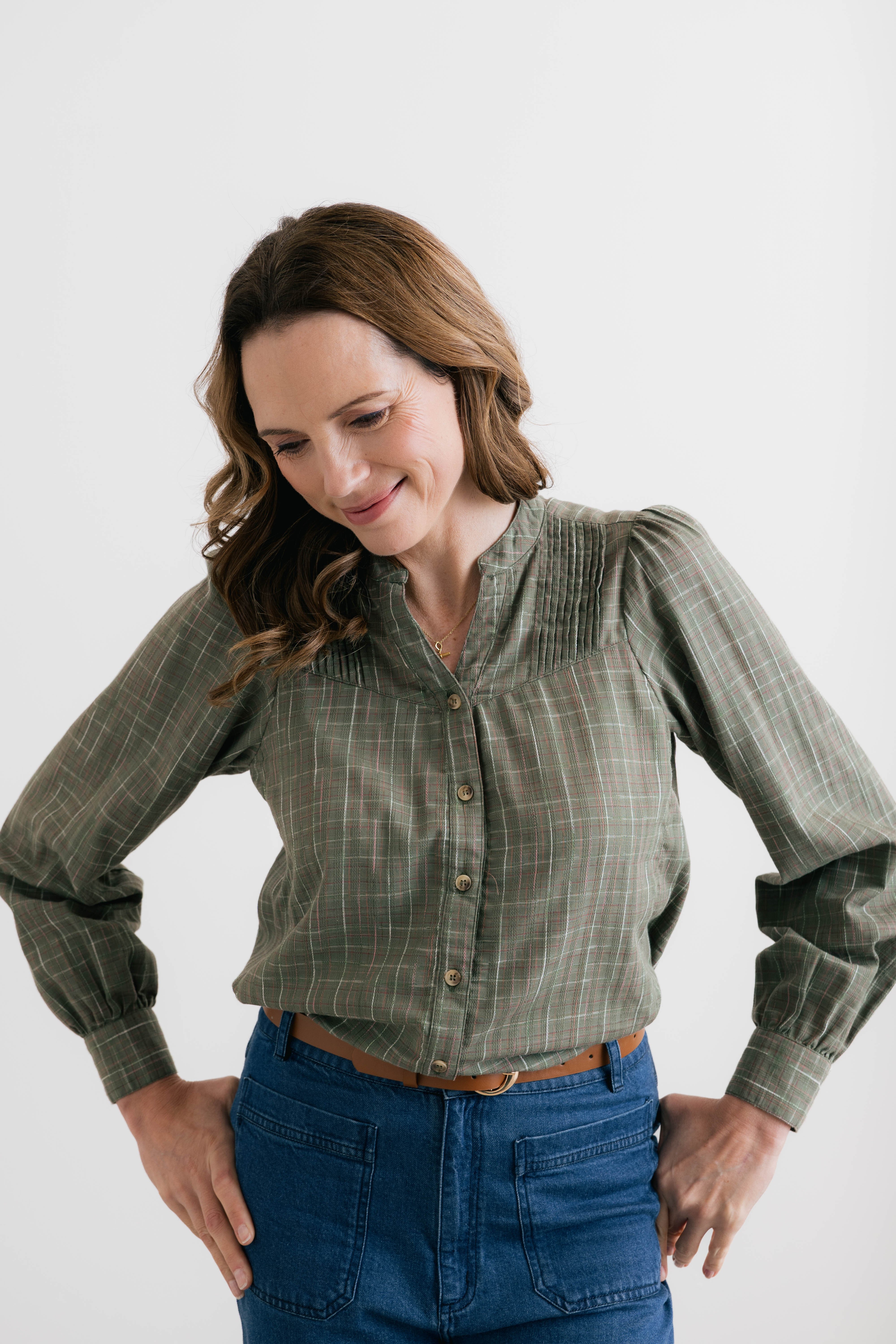 A pretty take on a classic check shirt. The Poplar has a relaxed shape with a simple mandarin collar, v-neckline and delicate gather from the front and back yoke seams.