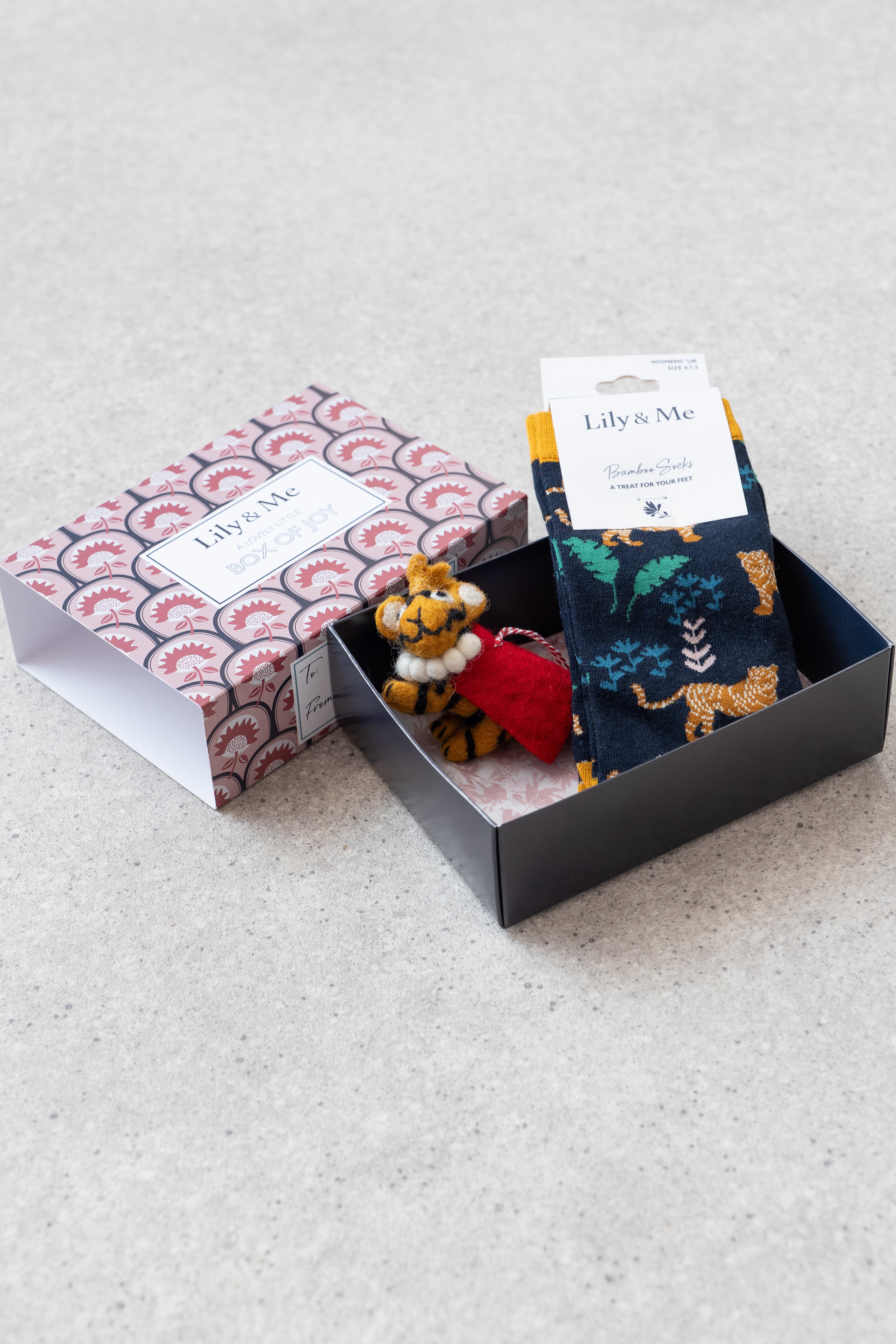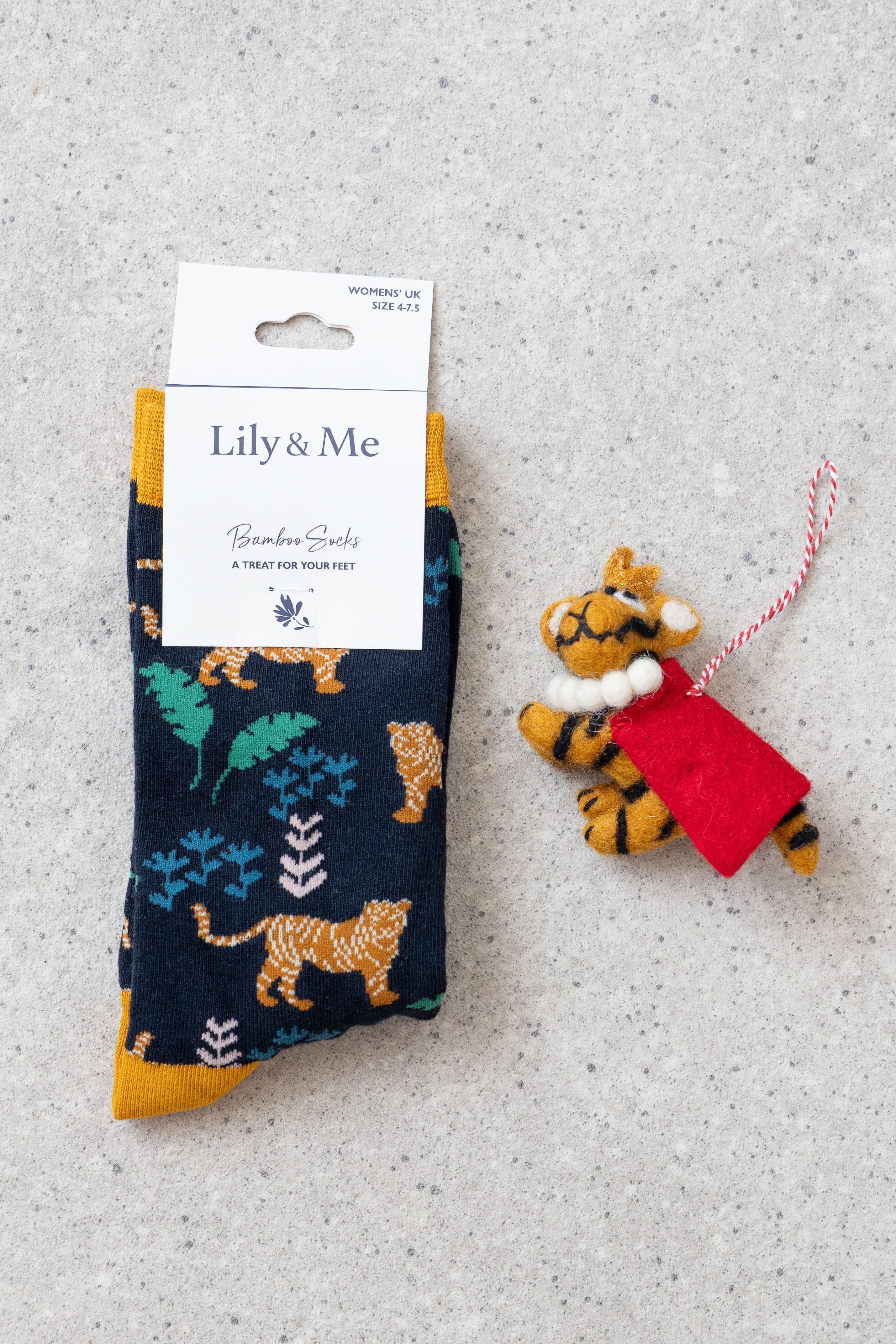 Including a pair of super soft bamboo socks in our Tiger print and a matching tiger tree decoration.