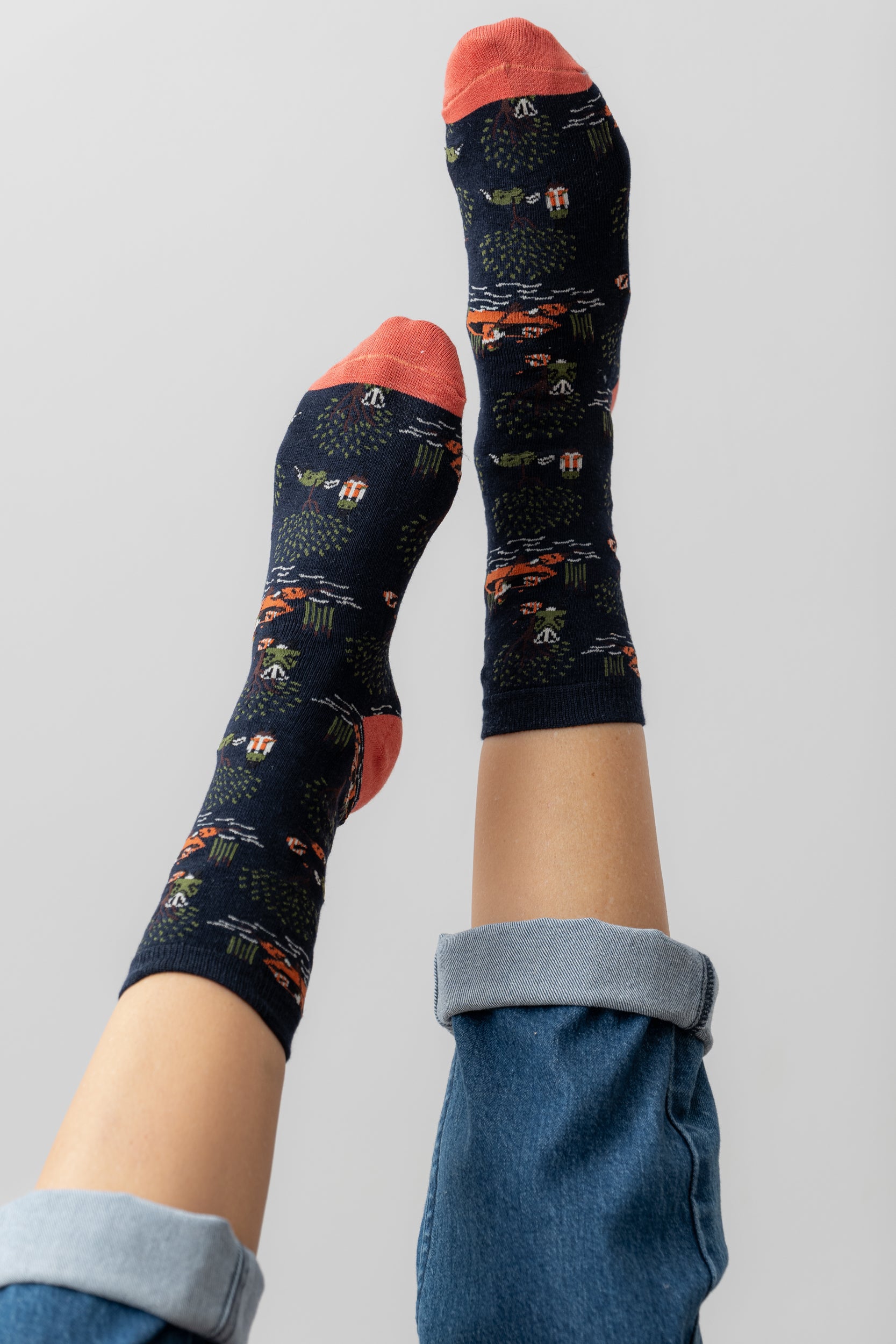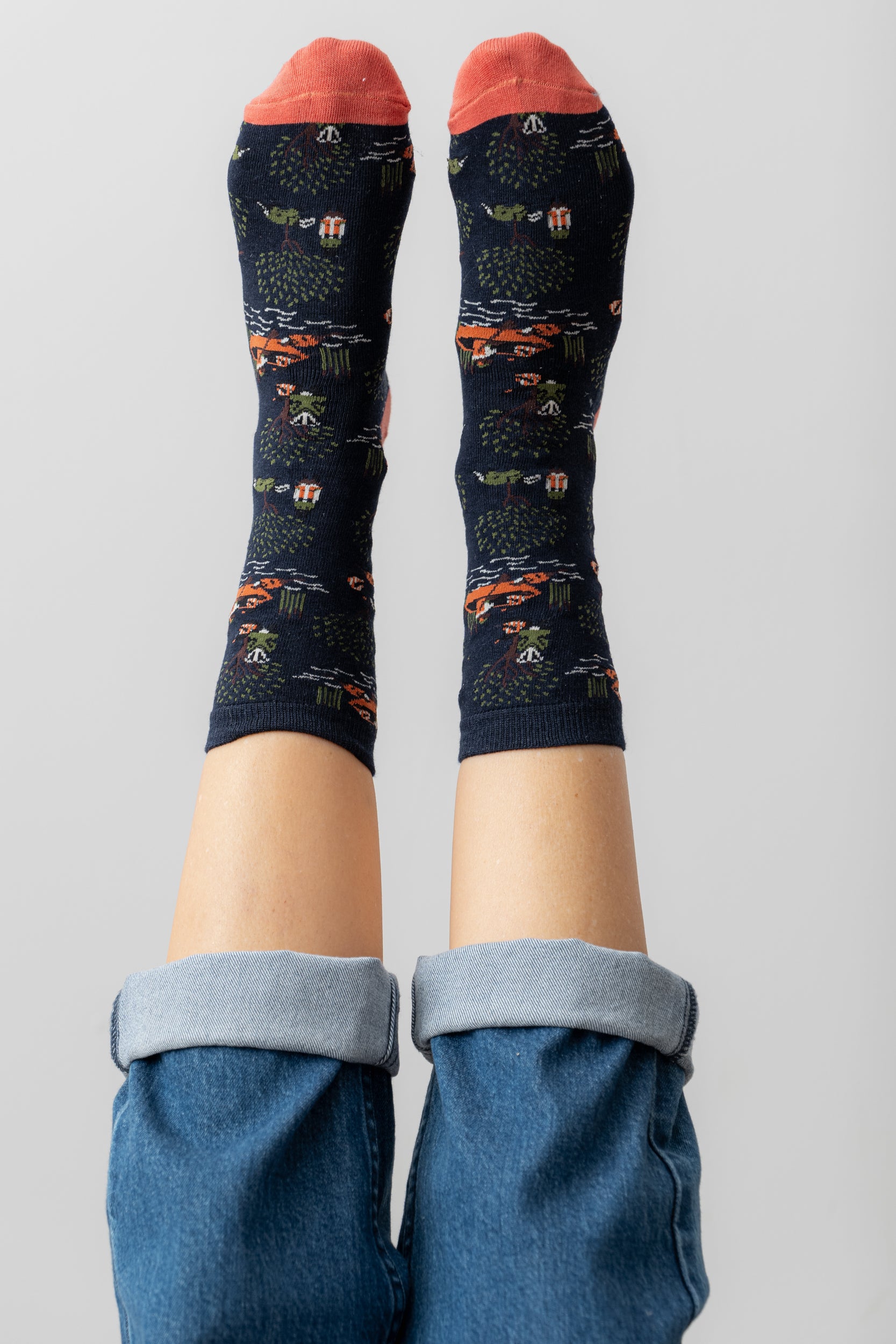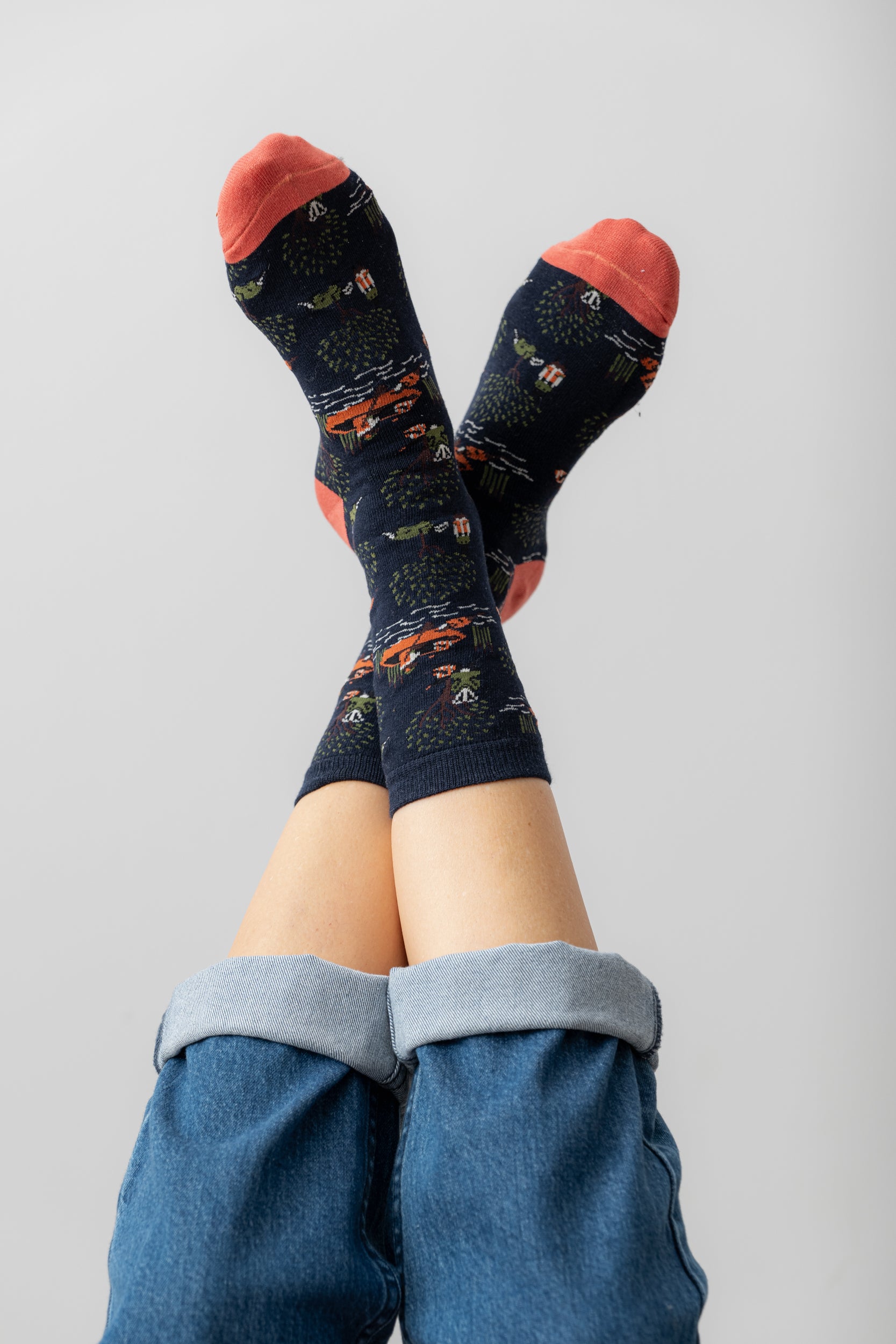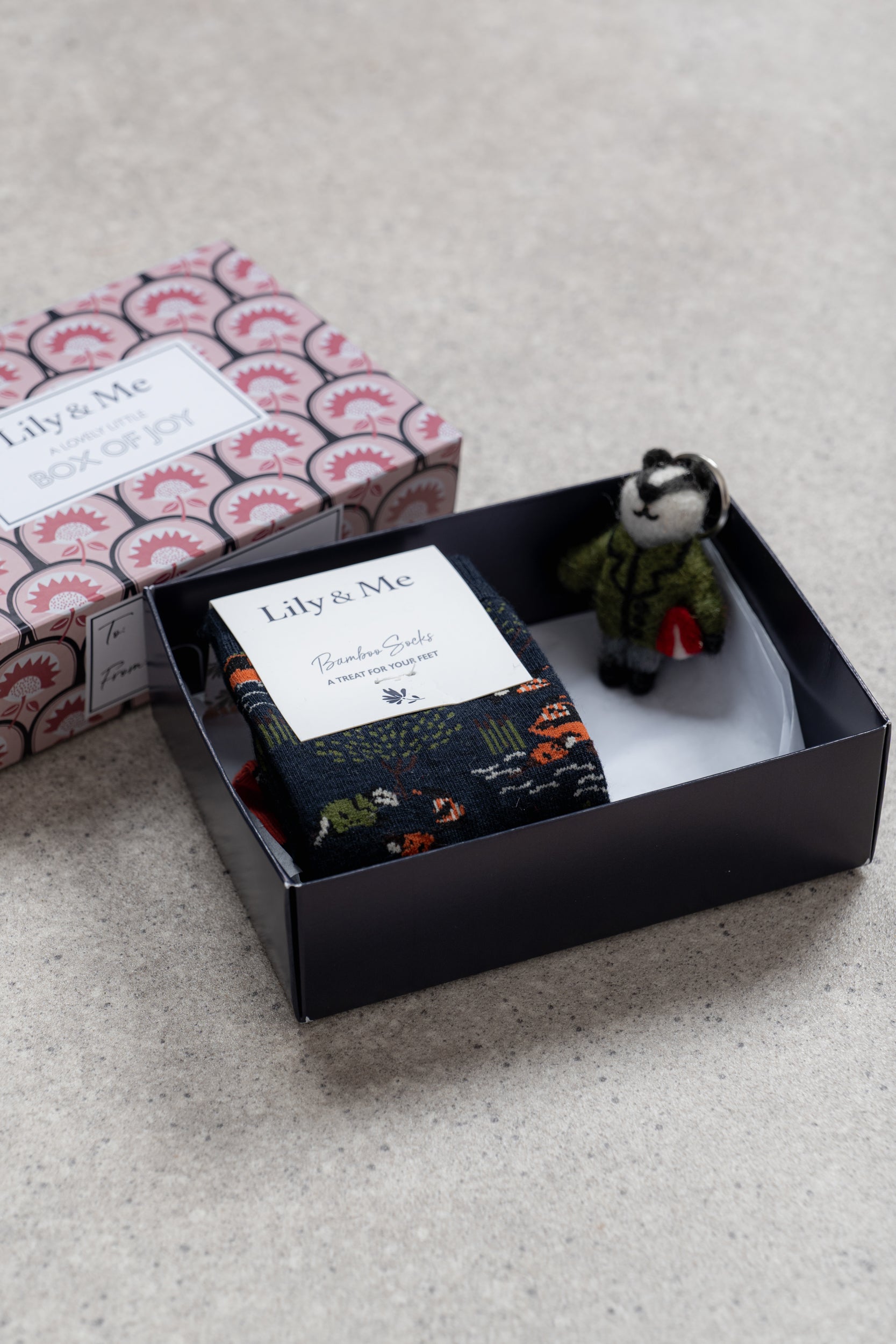 Including a pair of super soft bamboo socks woven in our Storybook print and a quirky Badger Keyring.