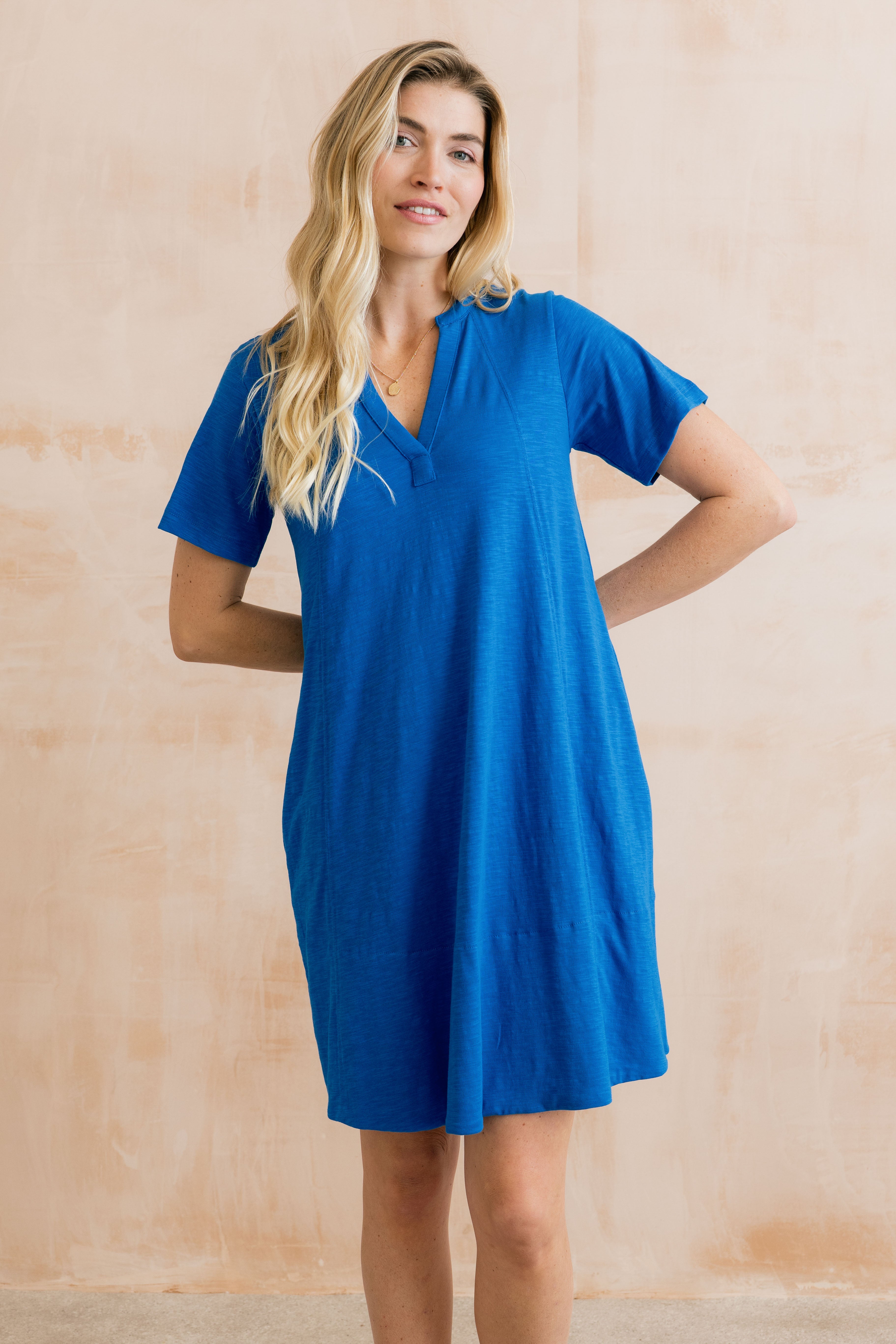 Designed with a flattering v-neckline and mandarin collar. With a relaxed swing silhouette, short sleeves and all important pockets, the Terrace Dress is perfect for sunny days! Pair with your favourite sandals and our printed tote bag for a relaxed holiday look.