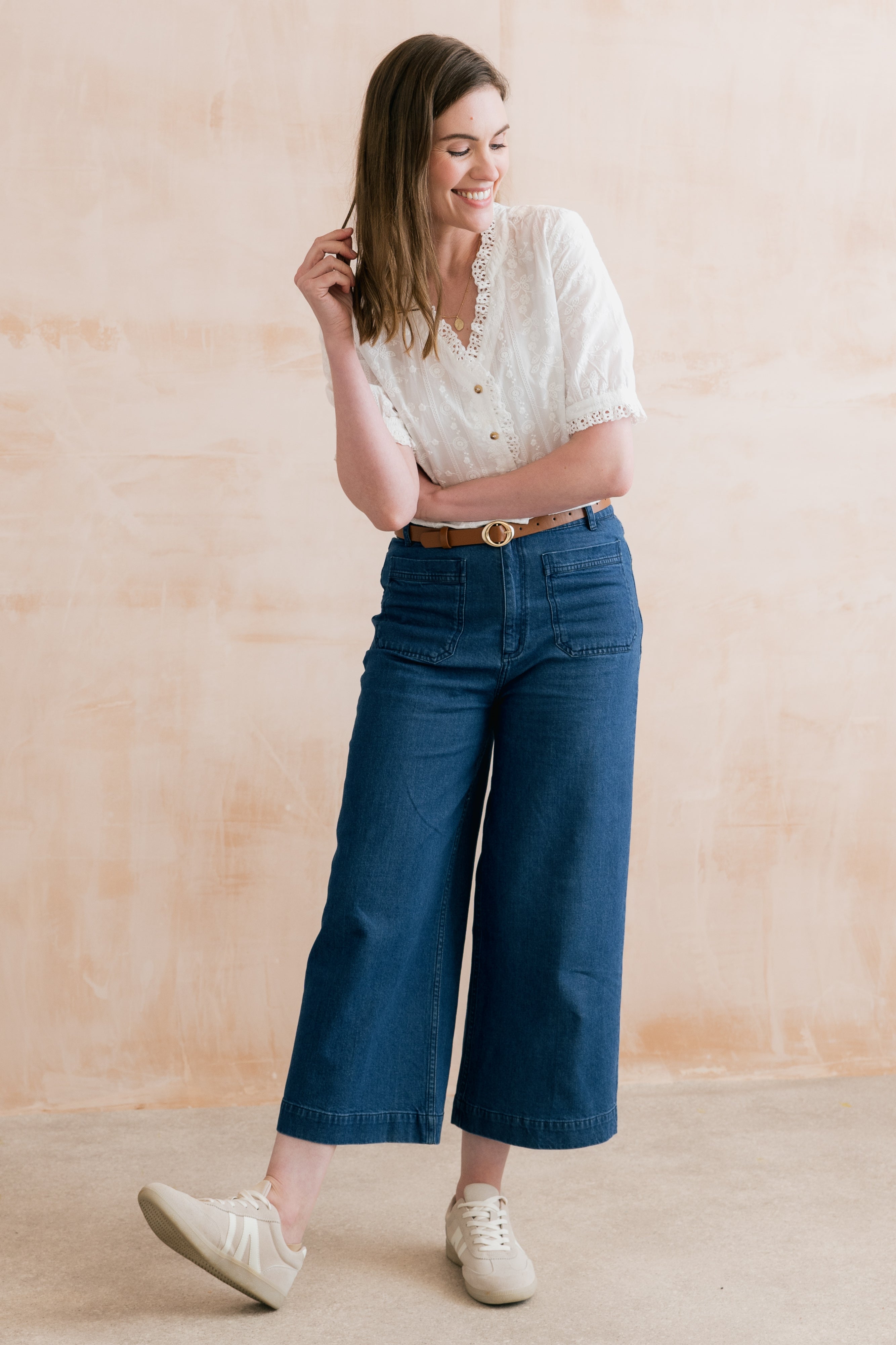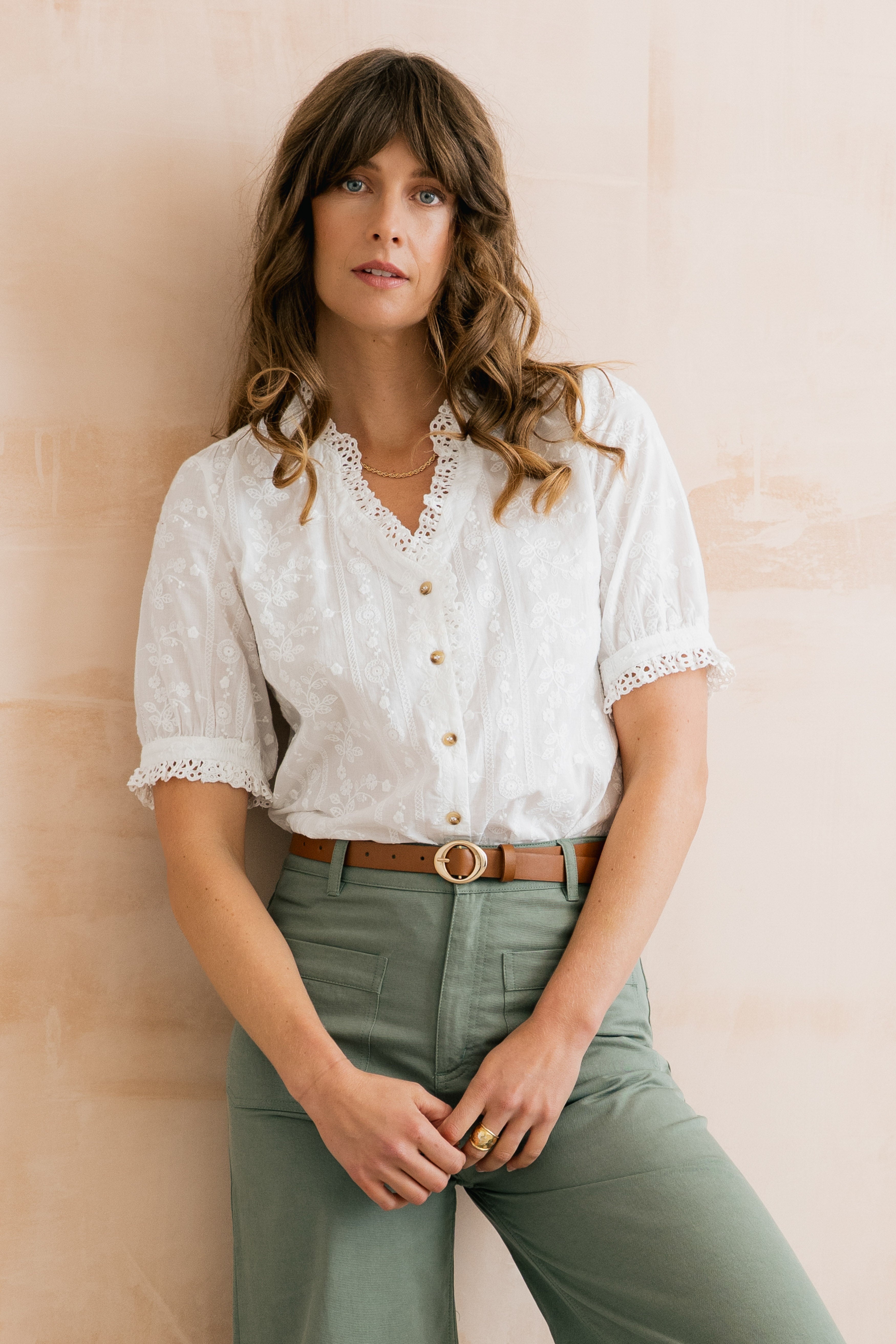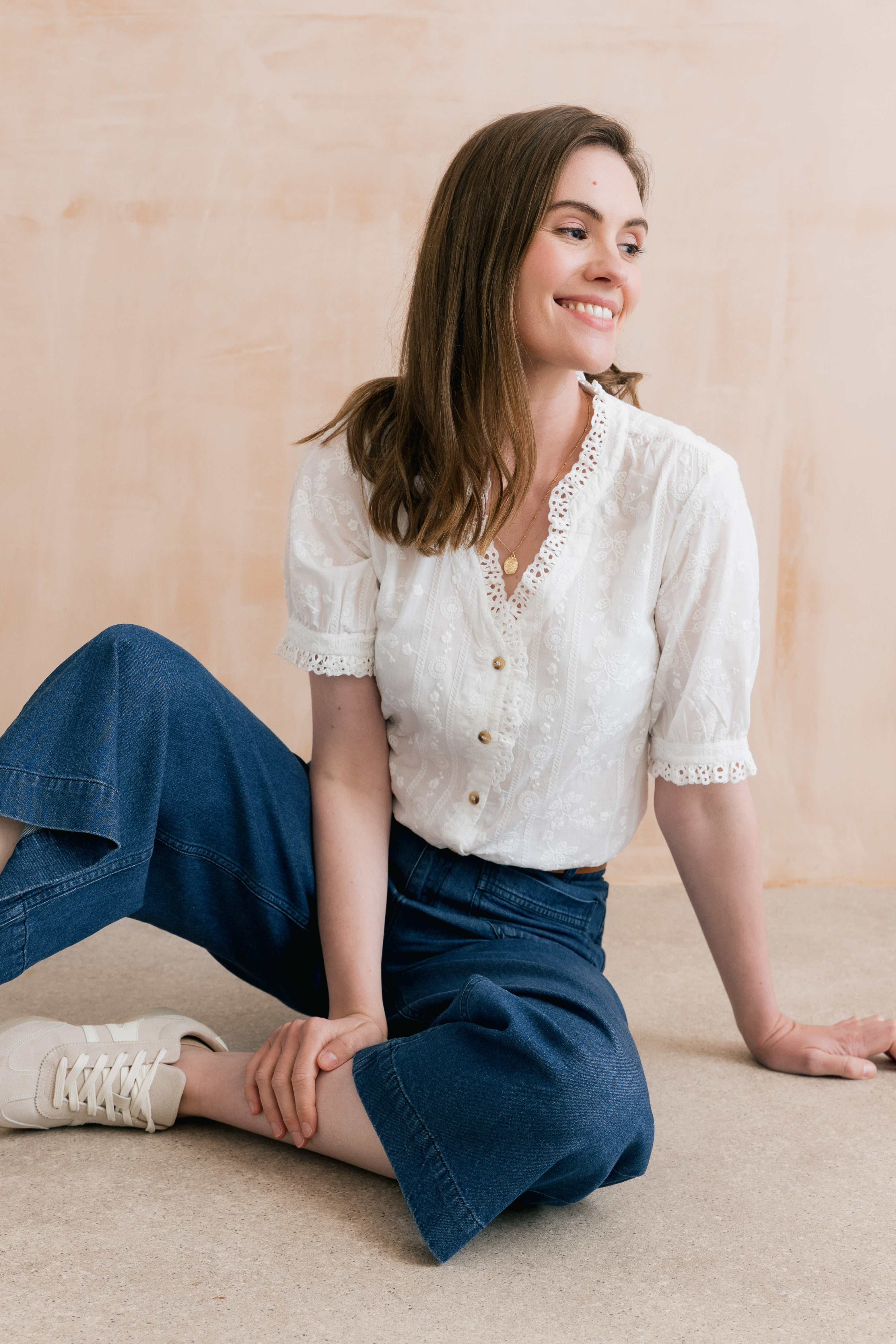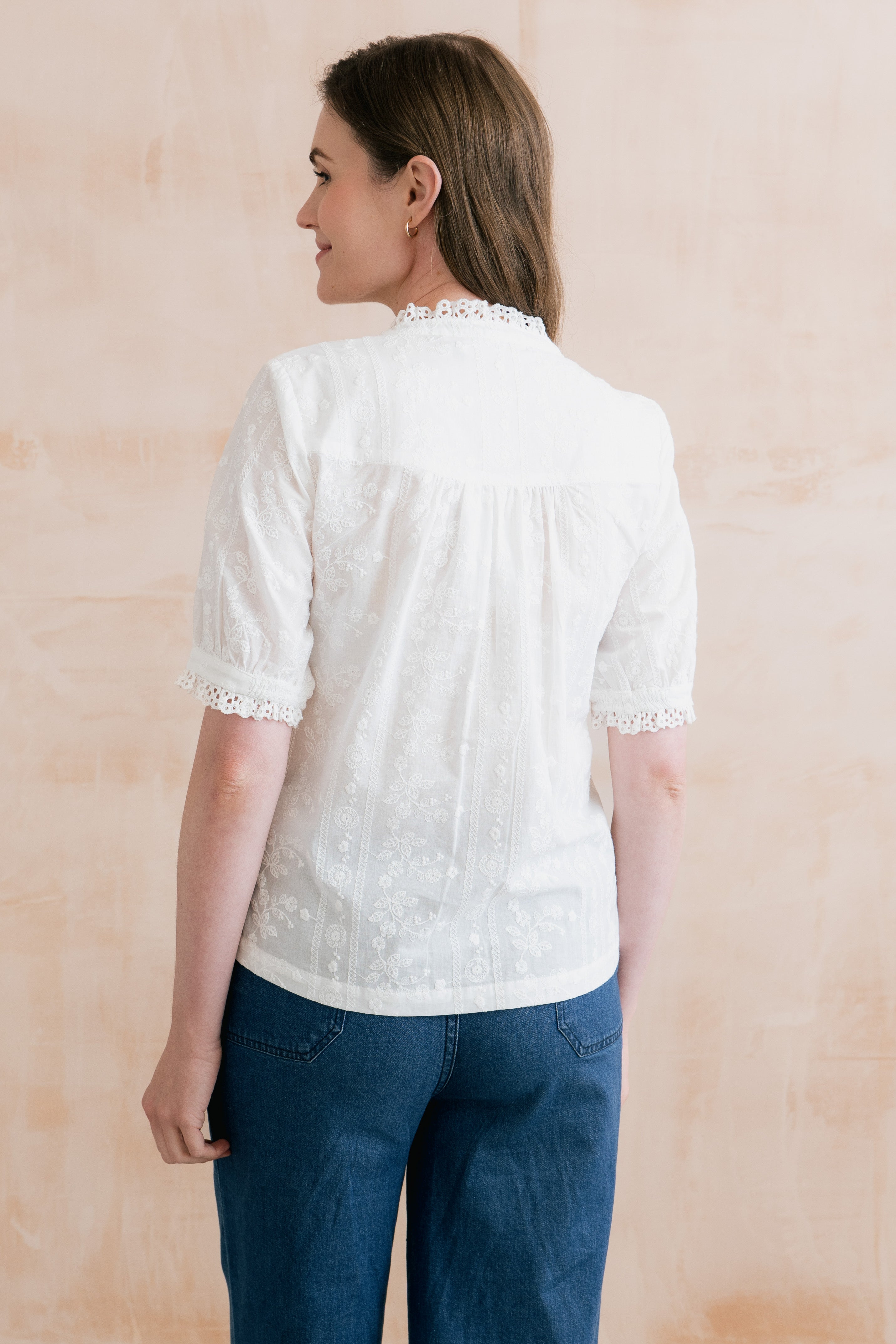 Femininity is at the forefront of our beautiful Wren Frill Blouse. Made from 100% cotton, with a textured woven stripe and floral embroidery. A scalloped lace collar, neckline and sleeve cuff adds delicate detail. Gathering at the back yoke seam, a full button-down front and a curved hem completes this pretty blouse.